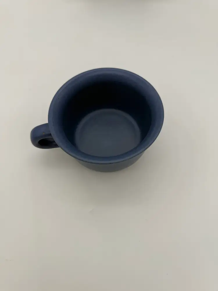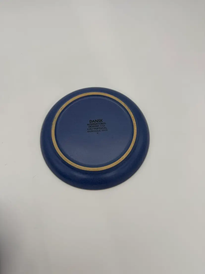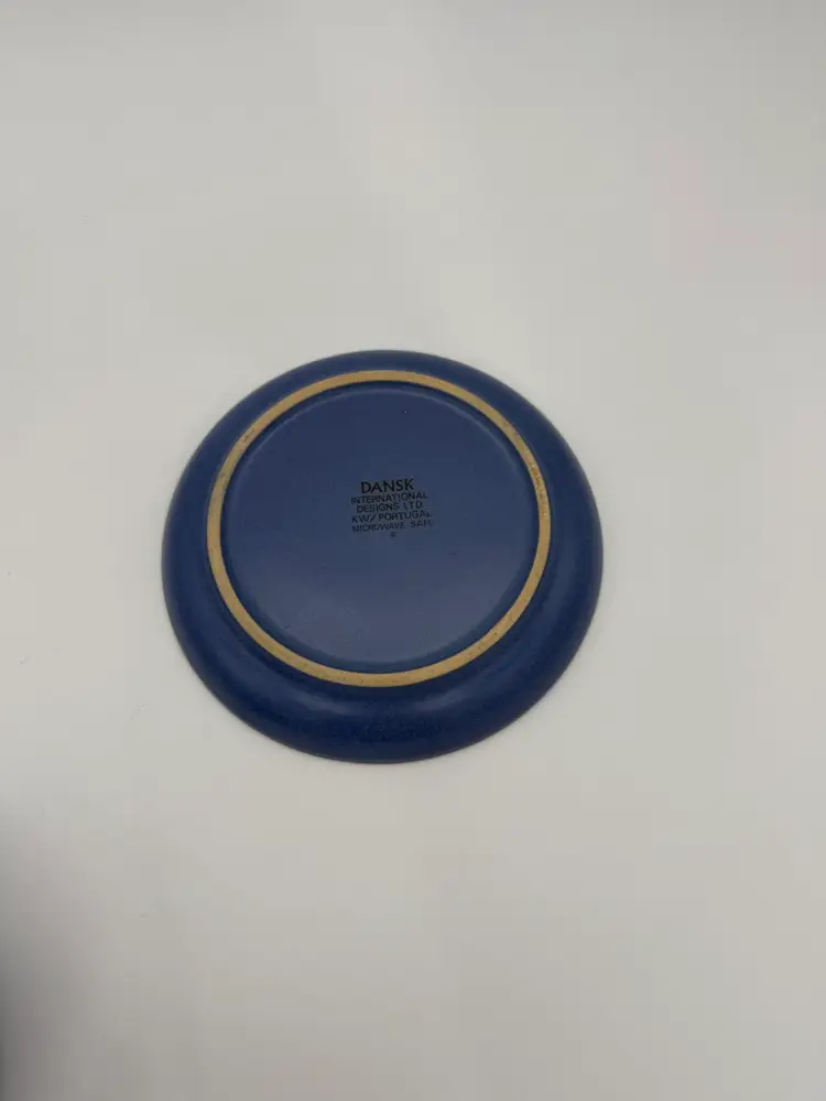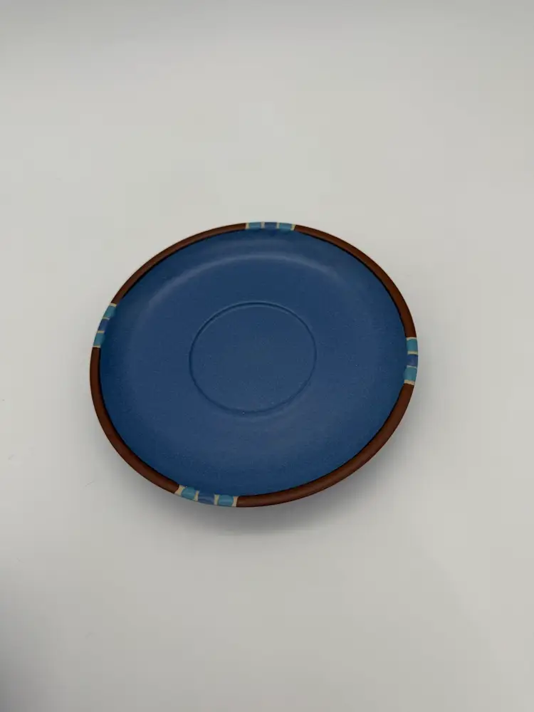 The DANSK International Designs LTD. Mesa Blue Coffee Cup & Saucer Set is a stylish and contemporary two-piece set made of stoneware. With a glossy finish and a capacity of 8 oz, this set features a round shape and decorative South Western design in blue, white, sky blue, and brown colors. The stackable and microwave-safe cups and saucers are a discontinued and retired production from 1990-1999, showcasing an art pottery production style. The set includes a coffee cup and saucer with dimensions of 2.5” and 1” in height, and 4-1/4” and 6.5” in diameter, respectively.
