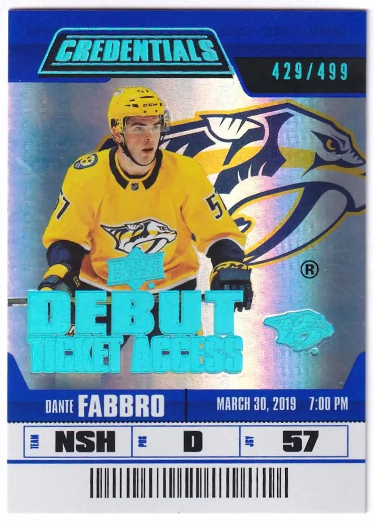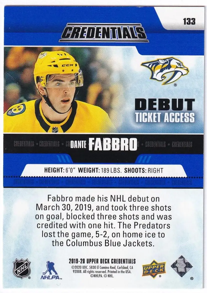 2019-20 Upper Deck Credentials #133 Dante Fabbro RC Nashville Predators Print Run - 499