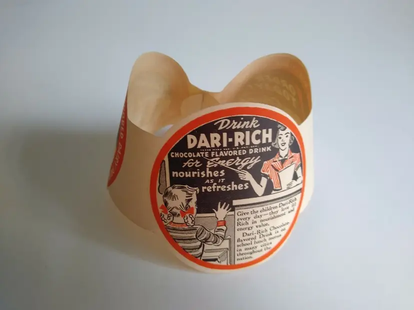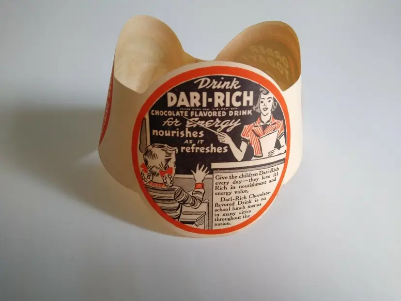 Super cool graphics on this 4" x 2.75" round unused new old stock condition chocolate milk bottle paper collar. Has some age wear to paper and it is out of shape but will looks great once on a old bottle. Inside has tabs that have been attach to make item cone like. Marked on side; N.W. Spot O Gram, Neher Whitehead & Co. See photos.