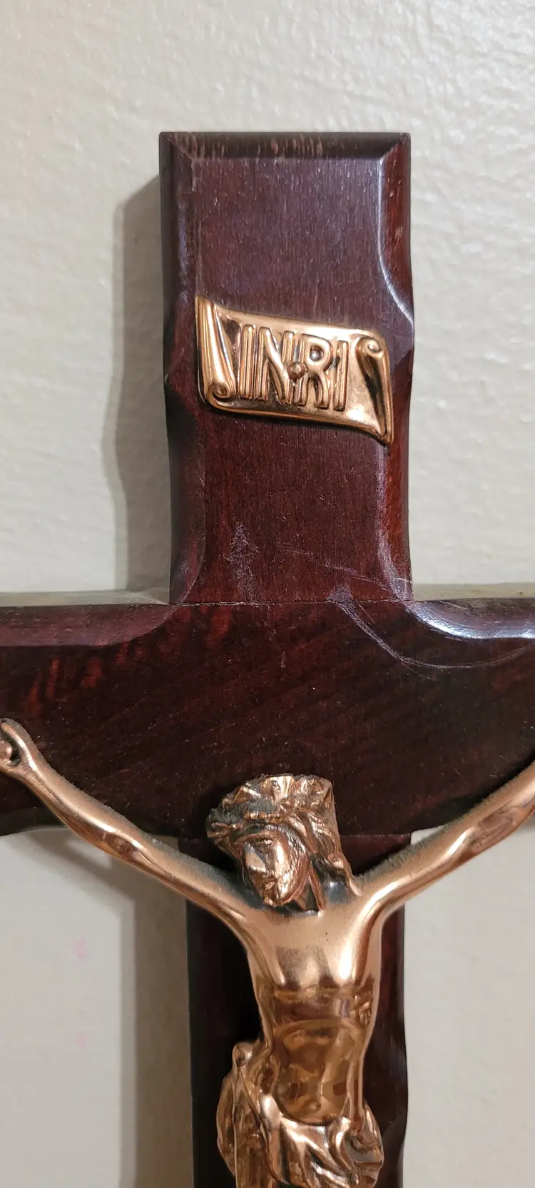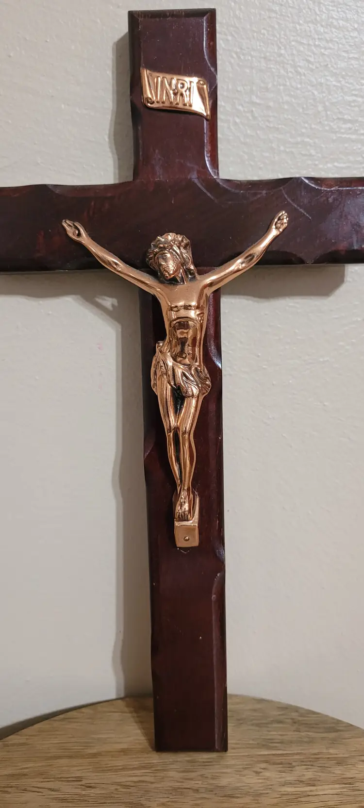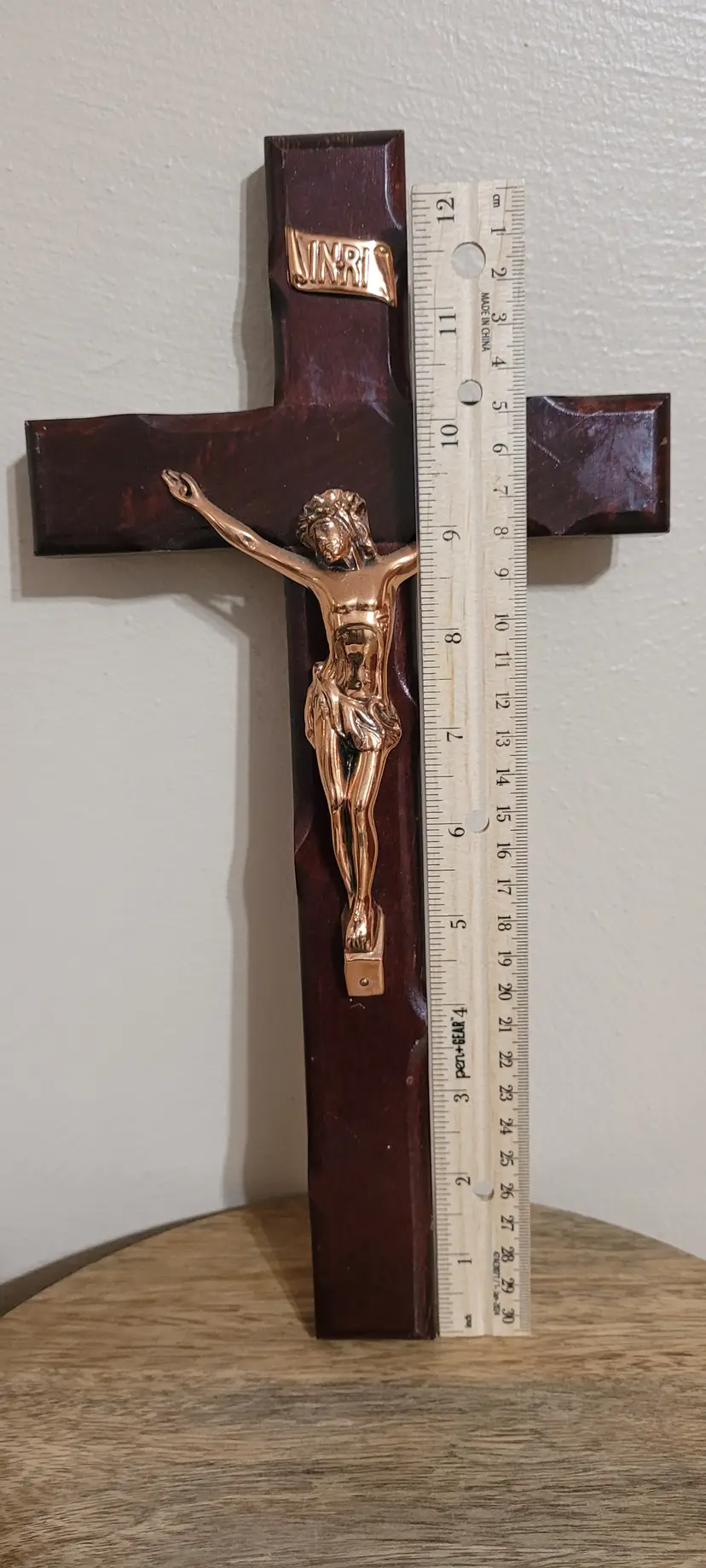 Dark cherry wood and brass crucifix. Some scuffing due to age. Approximately 13 inches tall. Has pre-drilled hole for easy hanging.
