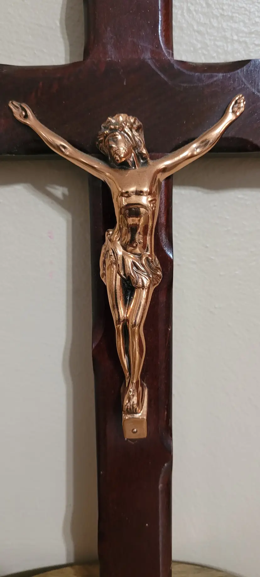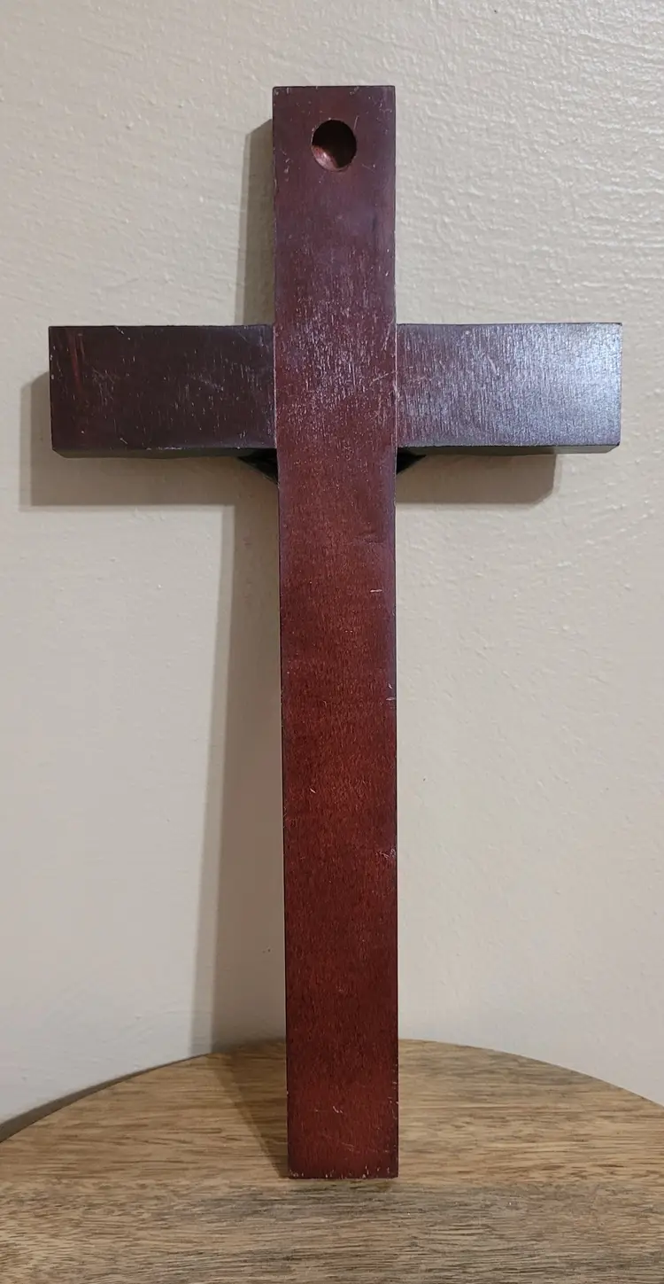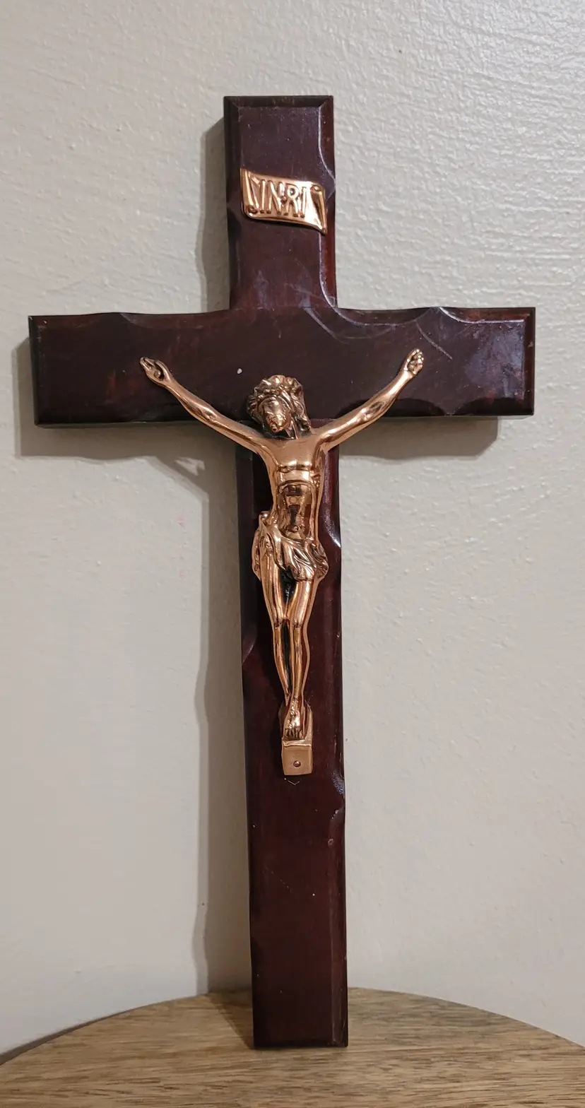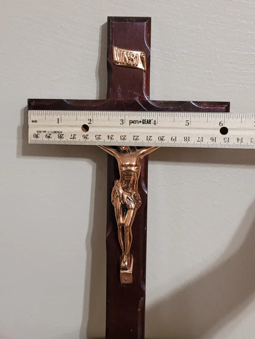 Dark cherry wood and brass crucifix. Some scuffing due to age. Approximately 13 inches tall. Has pre-drilled hole for easy hanging.