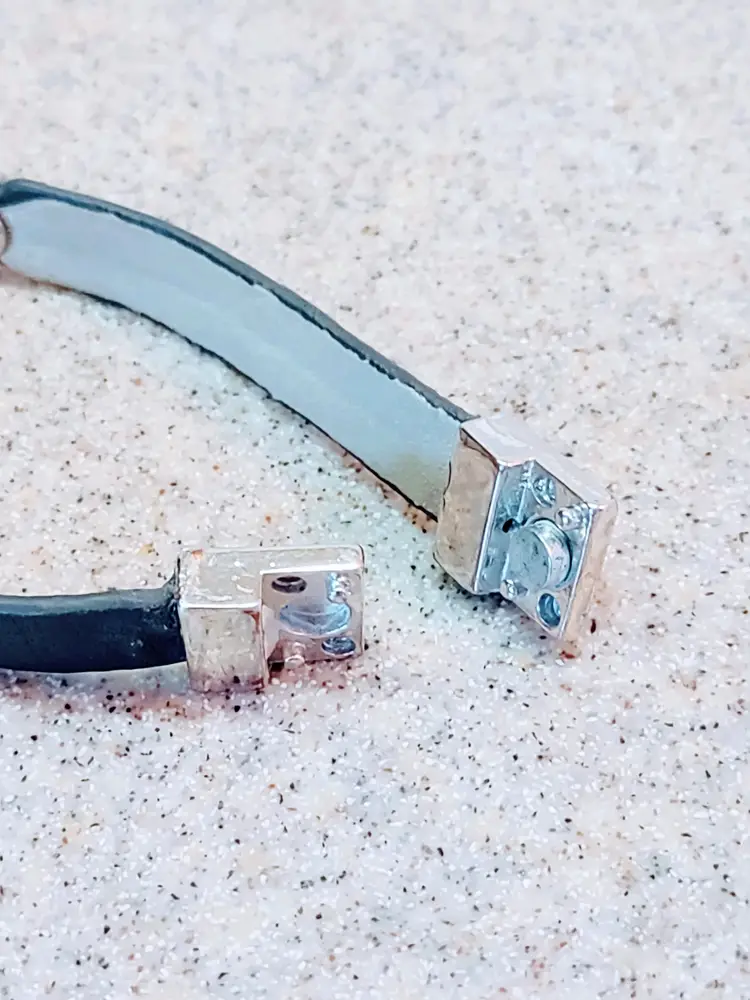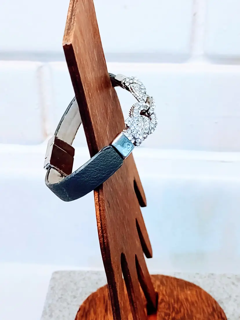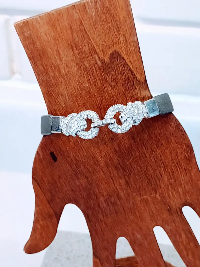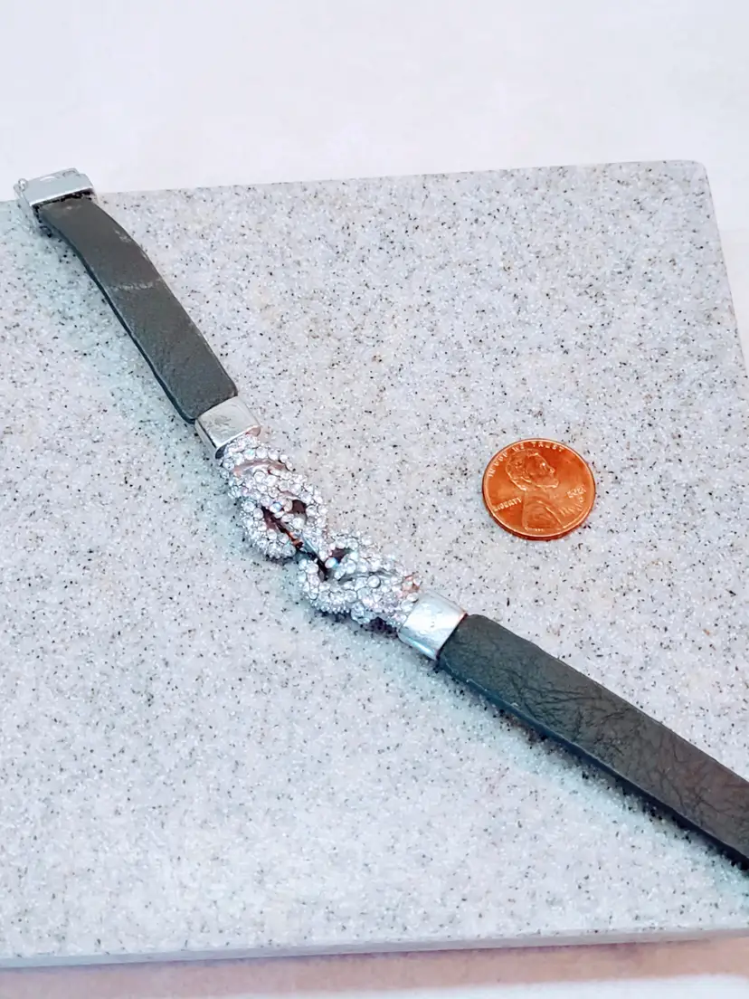 This Dark Gray Leather Band Rhinestone Magnetic Closure Bracelet is a stylish and elegant accessory perfect for a birthday occasion. Made with stainless steel and featuring a unique asymmetrical shape, this bracelet showcases 55 white/colorless glass rhinestones for a touch of beauty and classic flair. The magnetic closure ensures easy wearing and a secure fit, while the nickel-free design is safe for sensitive wearers. Ideal for those looking for a band-style bracelet with a modern twist, this piece is sure to add a finishing touch to any outfit.