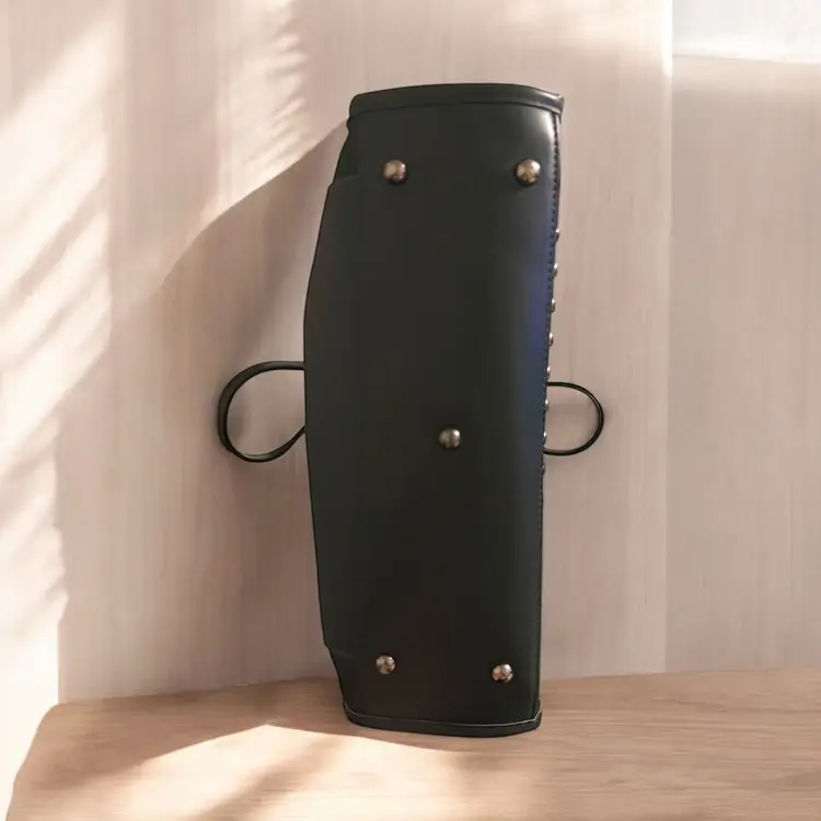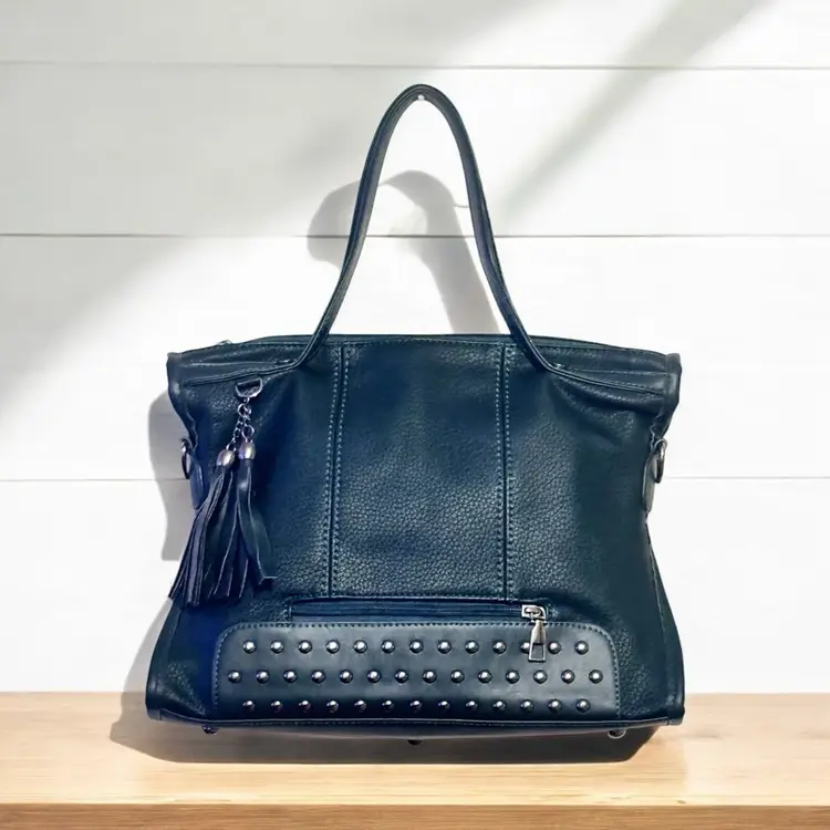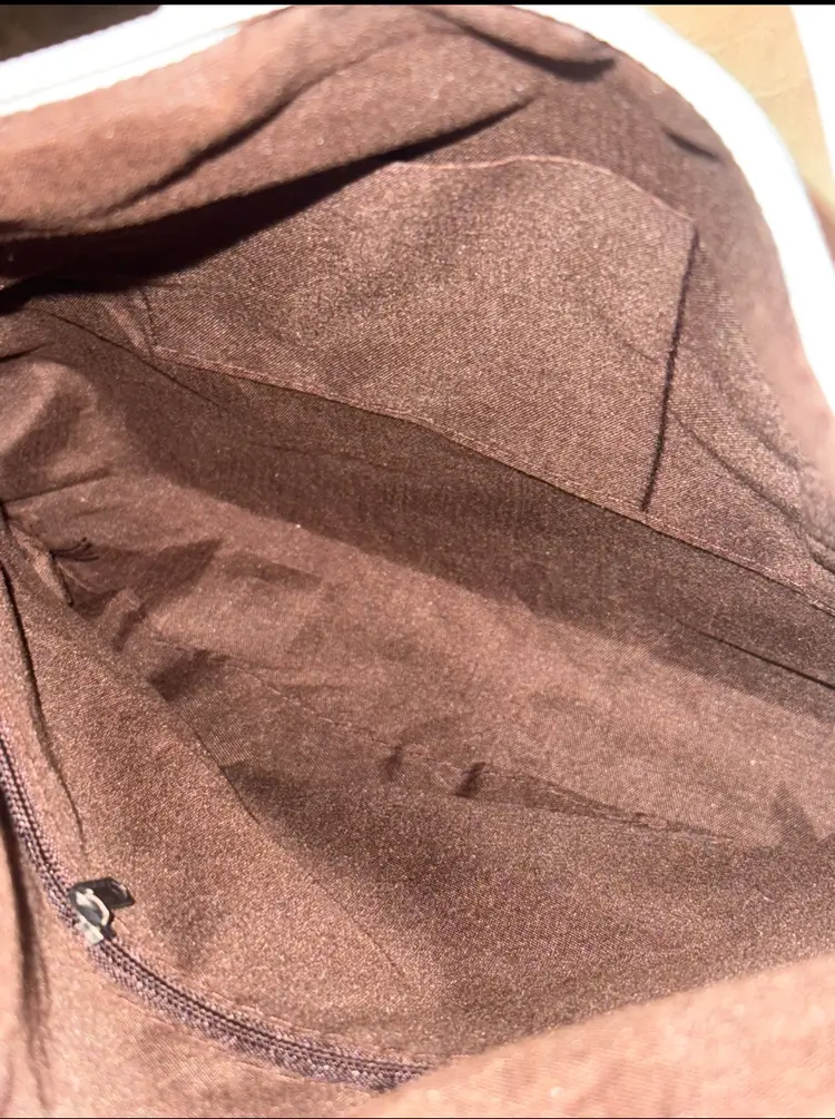 Strap can extend for crossbody wear Vegan leather 13 by 10 by 4 inches Brown interior Two pockets and one zipper pocket on the inside.