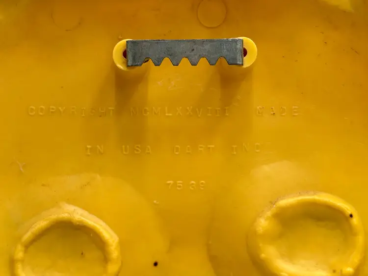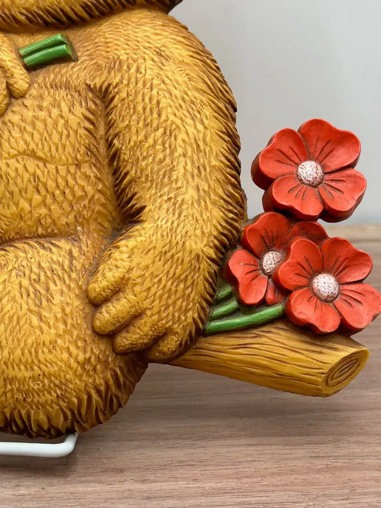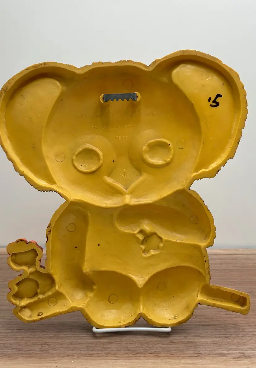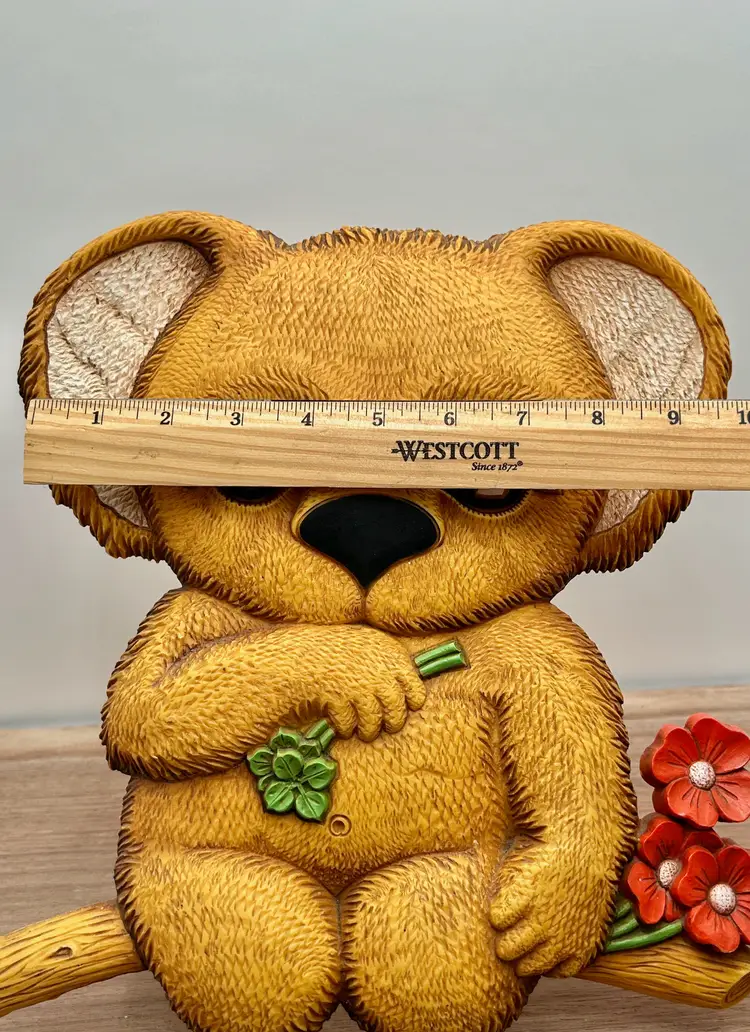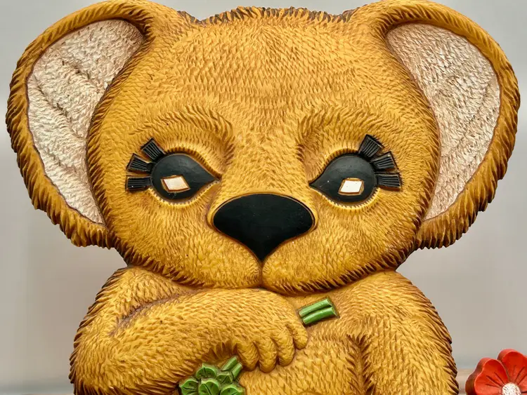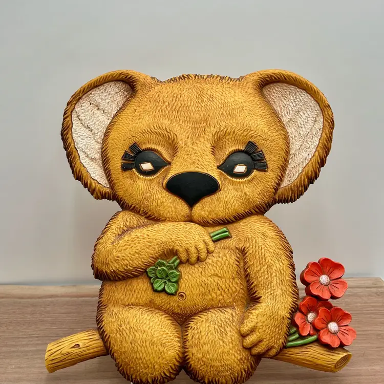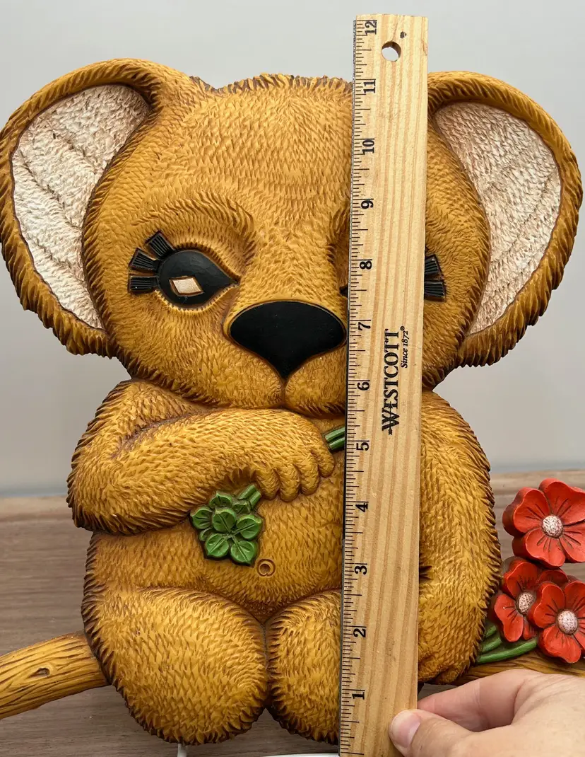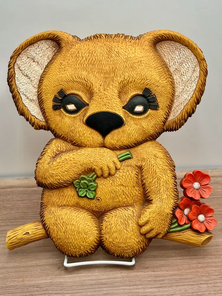 Sometimes things are bought just because it is just too cute to leave behind and this vintage wall hanging was one. This kitschy Koala is adorable with its long lashes and pretty bouquets of flowers. It is a vintage acrylic wall hanging done by Dart Inc and made in the USA as stamped on the back. The koala is about 11 ½ inches tall and almost 10 inches wide from ear to ear. He is still a bit dirty even after a good go over with the wipes and we didn’t pay .50 but can’t get that old price off either. Other than that he has no chips or cracks.