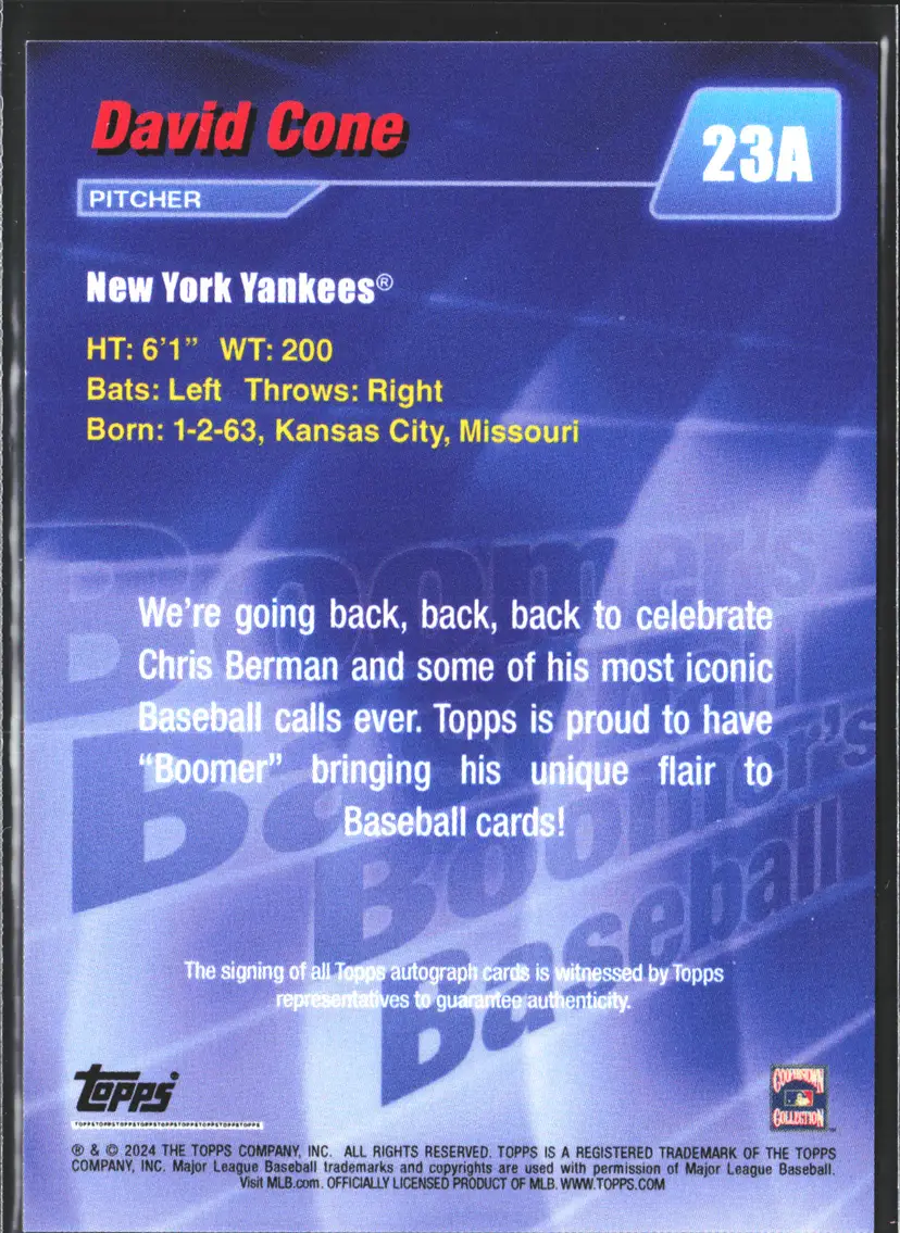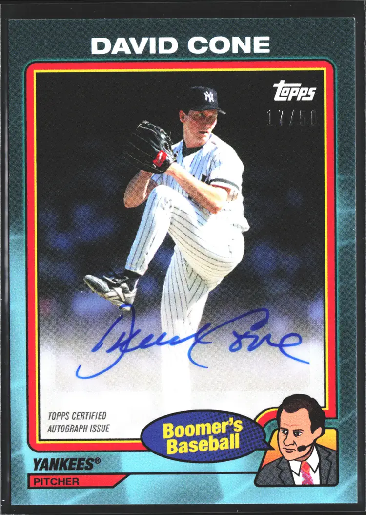 1st time buyer? Get $5 Off with code DISTRICT5 at checkout! Card as shown. All cards $20 and under ship PWE via lettertrackpro [https://www.letter-track.com/registerap.asp?AFID=8757] Type: Sports Trading Card Sport: Baseball Set: 2024 Topps Chris Berman Boomer's Baseball Features: Parallel/Variety Season: 2024 Parallel/Variety: Teal Player/Athlete: David Cone League: Major League (MLB) Year Manufactured: 2024 Original/Licensed Reprint: Original Vintage: No Graded: No Manufacturer: Topps Country/Region of Manufacture: United States Autographed: Yes Team: New York Yankees Signed By: David Cone Autograph Authentication: Topps