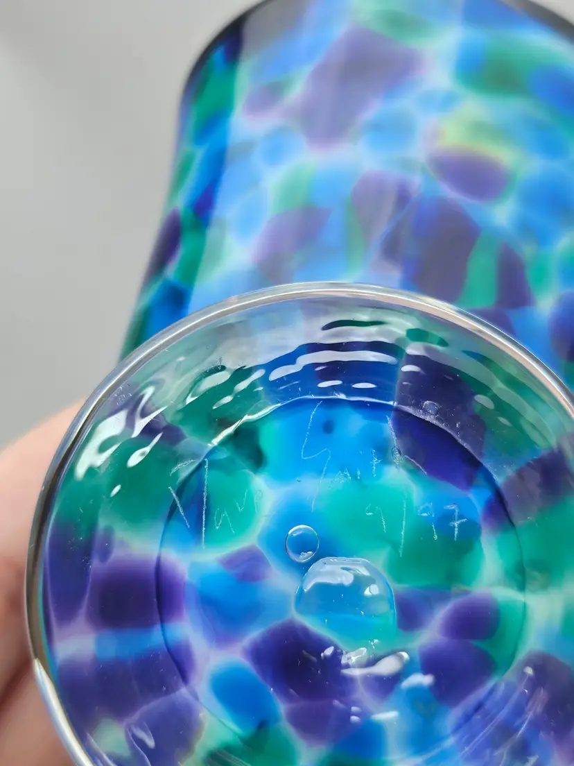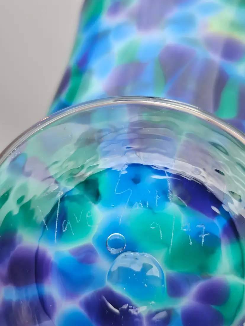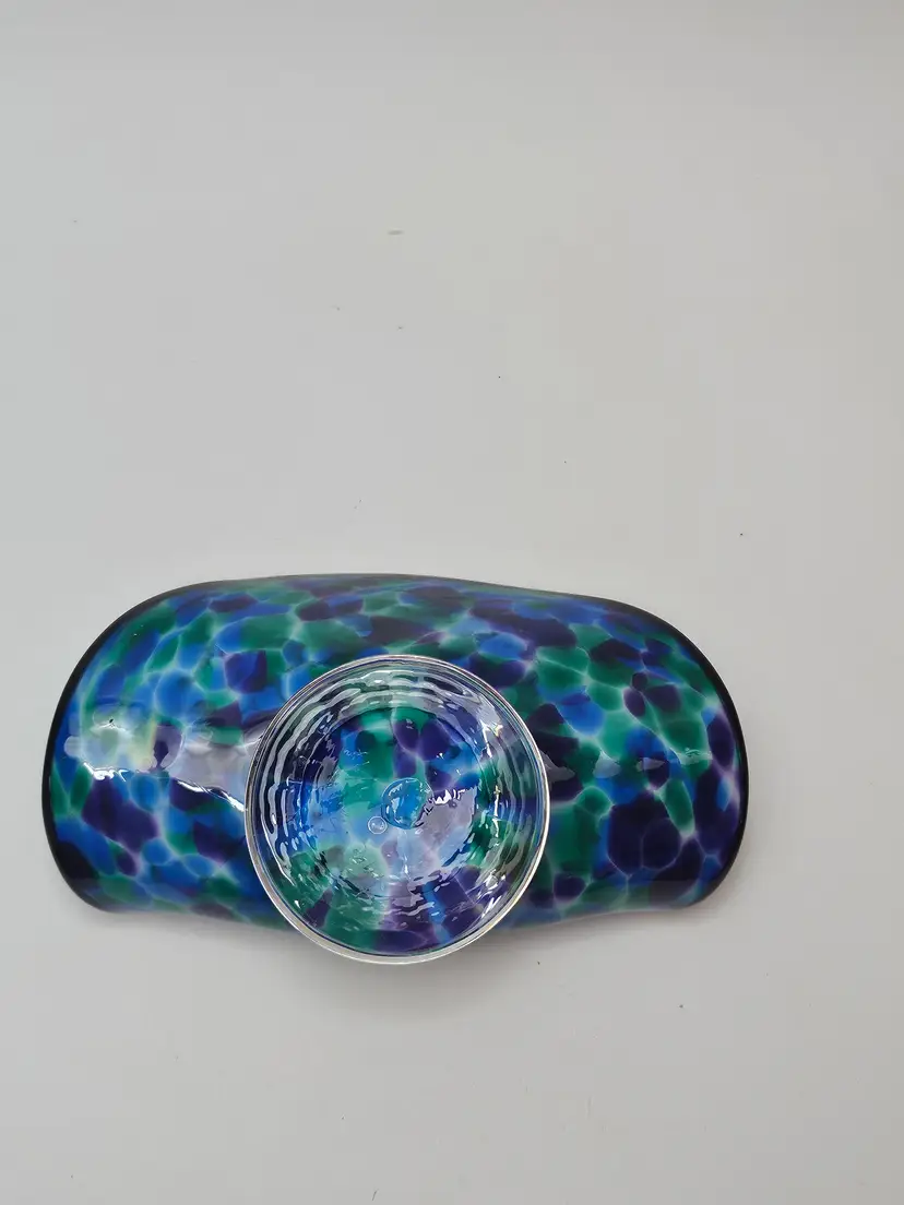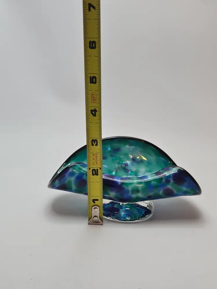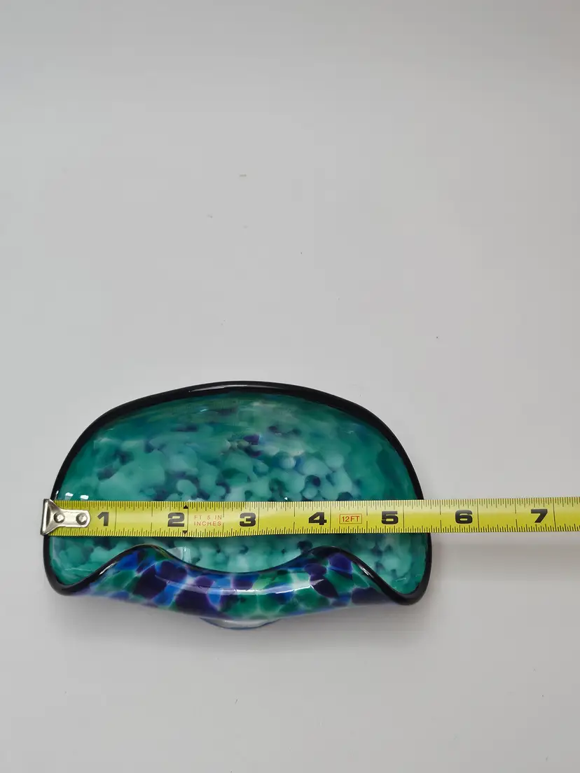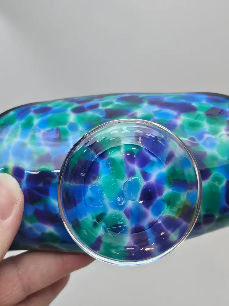 The David "Dave" Smith "Blowing Sands" art glass blue and green confetti card holder is an original, handcrafted piece of abstract art glass. Made in the United States, this glossy finished glass business card holder features a unique design. The vibrant multicolor confetti adds a playful touch to any workspace or desk, showcasing the artist's signature style and craftsmanship. Perfect for collectors or those looking to add a touch of artistic flair to their office space.