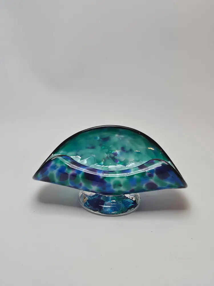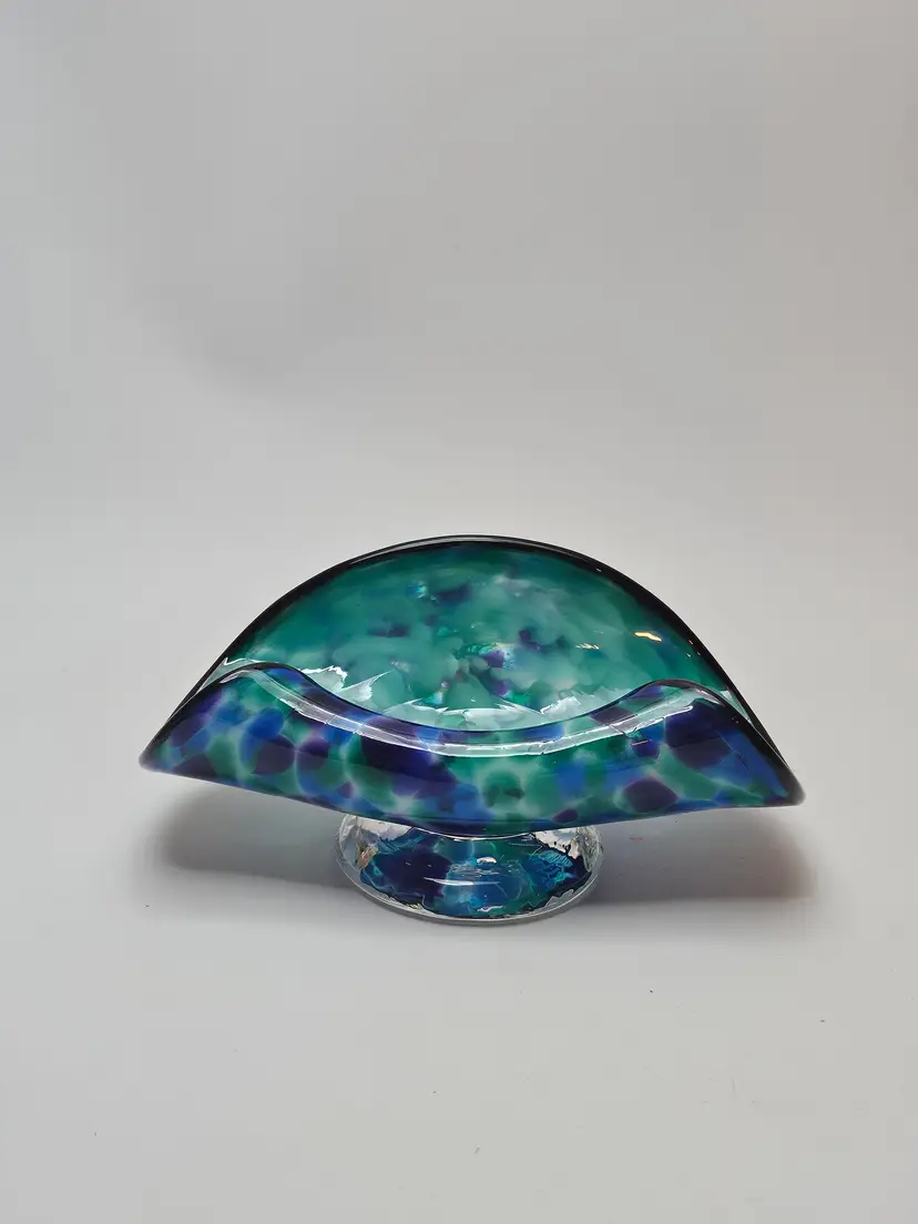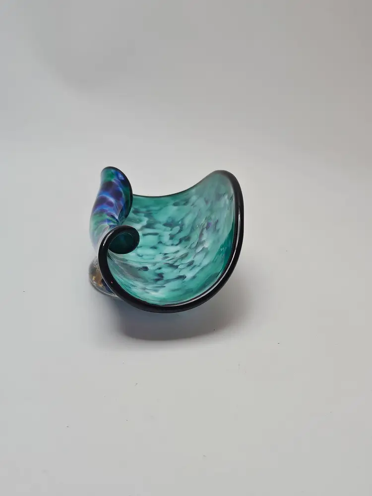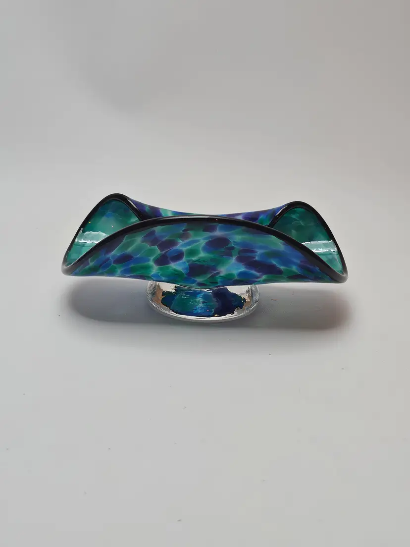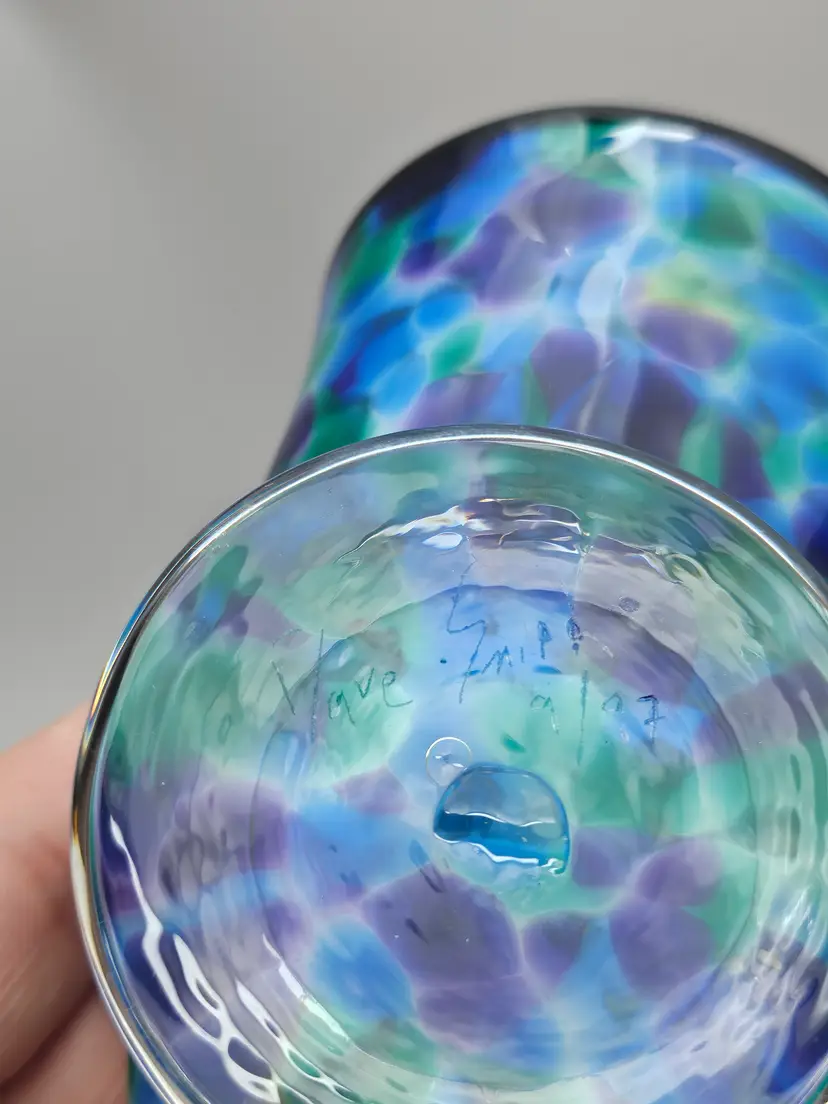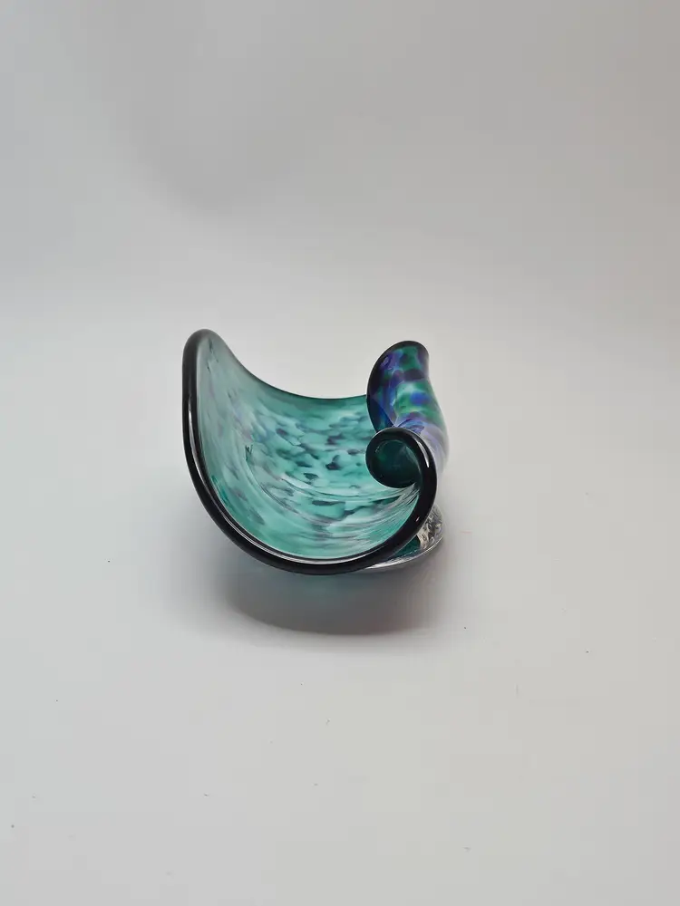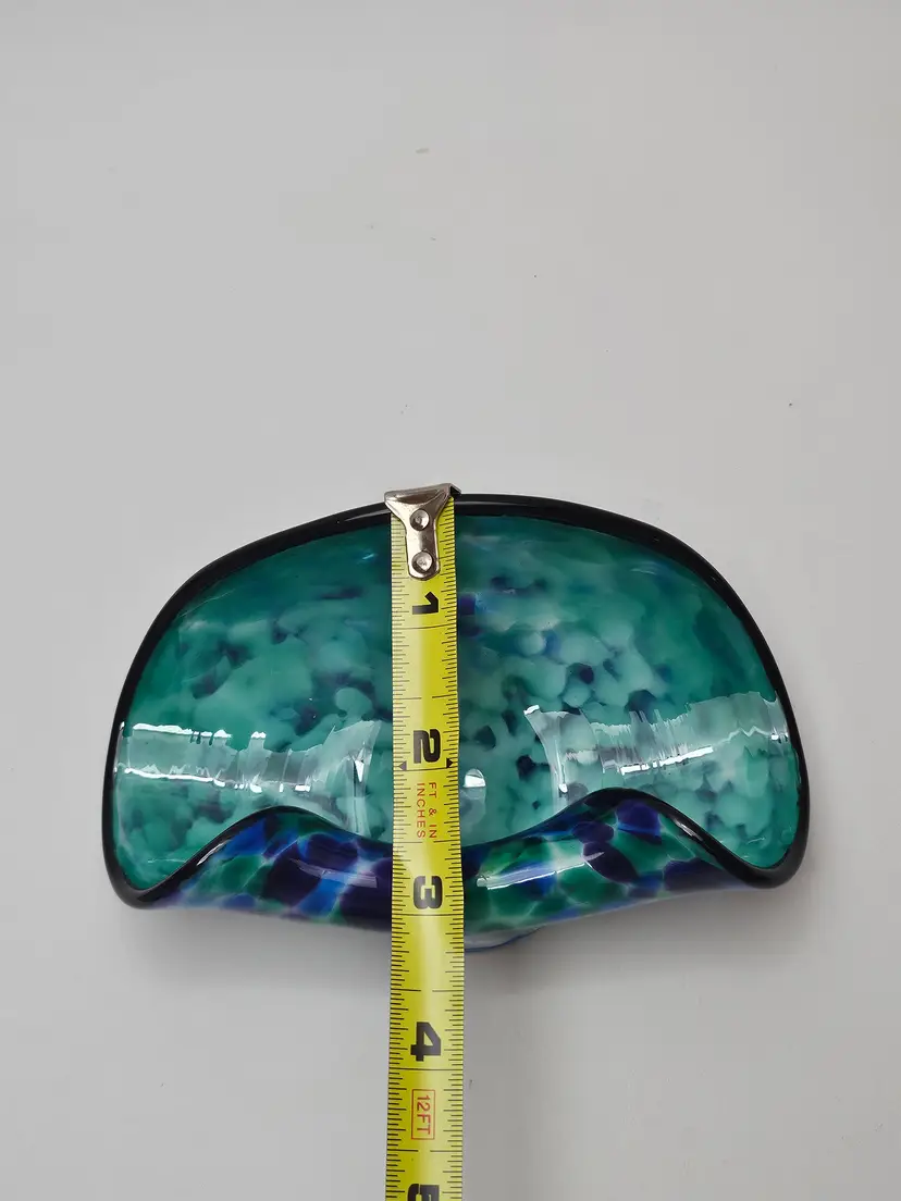 The David "Dave" Smith "Blowing Sands" art glass blue and green confetti card holder is an original, handcrafted piece of abstract art glass. Made in the United States, this glossy finished glass business card holder features a unique design. The vibrant multicolor confetti adds a playful touch to any workspace or desk, showcasing the artist's signature style and craftsmanship. Perfect for collectors or those looking to add a touch of artistic flair to their office space.