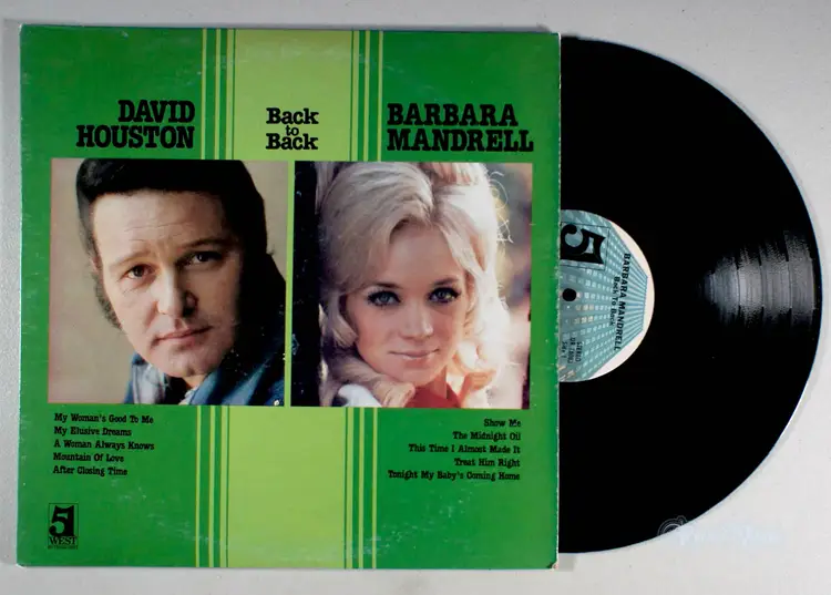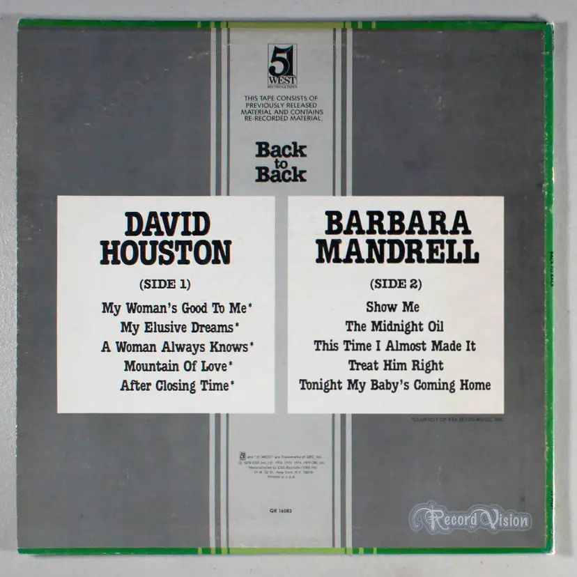 Back to Back, by David Houston and Barbara Mandrell, is a mash-up of sorts featuring five Hits by Houston on side 1 and Mandrell on side 2. All the songs on the album charted within the Top 20 on the country charts.