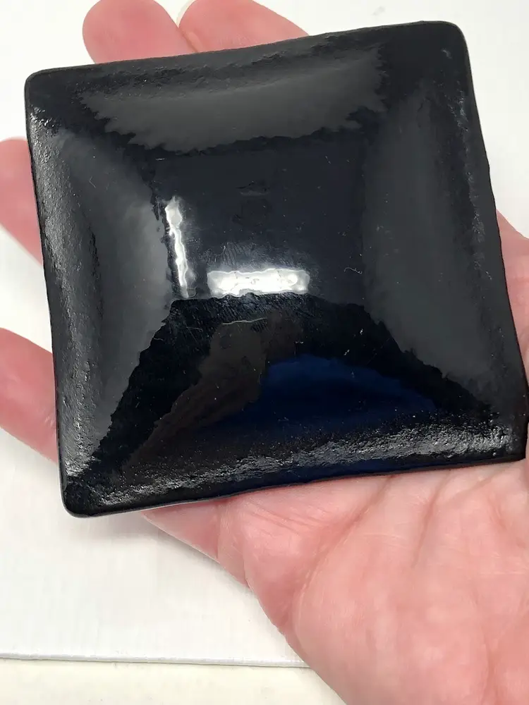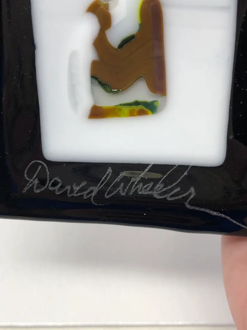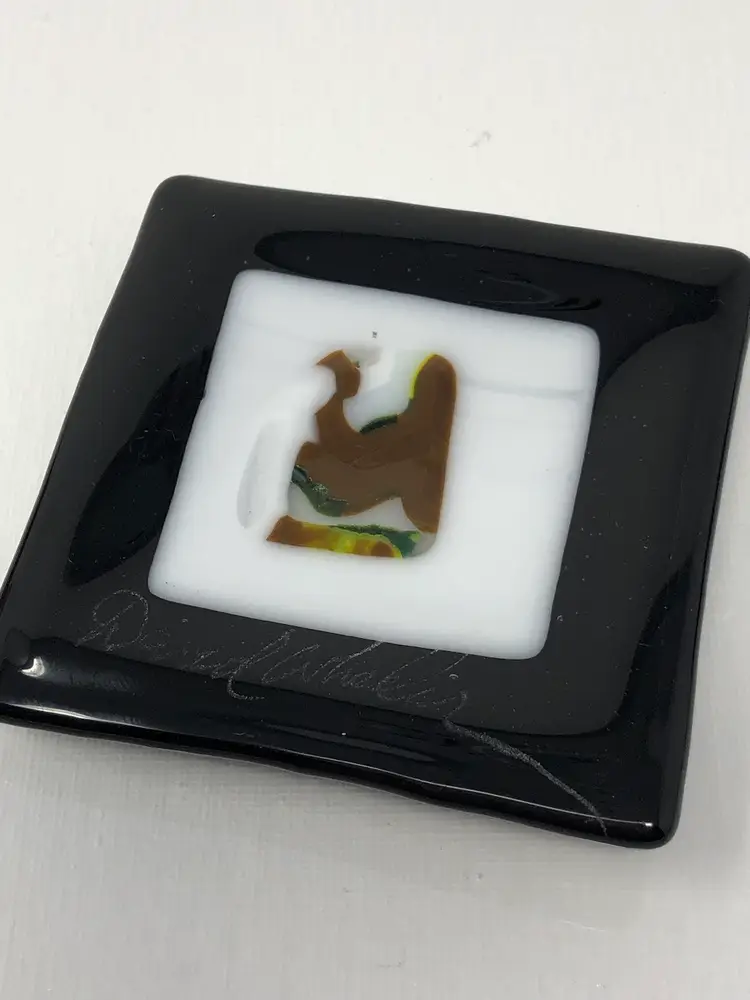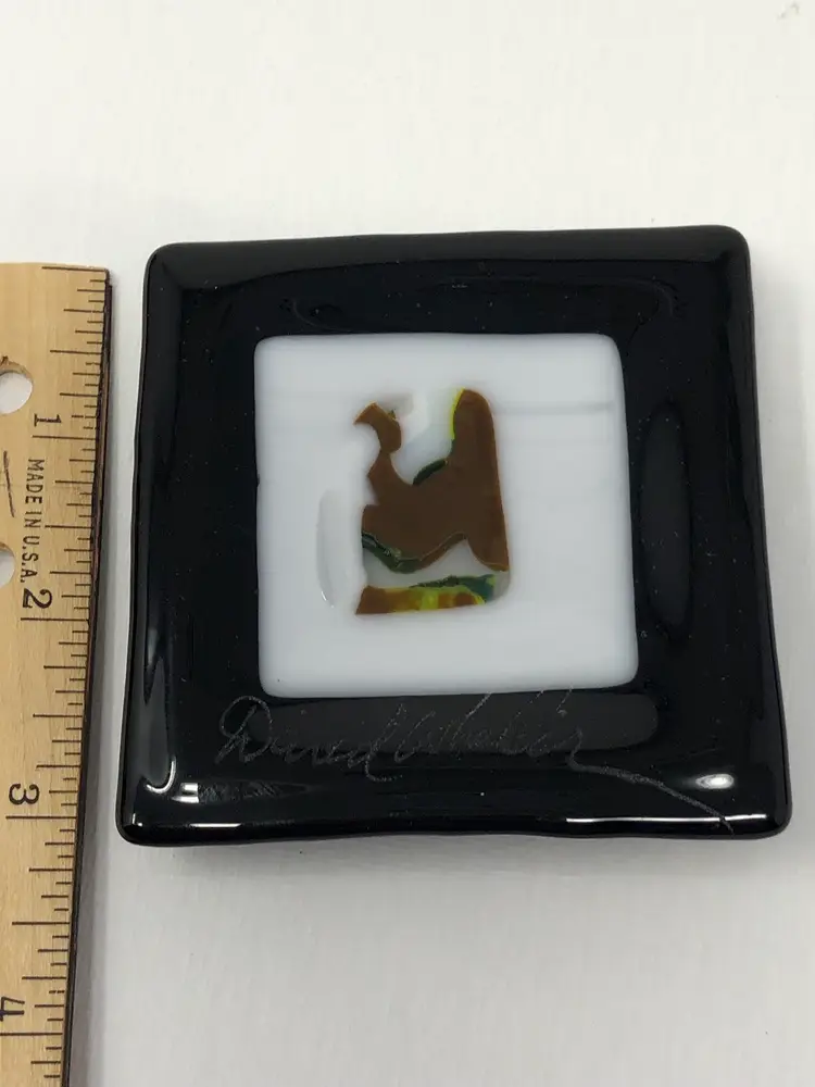 3" square fused art glass. Black and white with mixed color center. Signed by artist, no chips or cracks.