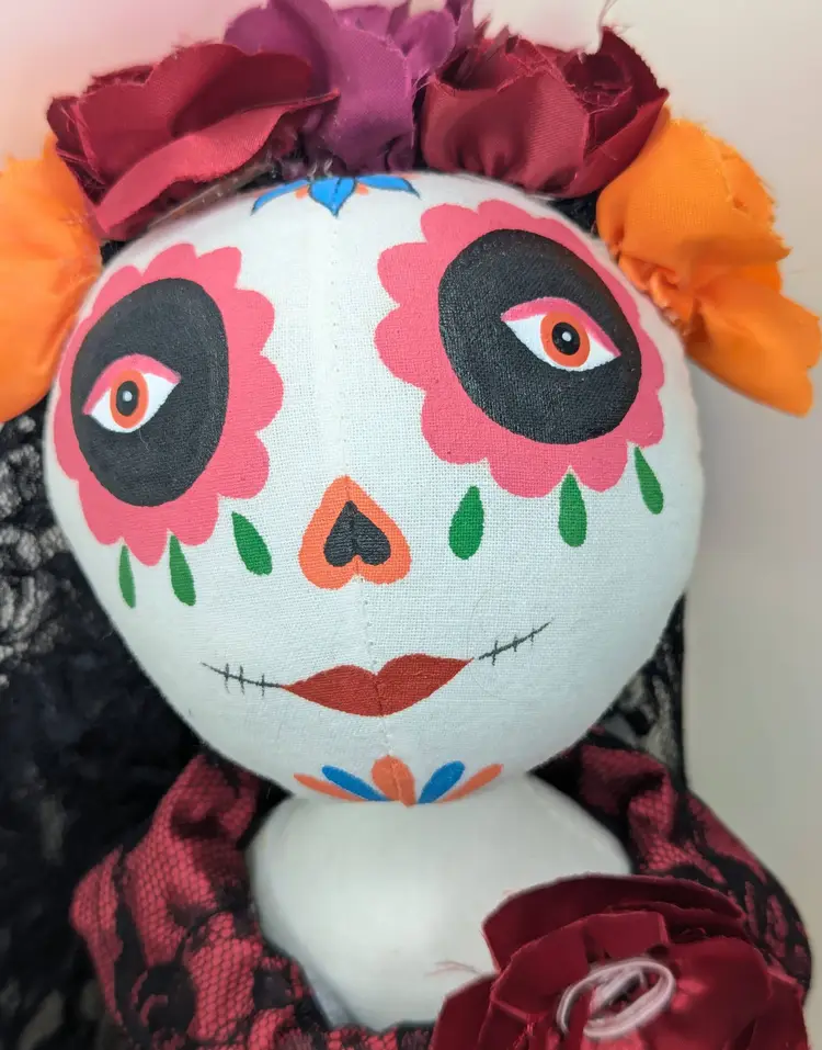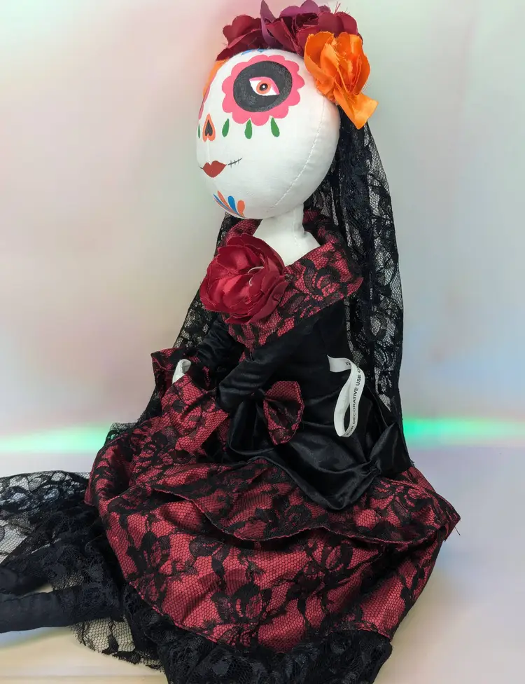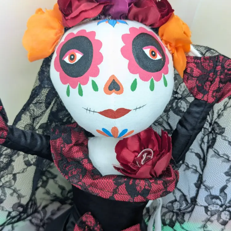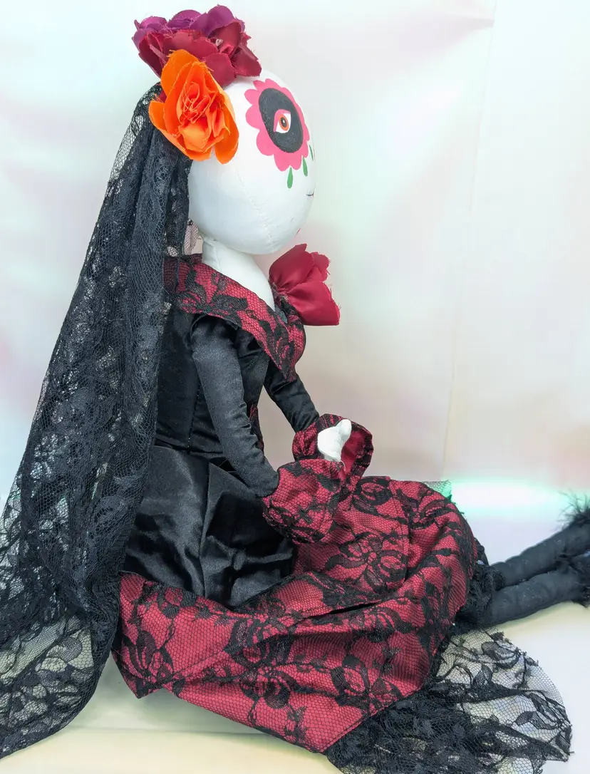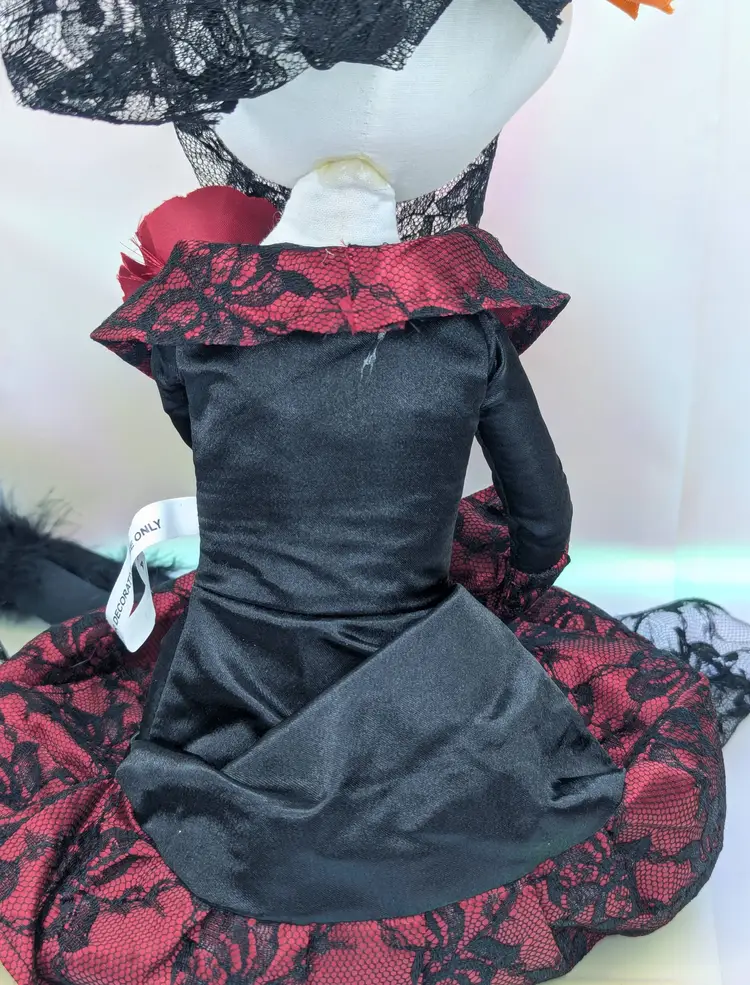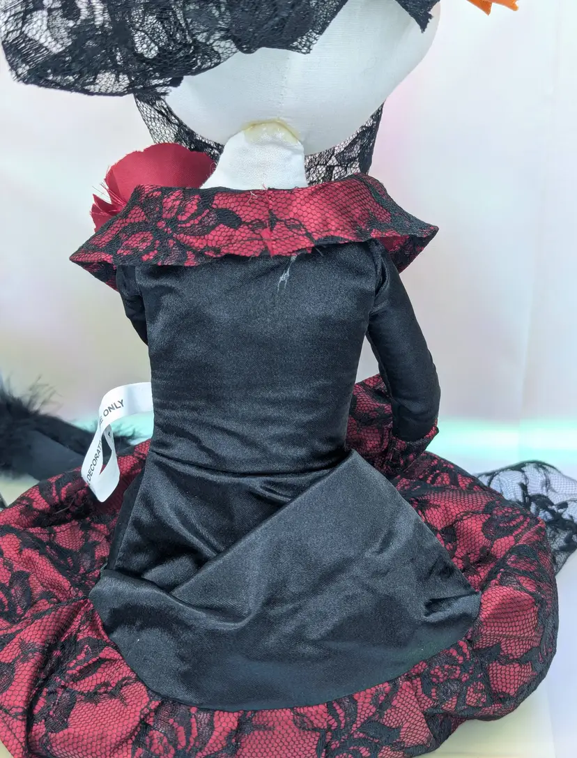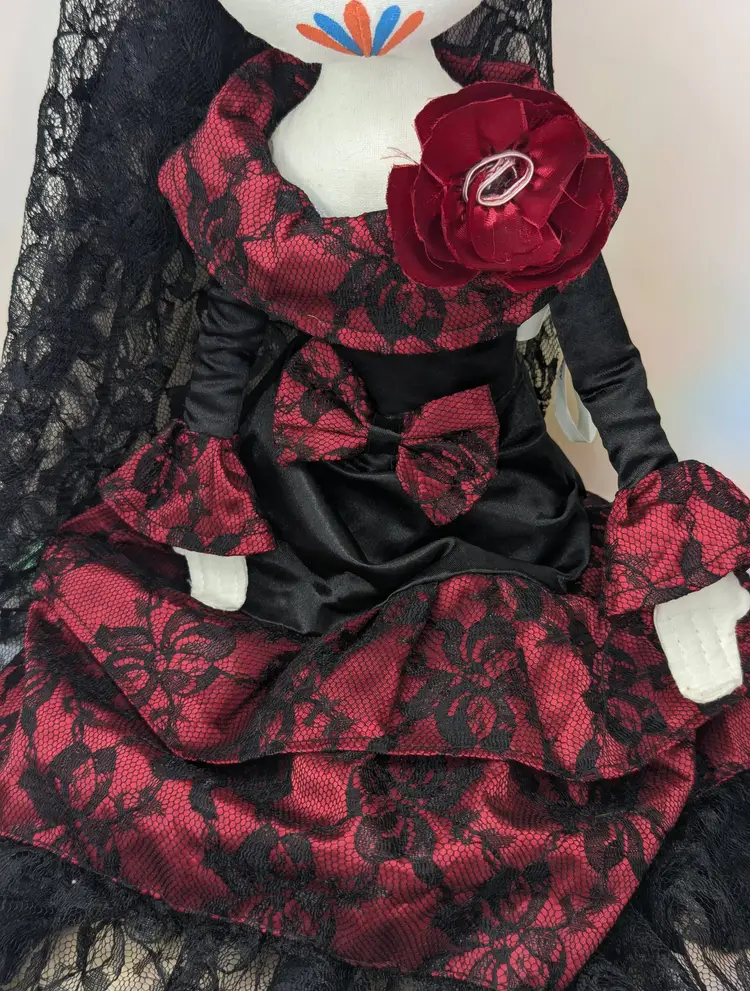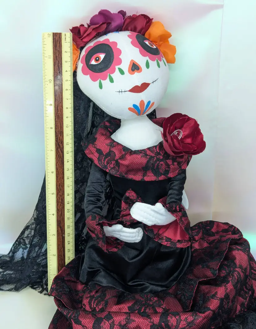 Day Of the Dead - Dia de los Muertos Sugar Skull Catrina Cloth Doll weighted Shelf Sitter in Red & black lace dress with flowers and black lace veil. This doll is in good condition, the only issue i saw was the flower on the dress looks like it might be missing the middle of the flower, other wise no rips, tears, holes or stains. Doll is 12" sitting and full length of 24" Wired poseable arms Unbranded, no markings or tags of maker - NOT A TOY She is weighted so that she will sit up. Doll is for display/decor /decorative use only. Not for children or play Item comes from a smoke free, pet friendly home.