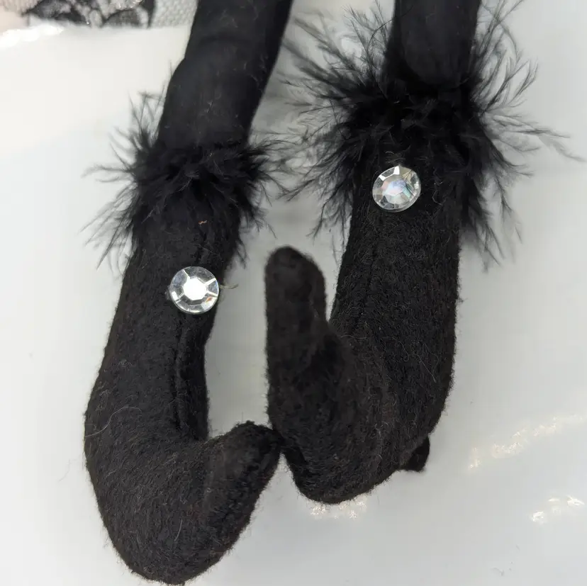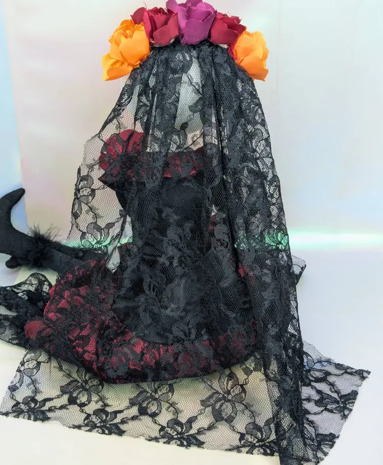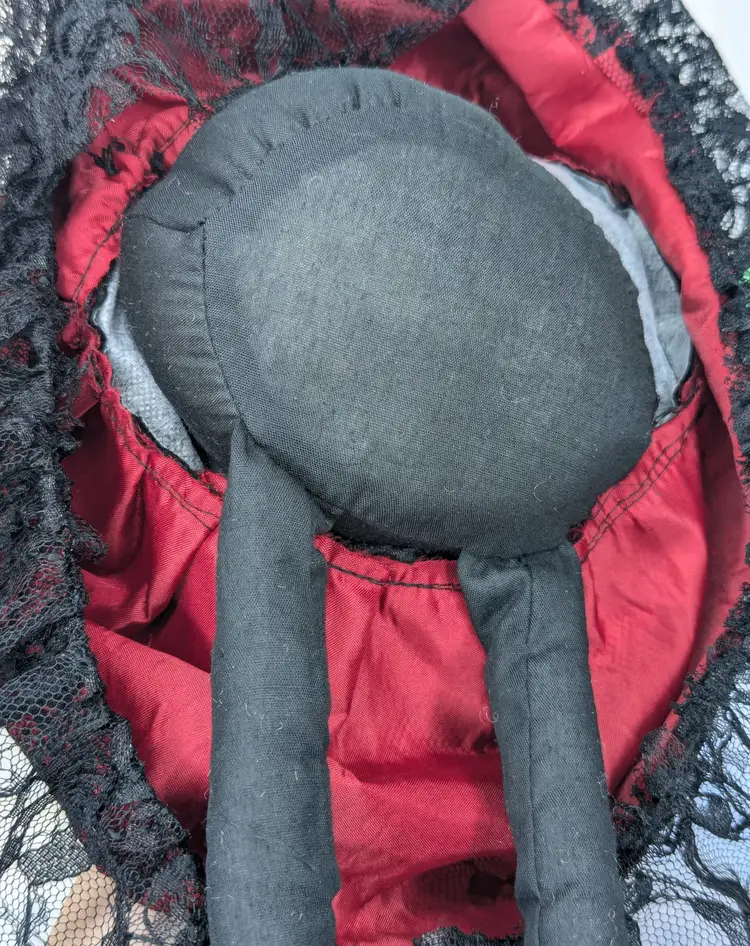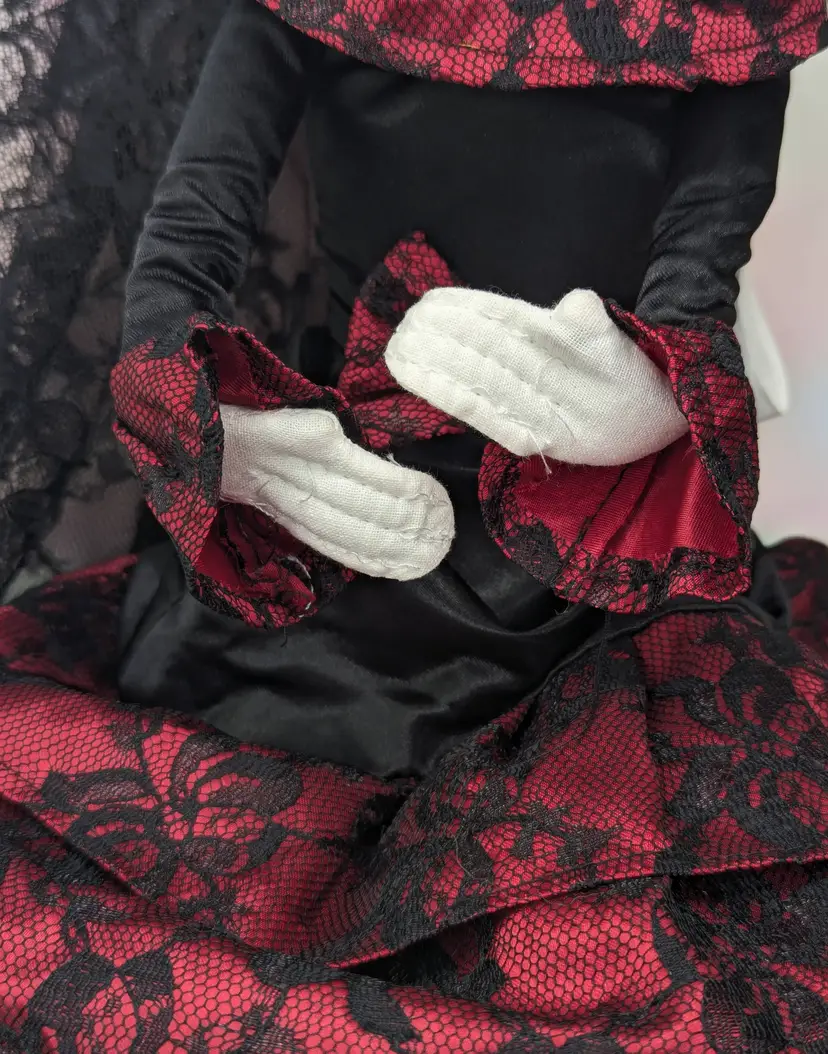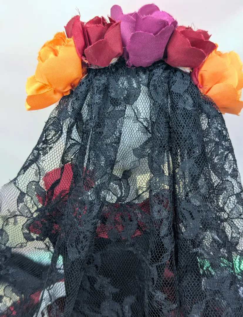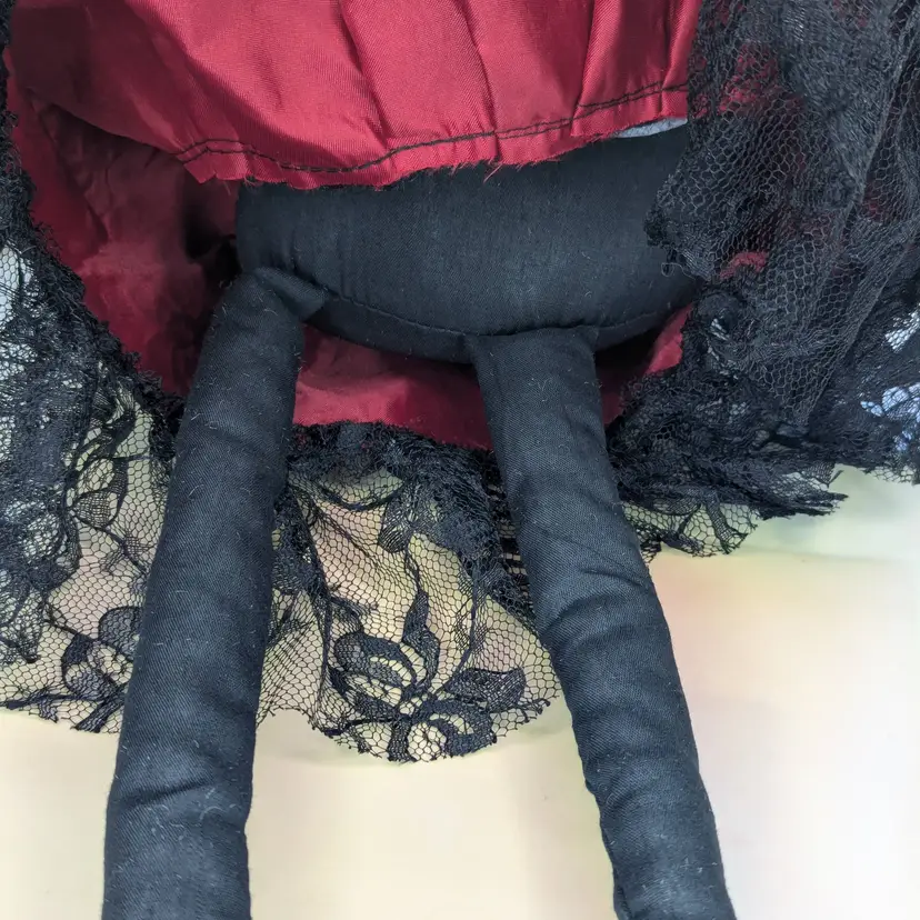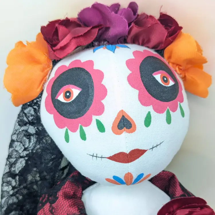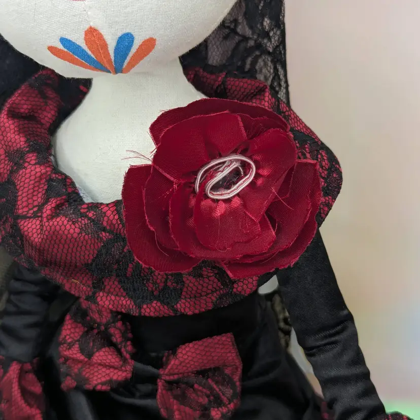 Day Of the Dead - Dia de los Muertos Sugar Skull Catrina Cloth Doll weighted Shelf Sitter in Red & black lace dress with flowers and black lace veil. This doll is in good condition, the only issue i saw was the flower on the dress looks like it might be missing the middle of the flower, other wise no rips, tears, holes or stains. Doll is 12" sitting and full length of 24" Wired poseable arms Unbranded, no markings or tags of maker - NOT A TOY She is weighted so that she will sit up. Doll is for display/decor /decorative use only. Not for children or play Item comes from a smoke free, pet friendly home.