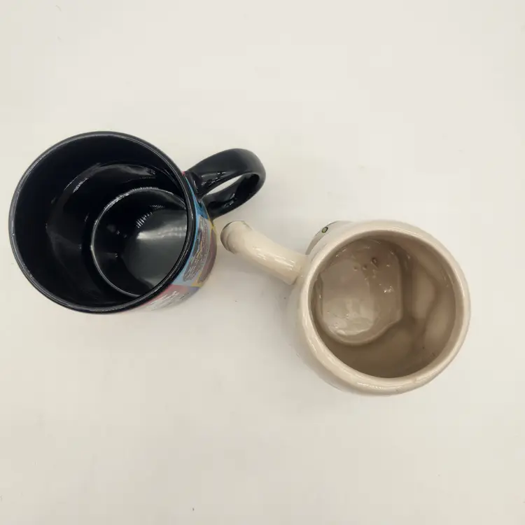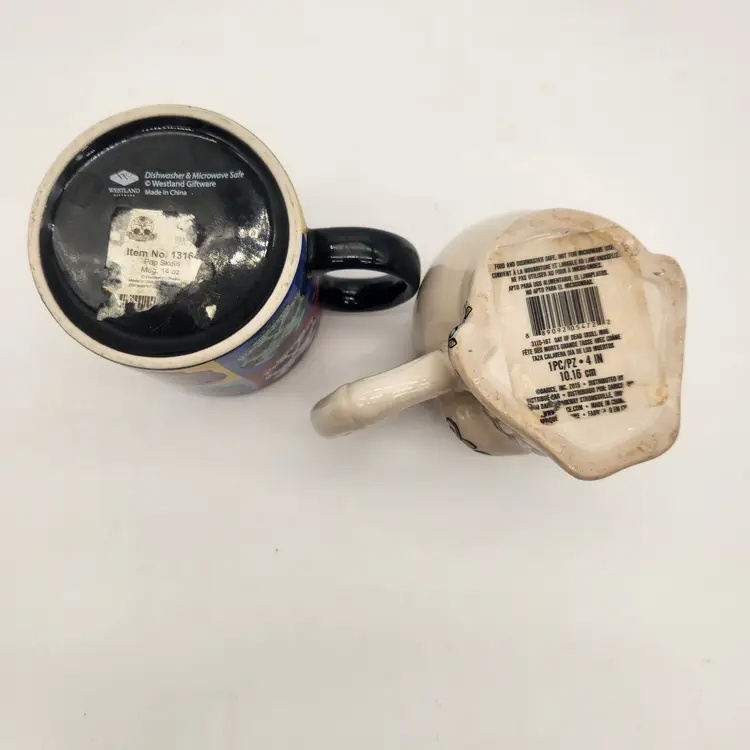 Measurements: • Mugs hold: 14 oz Good condition: each has a tiny chip on the far-side rim (see photo). Skull mug has crazing that may just be intentional. Skull mug not for microwave use.
