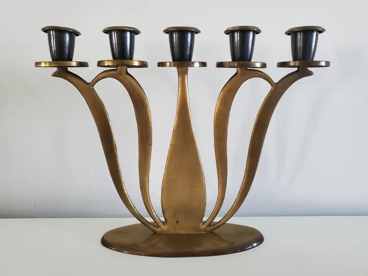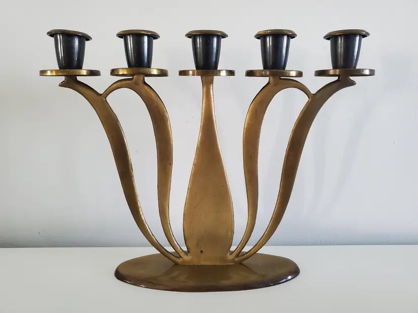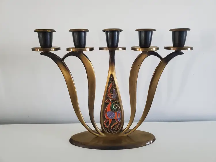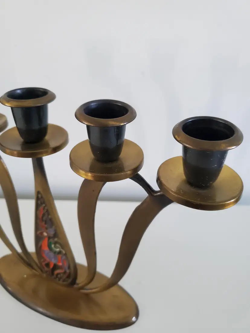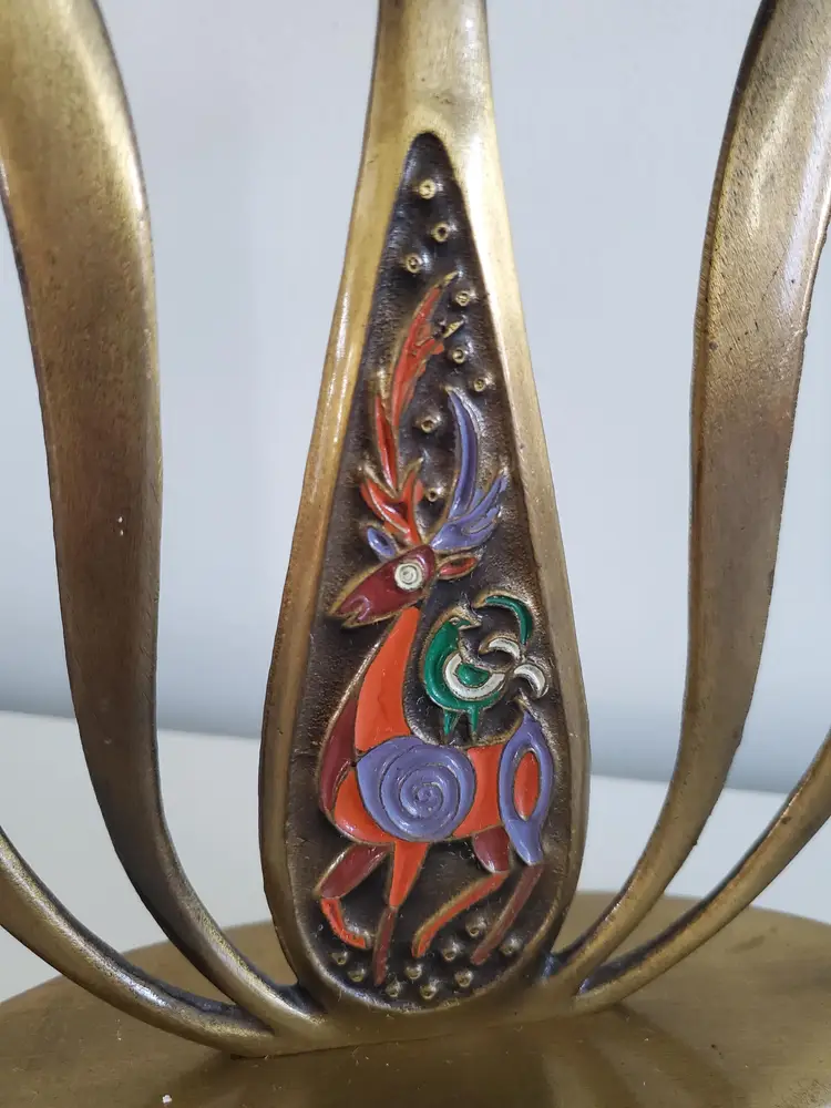 The Dayagi brothers from Israel were famous for these designs and colors that were in vogue during the 1950's-1960's. They produced a variety of objects, often with Judaic themes. Their artistry, which predates Brutalism as applied to product design, is synonymous with mid-century Israeli metalcraft.