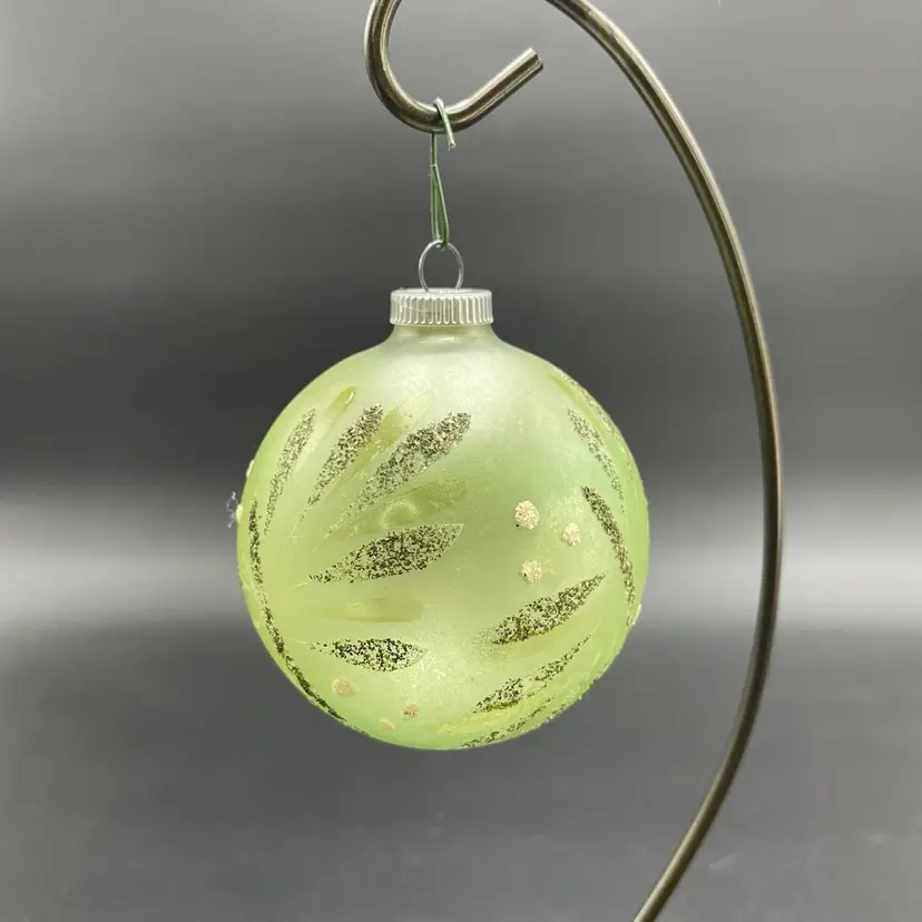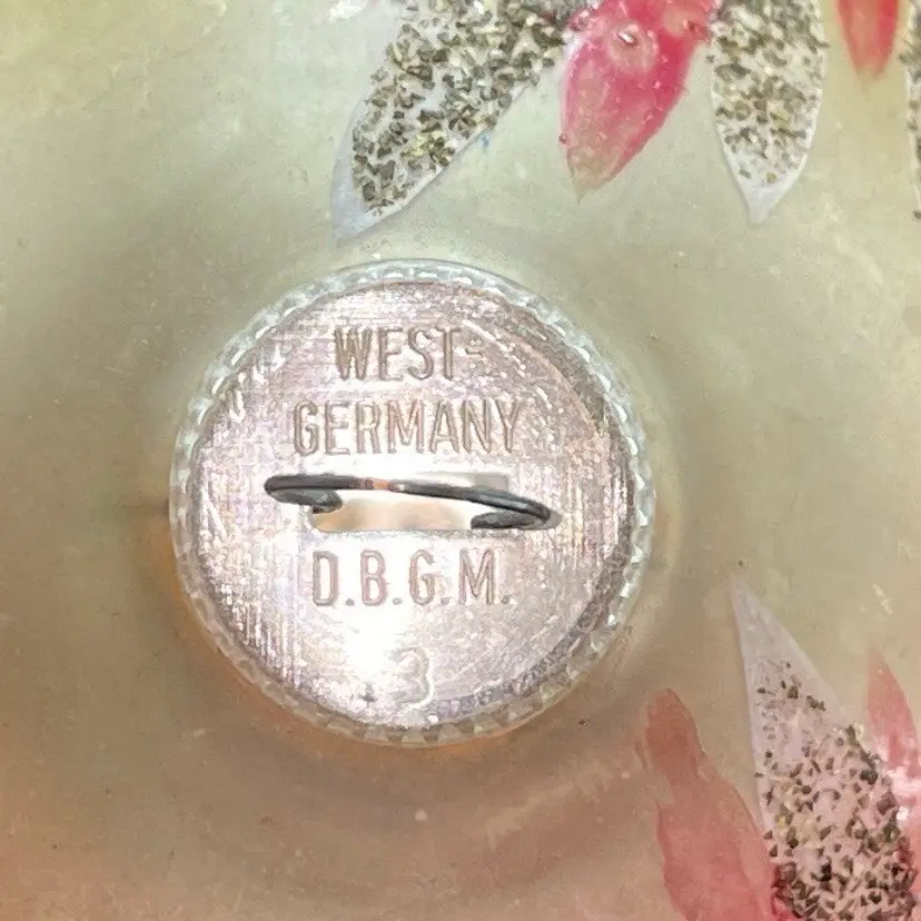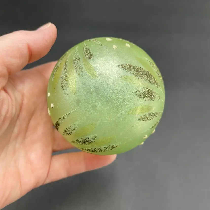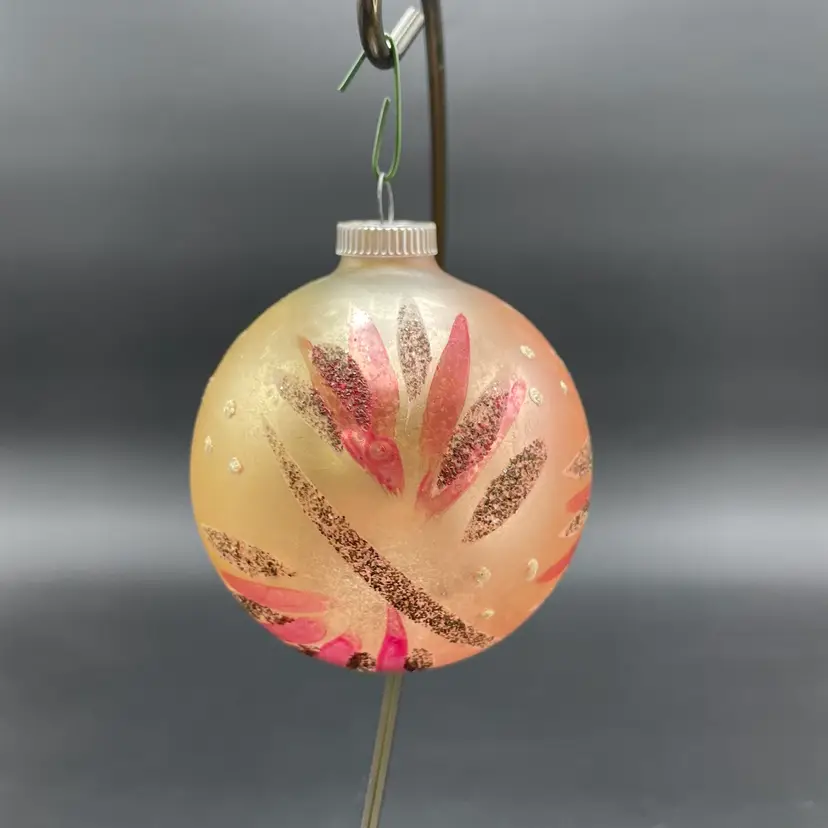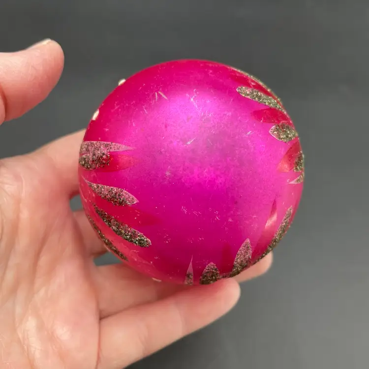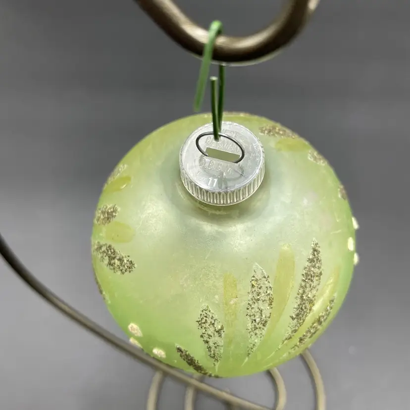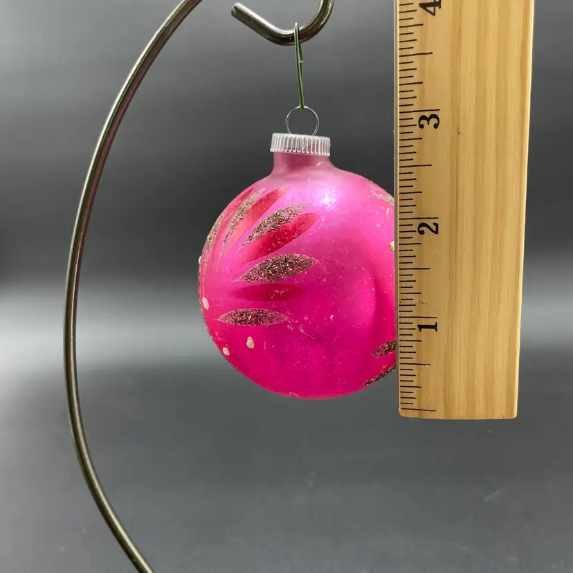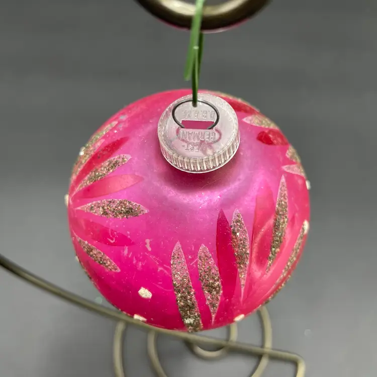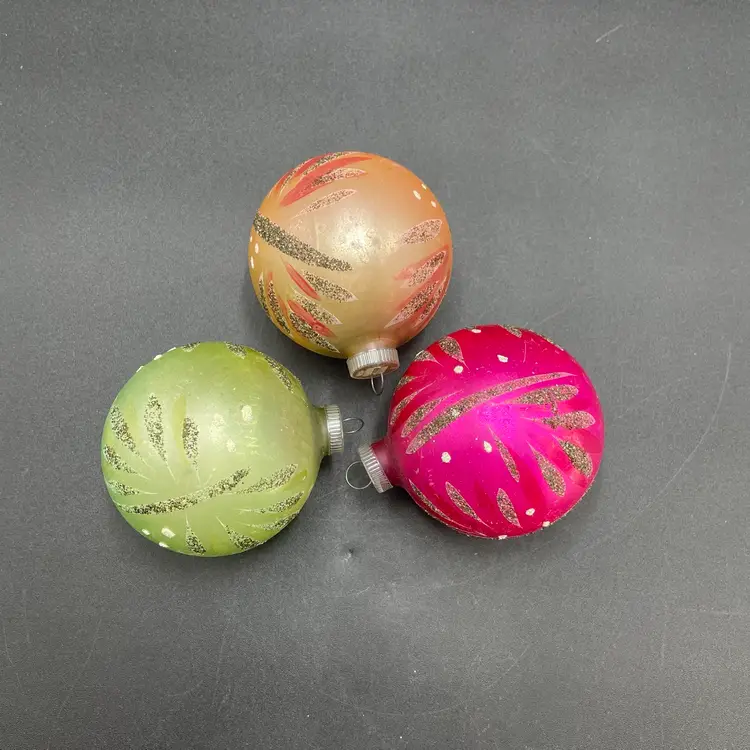 This is a set of 3 vintage DBGM West Germany mercury glass hanging ornaments. There is a pink, green, and champagne one. Each is marked West Germany DBGM on the topper. They each measure approximately 3". All have wear due to age and use such as scratching and glitter loss. No chips or cracks.