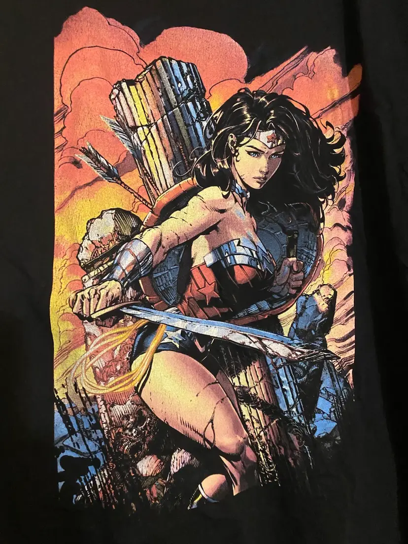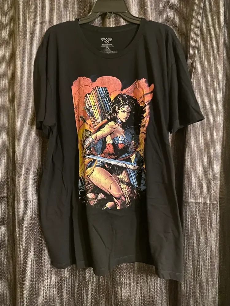 You are purchasing one Men's Size 2XL Black Wonder Woman Short Sleeve T-Shirt by DC Comics from 2020. This T-Shirt is in good condition with no holes or stains.