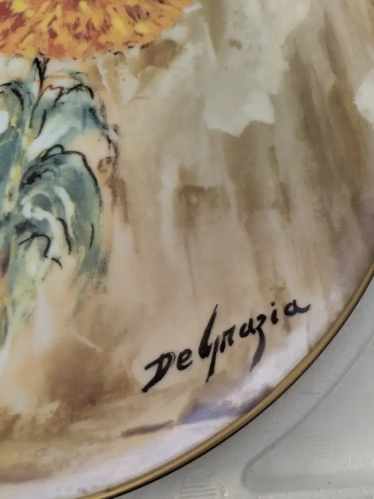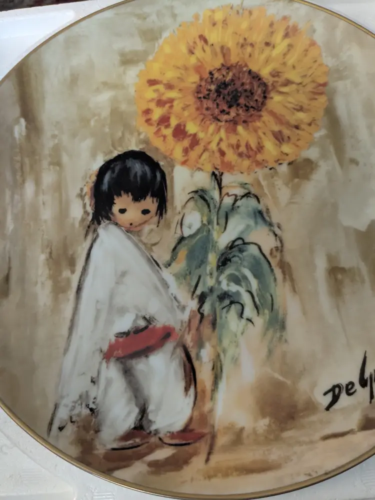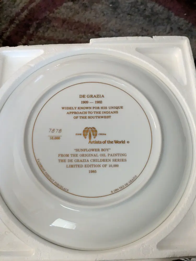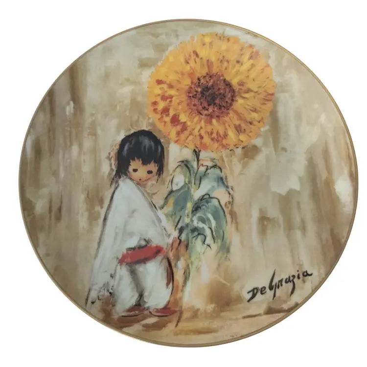 De Grazia 1985 porcelain 10 1/14 inch "Sunflower Boy"collector plate. Has original Styrofoam. (No box) In excellent used condition with no chips or cracks