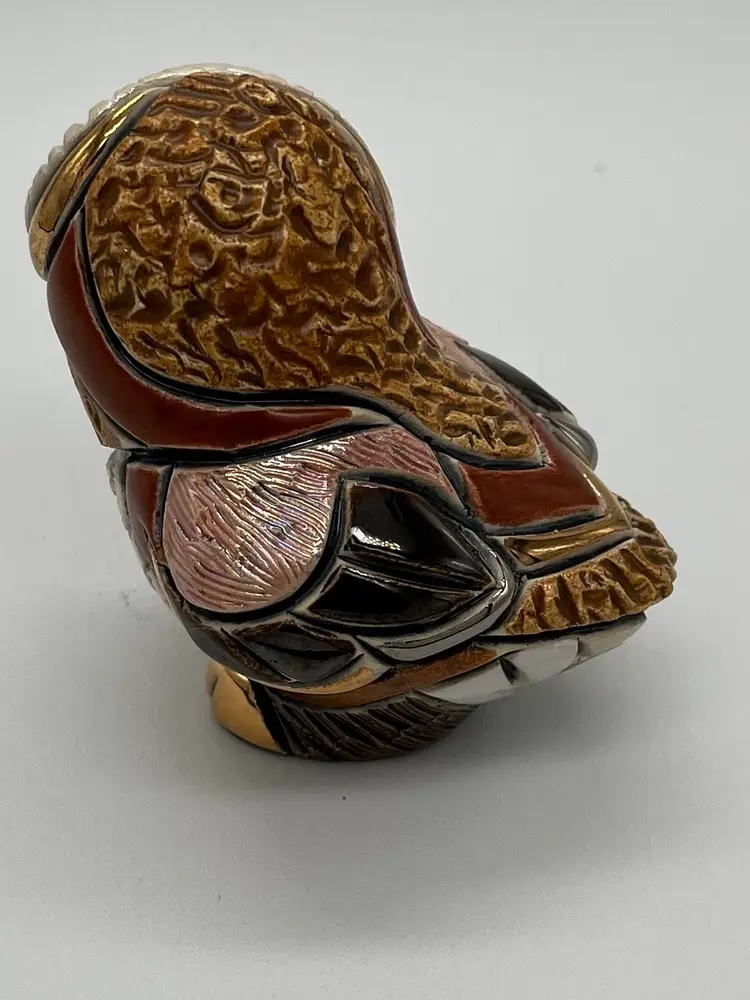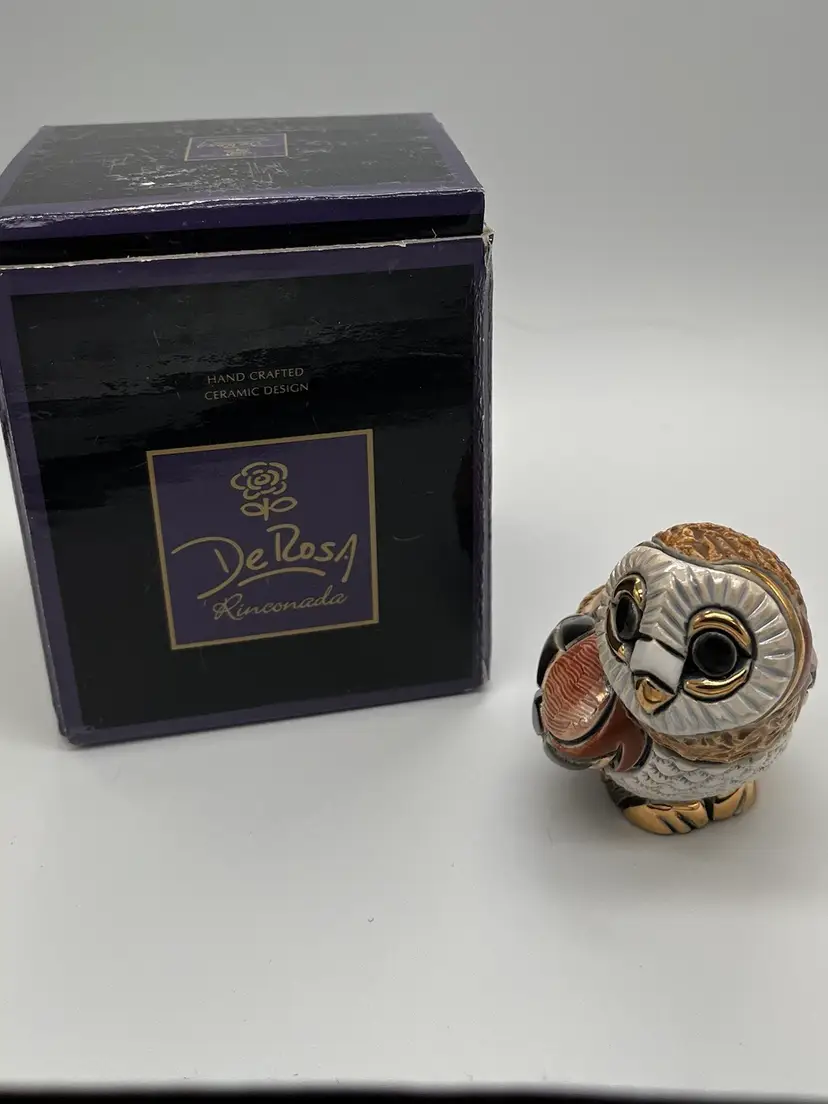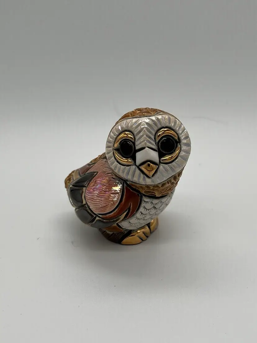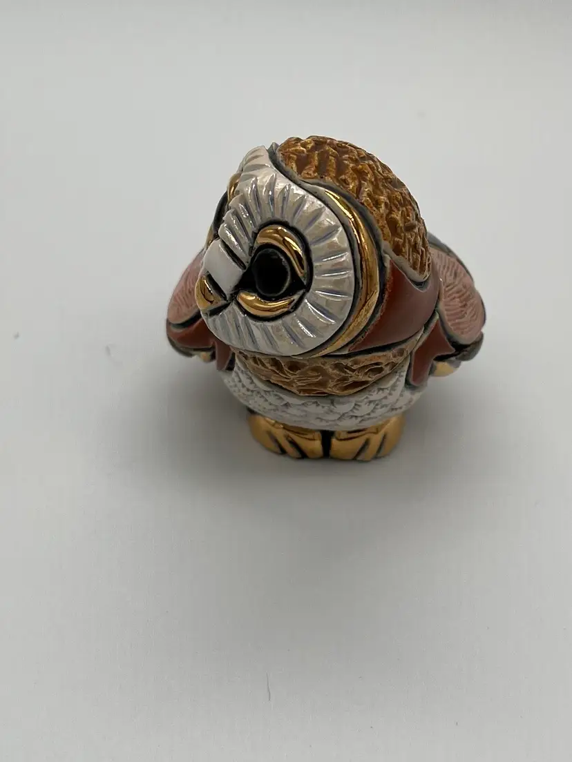 De Rosa Rinconada figurine. Baby Barn Owl #F310. Brown and beige coloring with gold accents. Brown eyes. Figurine is approximately 2 1/2 inches tall. Has box.