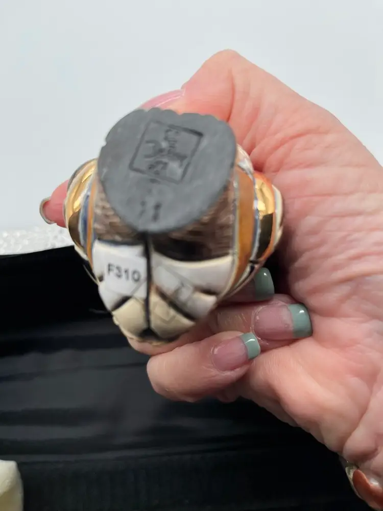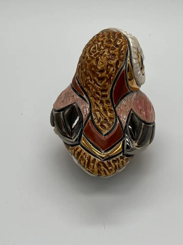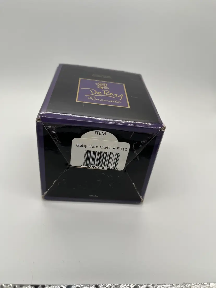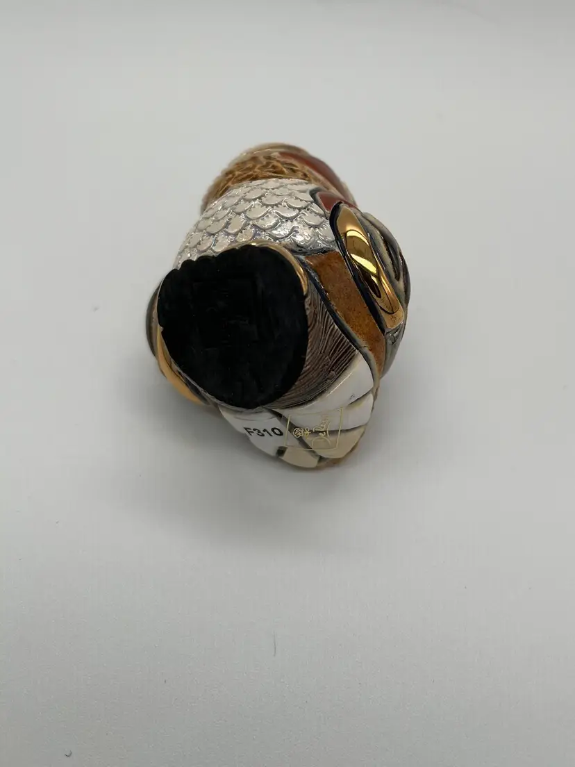 De Rosa Rinconada figurine. Baby Barn Owl #F310. Brown and beige coloring with gold accents. Brown eyes. Figurine is approximately 2 1/2 inches tall. Has box.