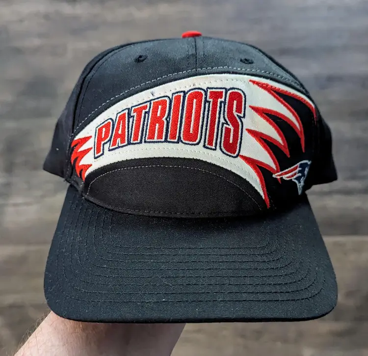 This listing is for a sick Deadstock Vintage 1990s New England Patriots Snapback Hat By Twins Enterprise. Sick graphics with the shark tooth like banner. Has a minor spot on the second "tooth" please see the pictures. Such a sweet rare hat perfect for any Pats fan! Adjustable to fit most heads. Officially licensed by the NFL.