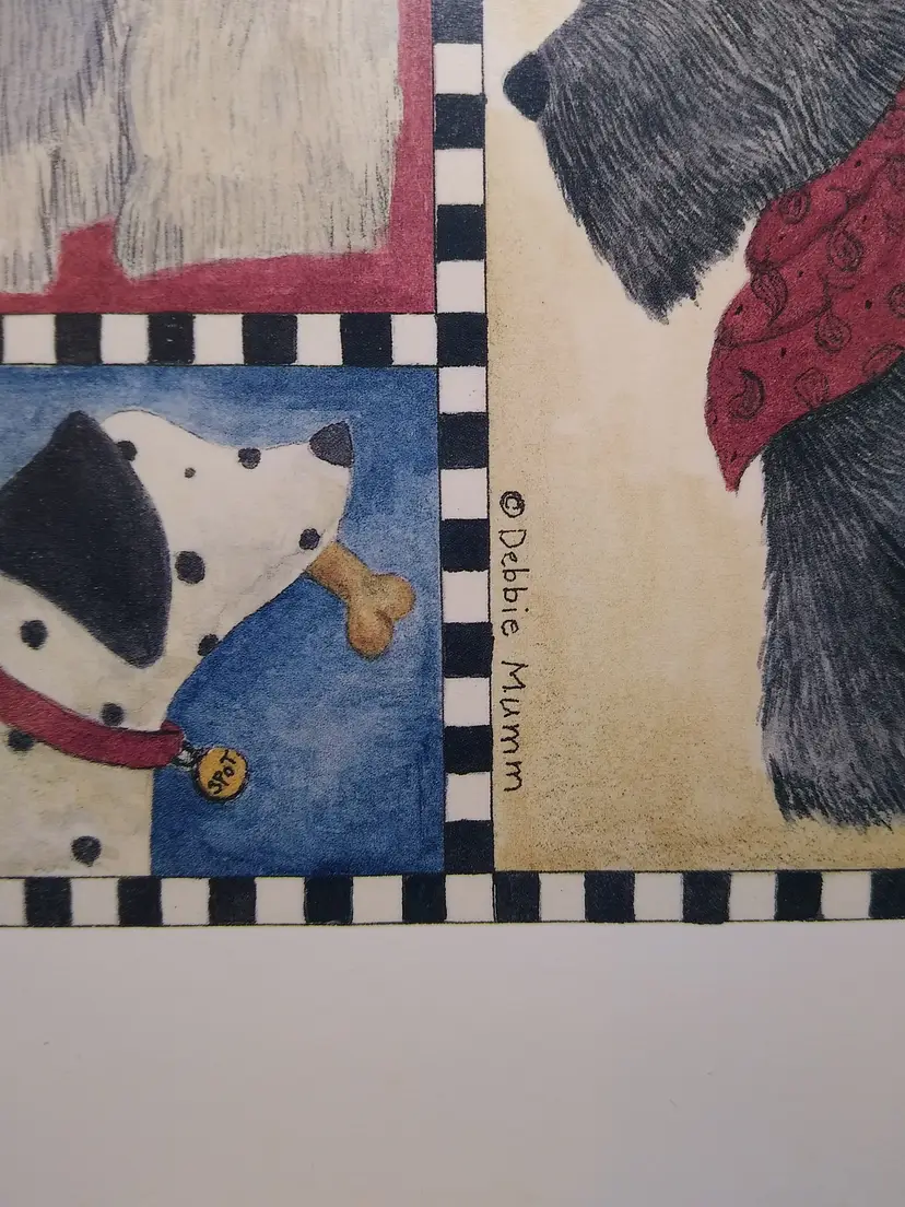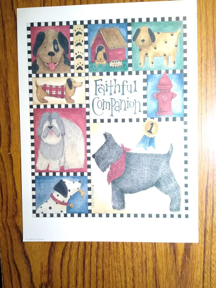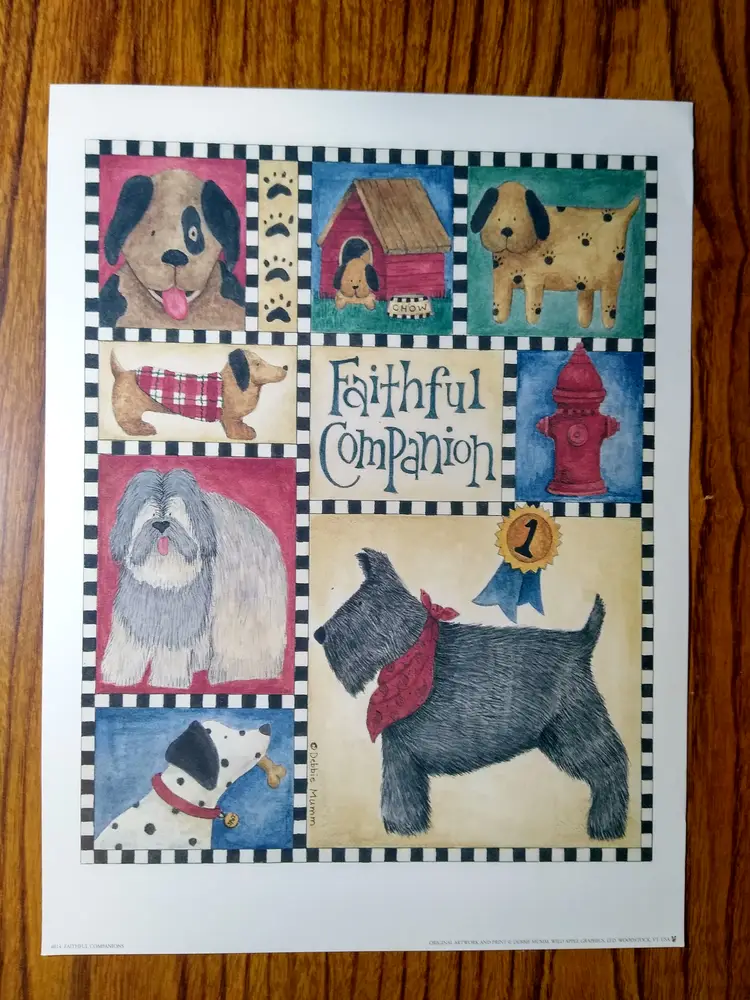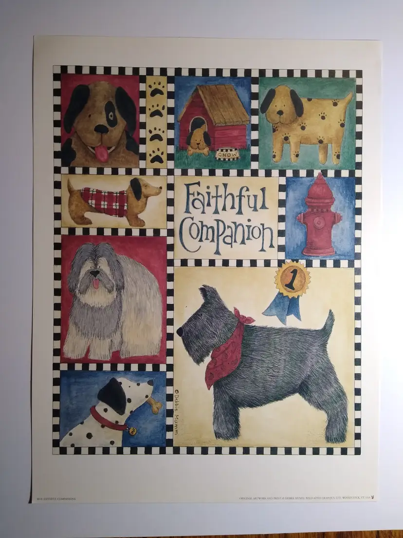 Excellent unused condition. Ready for framing. Has minor edge wear. This is a decorative art print titled "Faithful Companion" by Debbie Mumm, featuring a charming collection of dog illustrations in a colorful, whimsical style. The print showcases various dog breeds, including a black dog wearing a red bandana, a spotted Dalmatian with a bone, and other playful pups, all framed with a black and white checkerboard border. It is a single-piece poster print, ideal for collectors of animal-themed art or dog lovers.