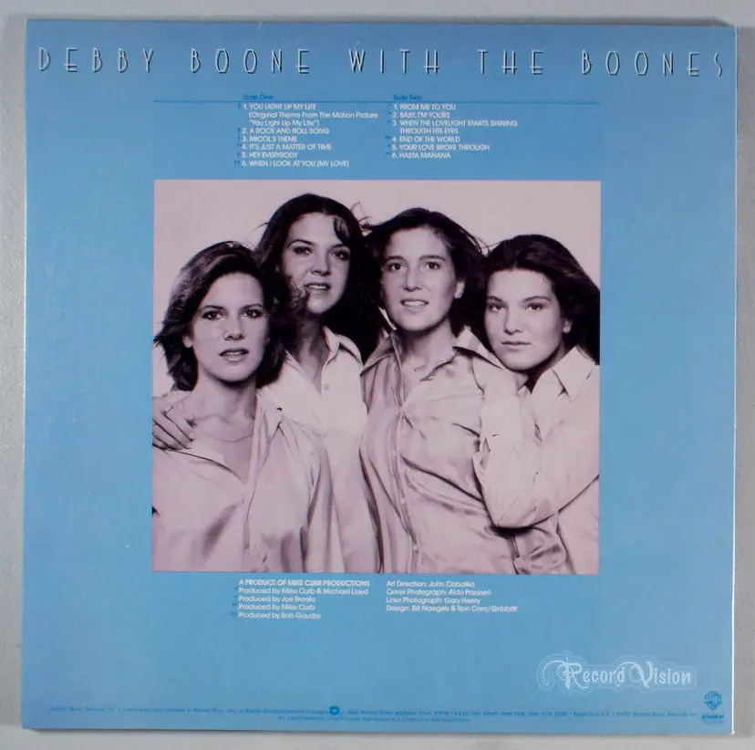 You Light Up My Life is the debut solo album from singer Debby Boone. After the title track reached No. 1 on the Billboard Hot 100, Boone needed to quickly assemble her first solo album. The result was a RIAA-certified platinum album (No. 6 Pop, No. 6 Country). Joe Brooks produced the album after writing and producing the title track. Several tracks from Boone's album were previously recorded by Boone with her sisters as part of their work as the Boones. The album's closing track, Hasta Mañana, written and recorded by ABBA, had charted earlier in 1977 for the Boones peaking at No. 32 AC. When the Lovelight Starts Shining Through His Eyes was released two years earlier in 1975 by the Boones reaching No. 25 AC. The track Baby I'm Yours was released as the credited B-side of Boone's third single, God Knows (No. 74 Pop, No. 22 Country, No. 14 AC), from her second album, Midstream.