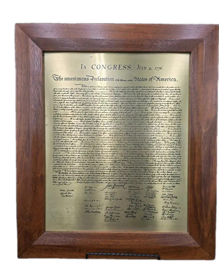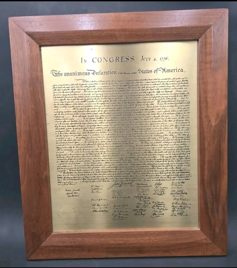 Declaration of Independence Engraved Metal Plaque Framed in Wood. It measures 15 x 18. I find no issues with it other than a little patina.