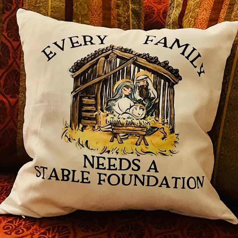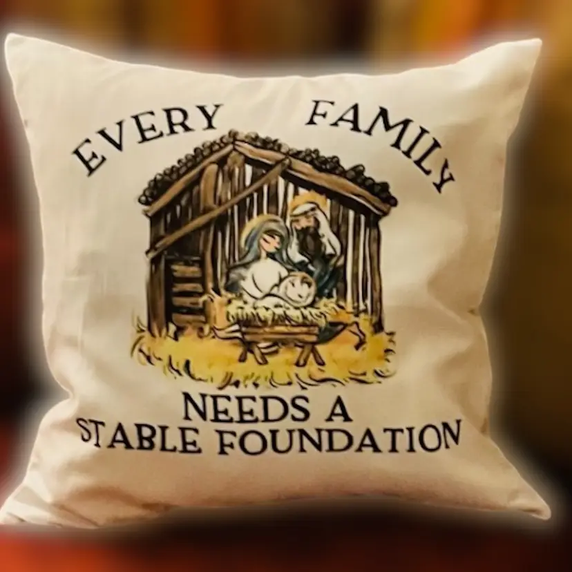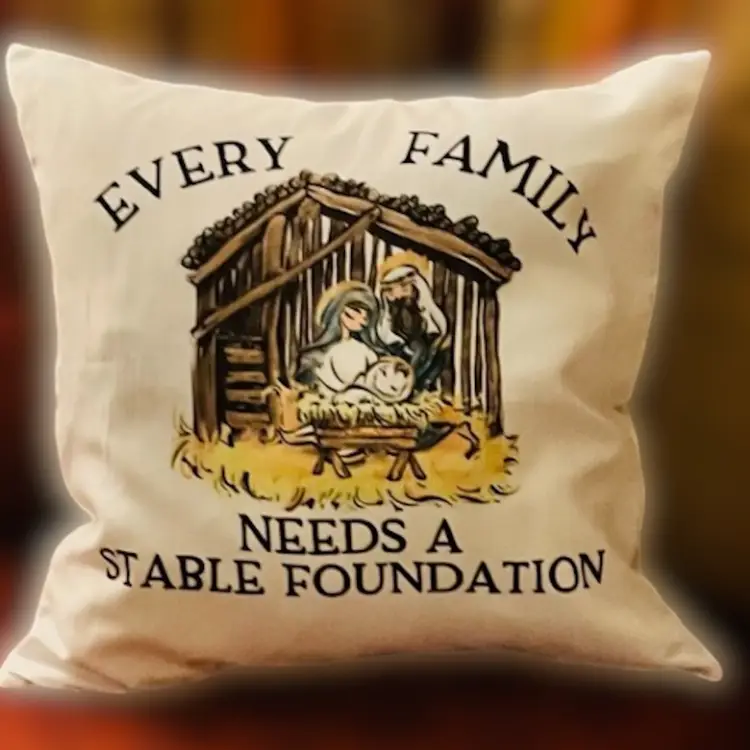Sublimated 12in decor pillow with “Every Family needs a Stable Foundation”. This is washer and dryer safe.