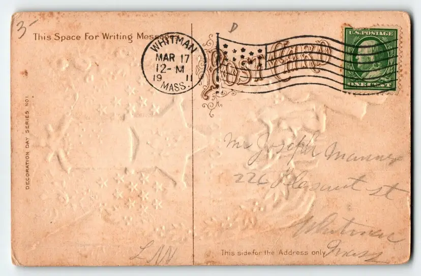 Unit of Sale: Single Unit Number of Items in Set: 1 Artist: Unknown Occasion: Memorial Day Size: Standard (5.5 x 3.5 in) Signed: No Material: Paper Year Manufactured: 1911 Original/Licensed Reprint: Original Brand/Publisher: Unbranded Subject: Decoration Day Personalize: No Type: Printed (Lithograph) Era: Pre-War (Pre-1914) Theme: Patriotic, USA, Flags, Banner, Civil War, Decoration Day, Stars, Wreath, Military, Soilder Features: Embossed Time Period Manufactured: 1900-1919 Country/Region of Manufacture: Unknown Postage Condition: Posted