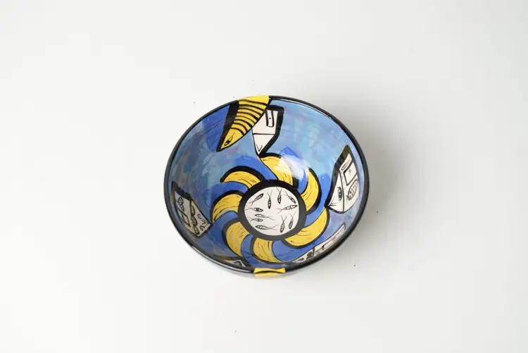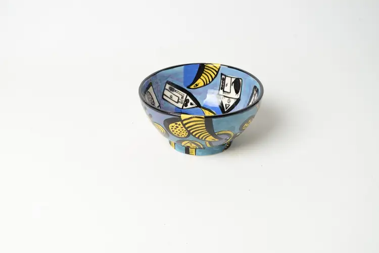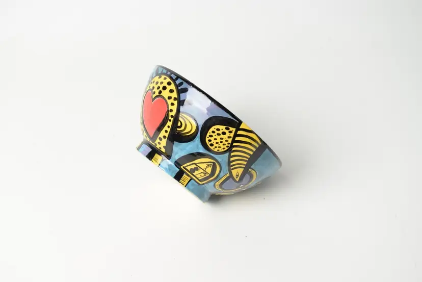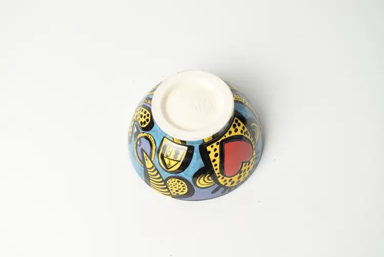 He is known for his vibrant and whimsical pottery, often incorporating abstract motifs and bold colors. This particular bowl showcases his unique style, blending functionality with artistic expression. The use of bright colors and playful designs reflects a contemporary approach to pottery that appeals to collectors and art enthusiasts alike.