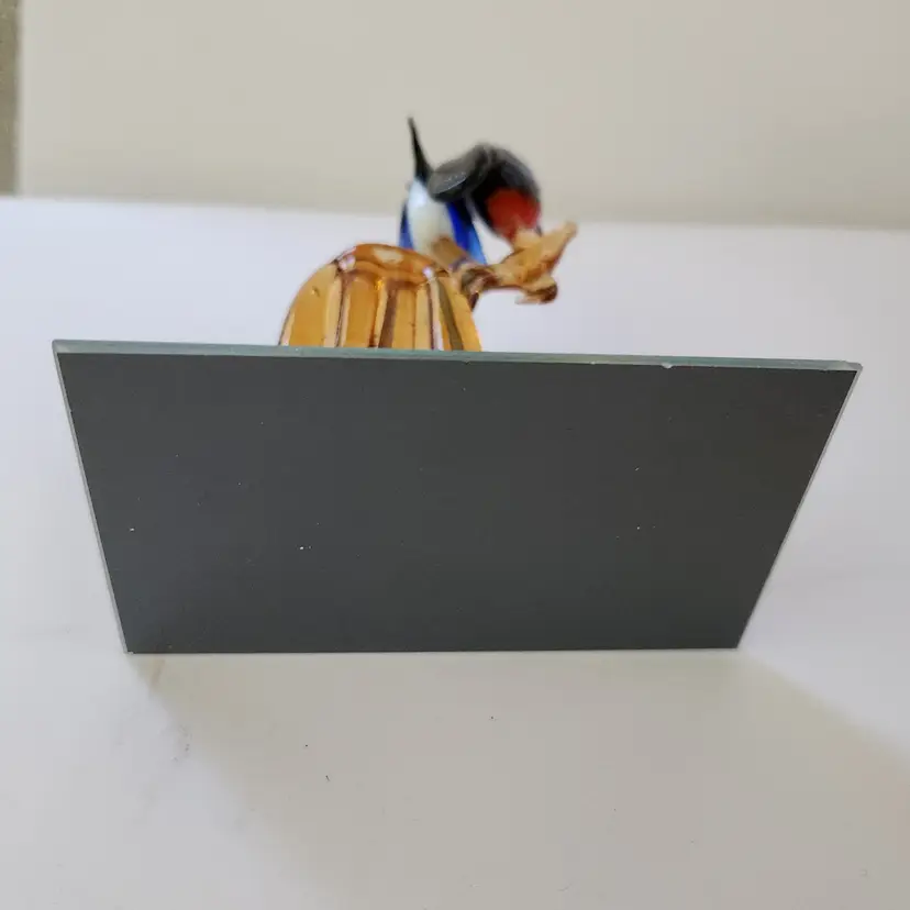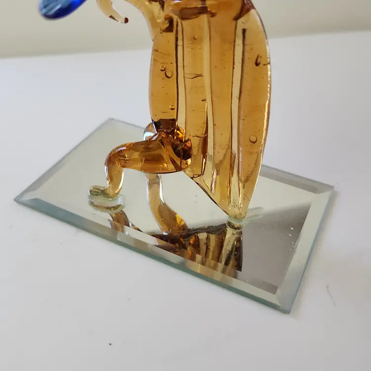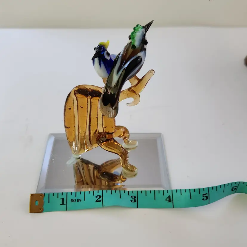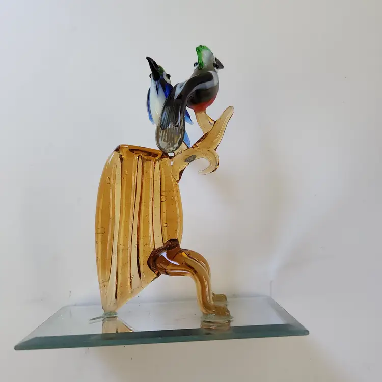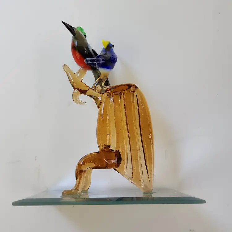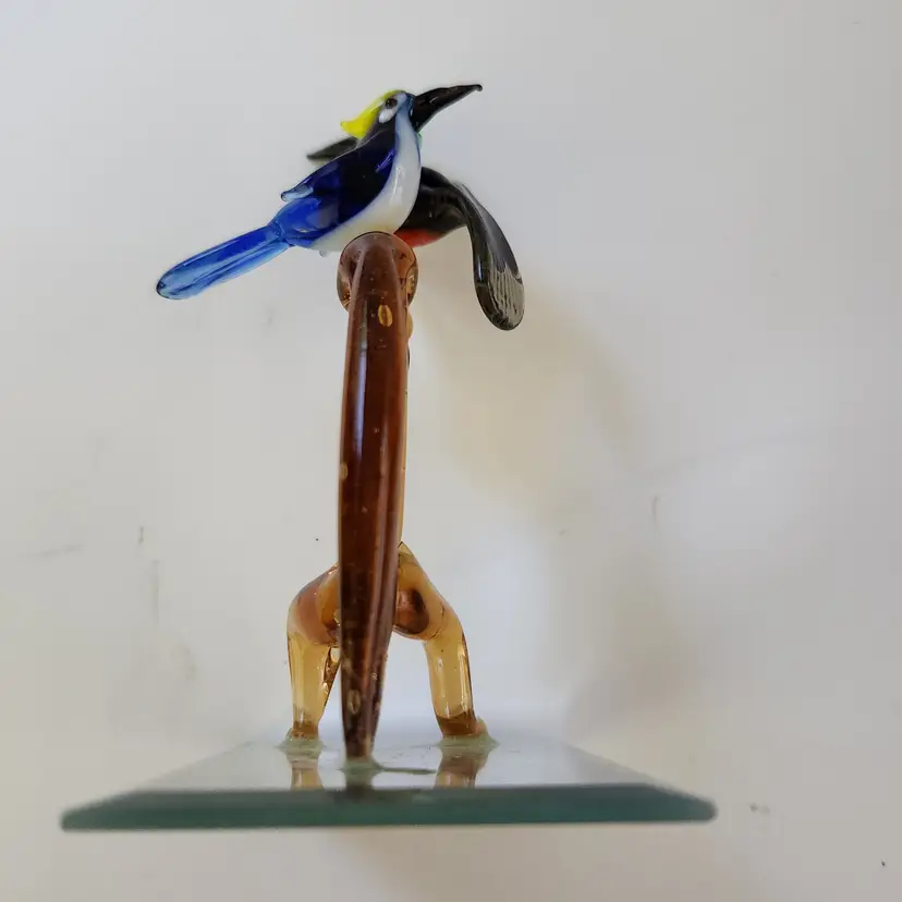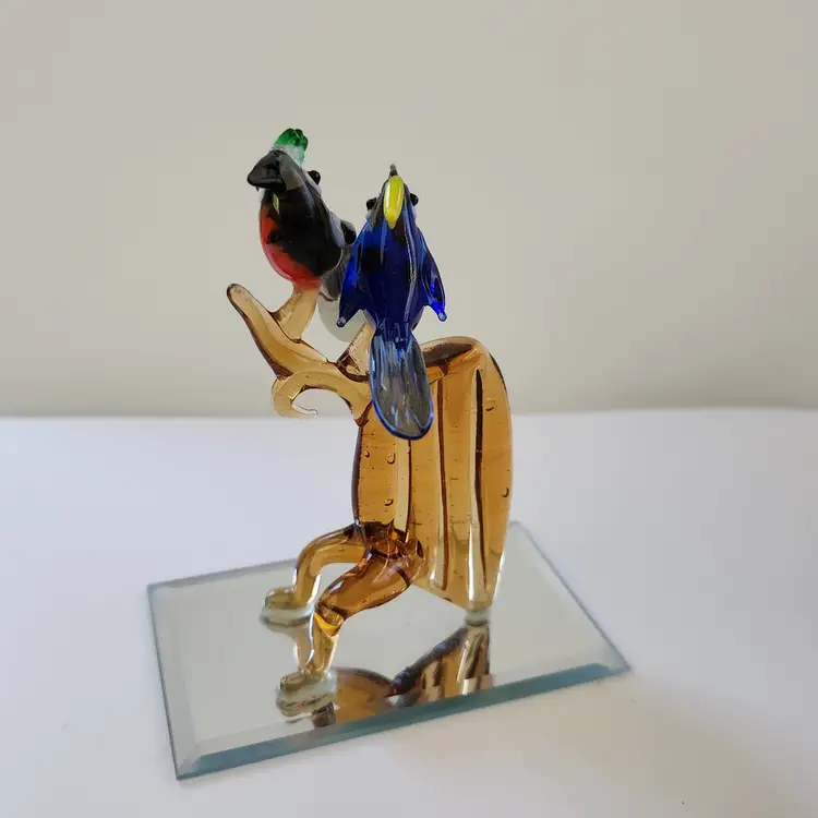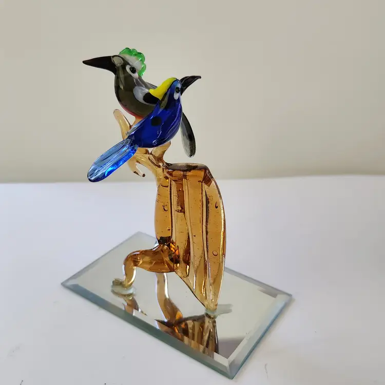 Art glass birds perched and fixed to Mirrored base. Handmade blown/lamp work. Birds maybe Mcaws. Artist and manufacturer unknown.