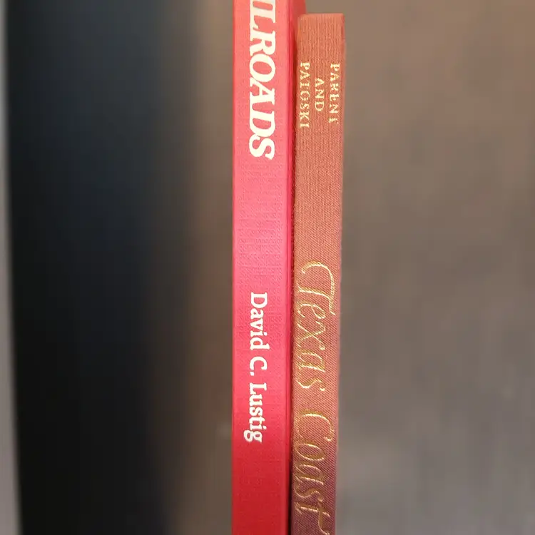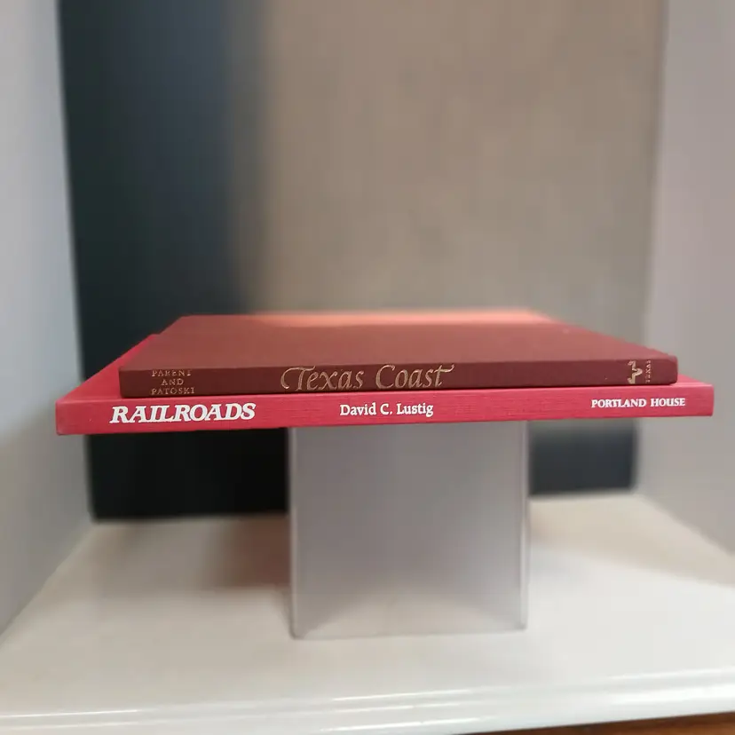 These beautiful books are perfect for Patriotic or Christmas decor styling! The larger, red, book is "Railroads" published in the 70's - dust jacket is available if you want it - the book itself has gorgeous color photos of trains throughout history. The other, smaller, dark red, book is "Texas Coast" and contains beautiful pictures from all the varied coastal scenes of the Texas coast. "Railroads" measures 10.75" x 13.25"x .5" and the Texas Coast book measures 10.25"x11.25"x.5" - Book Stack is $6 for the two books.