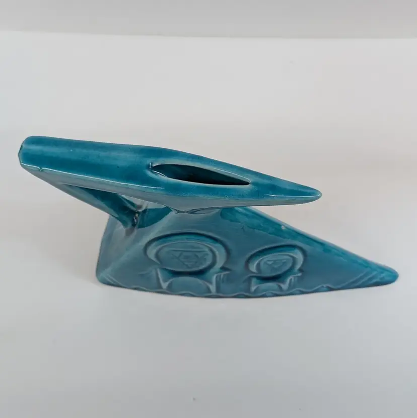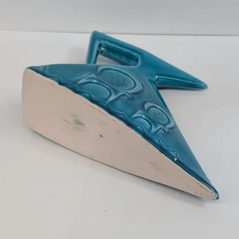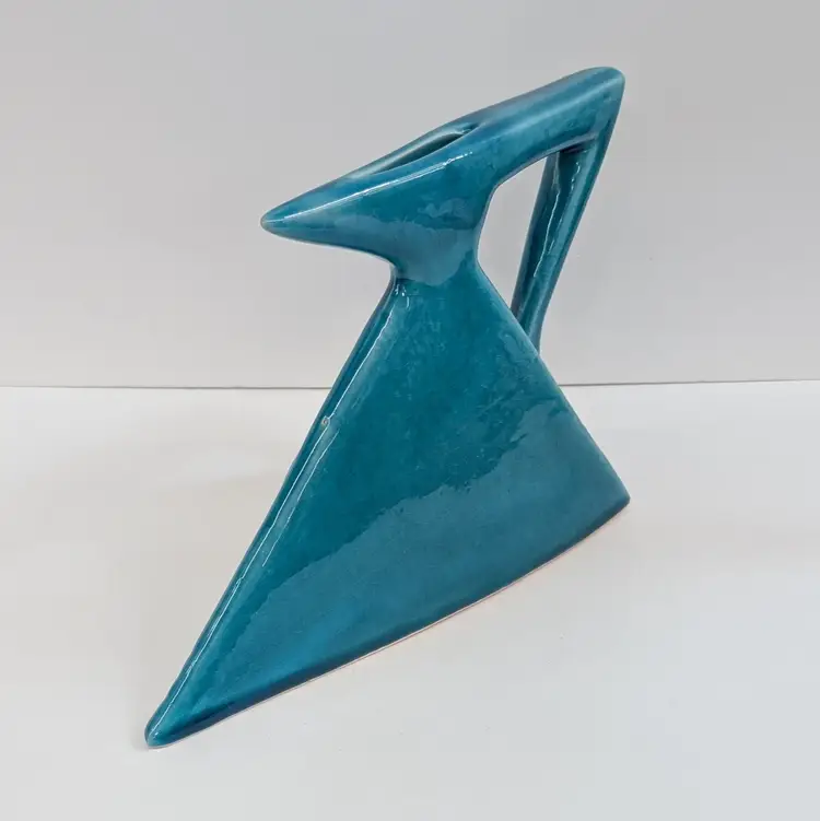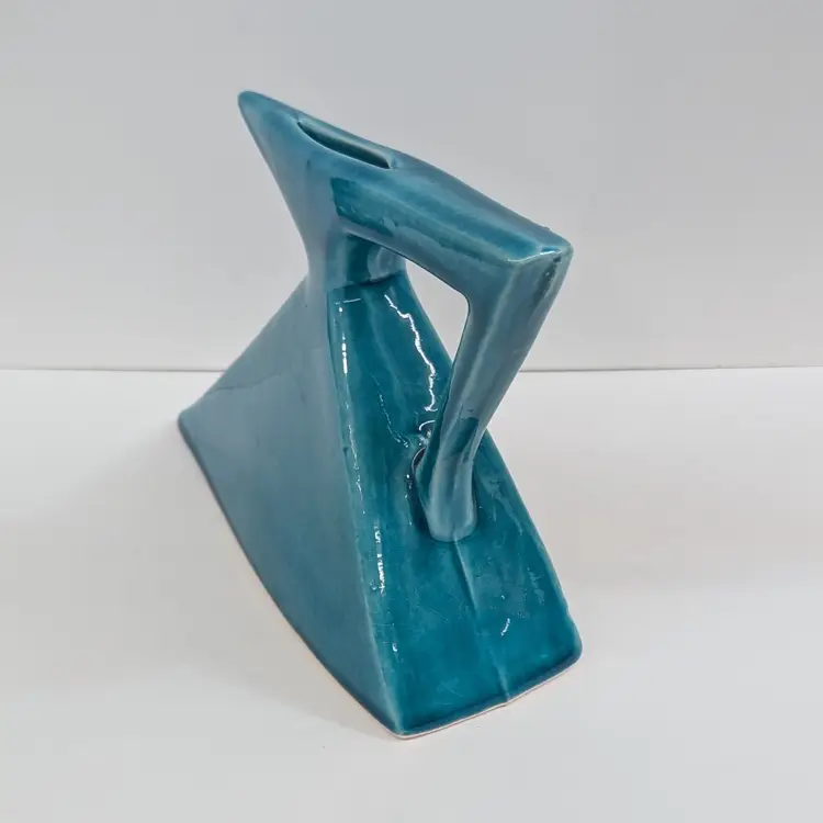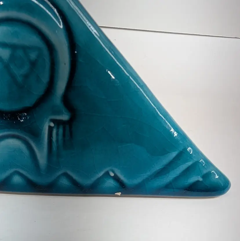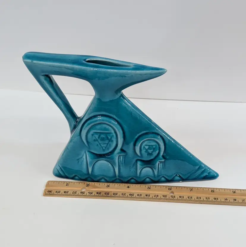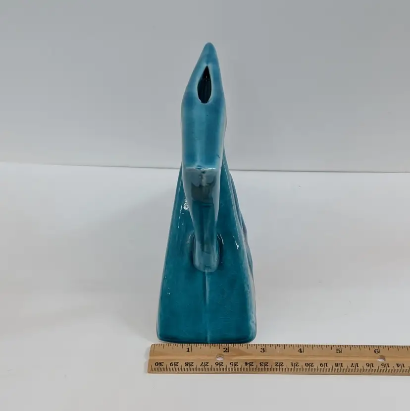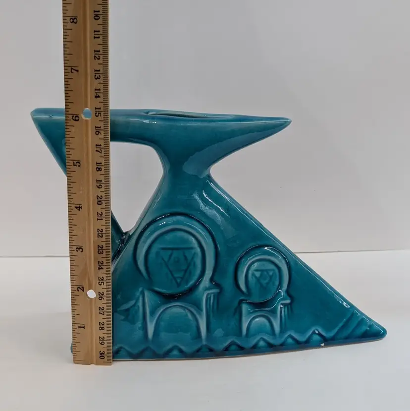 The deep turquoise glaze on this decorative vase is striking with its lines. It has big horn ibex as the pattern and a crackle in the glaze. In nice, used condition with a small extra piece of ceramic on the front right edge from manufacturing (see picture). Measurements ~ 8.25 x 2.75 x 6"