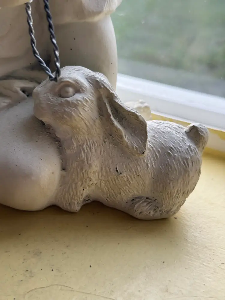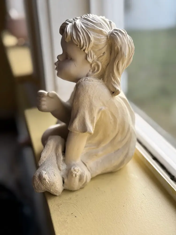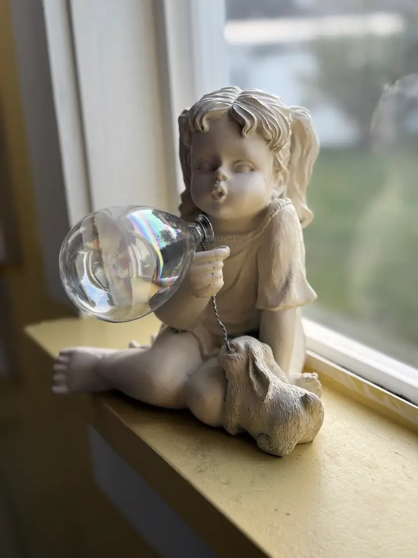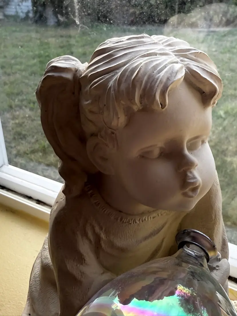 Resin sculpture of sweet girl sitting with her bunny blowing a bubble. Bubble is plastic with iridescence and fits with twisted wire into girl’s hand. Cool detailing throughout sculpture. She is 8 inches tall, 8 inches wide and is lightweight (approx. 2 pounds).
