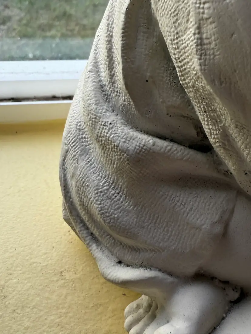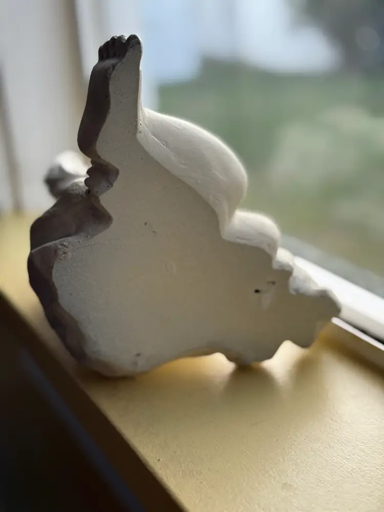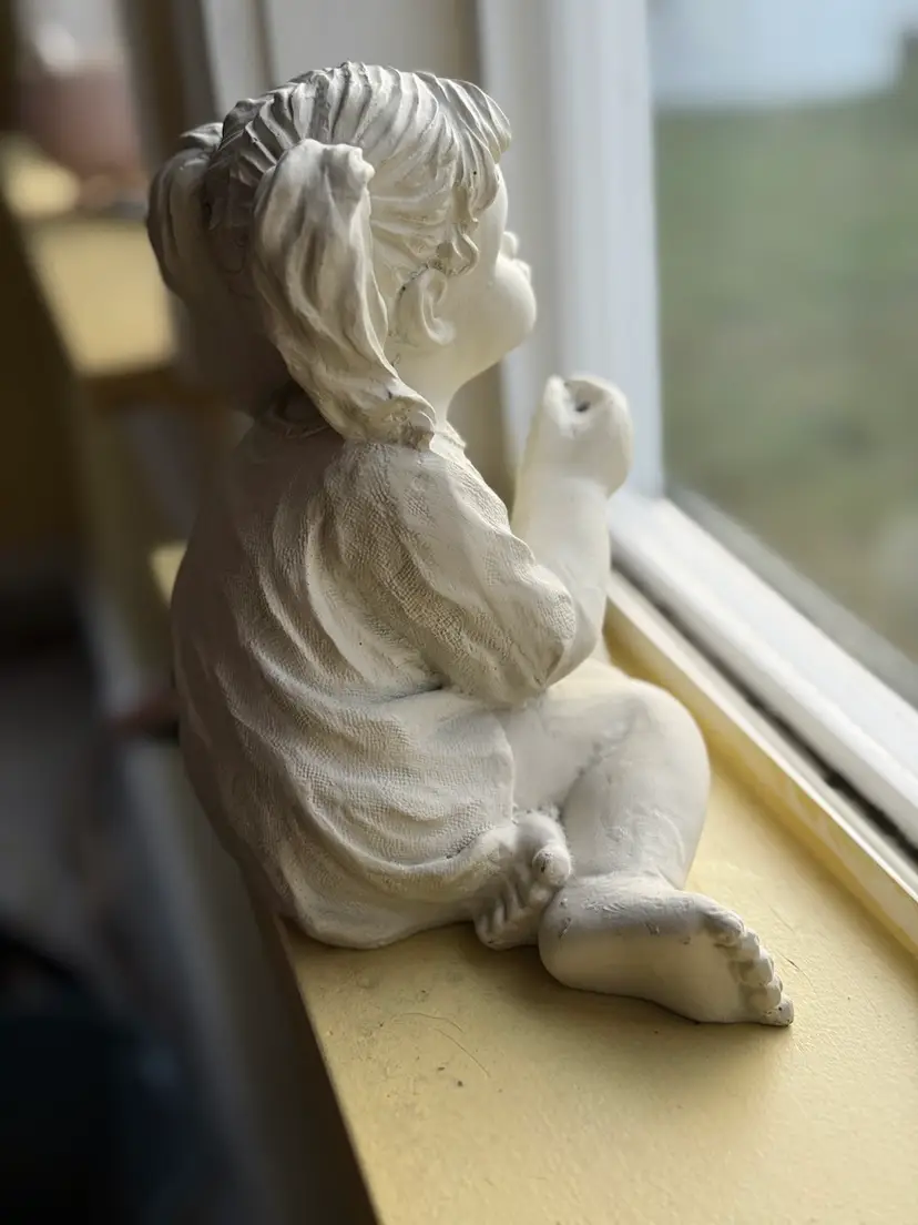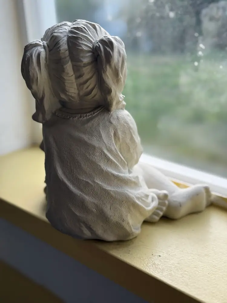 Resin sculpture of sweet girl sitting with her bunny blowing a bubble. Bubble is plastic with iridescence and fits with twisted wire into girl’s hand. Cool detailing throughout sculpture. She is 8 inches tall, 8 inches wide and is lightweight (approx. 2 pounds).