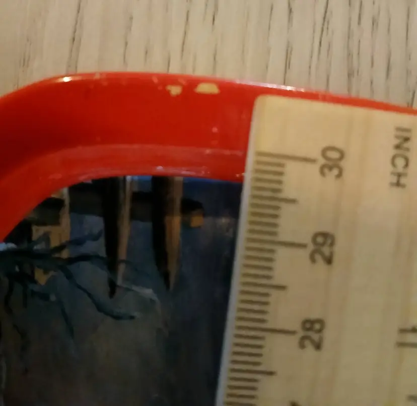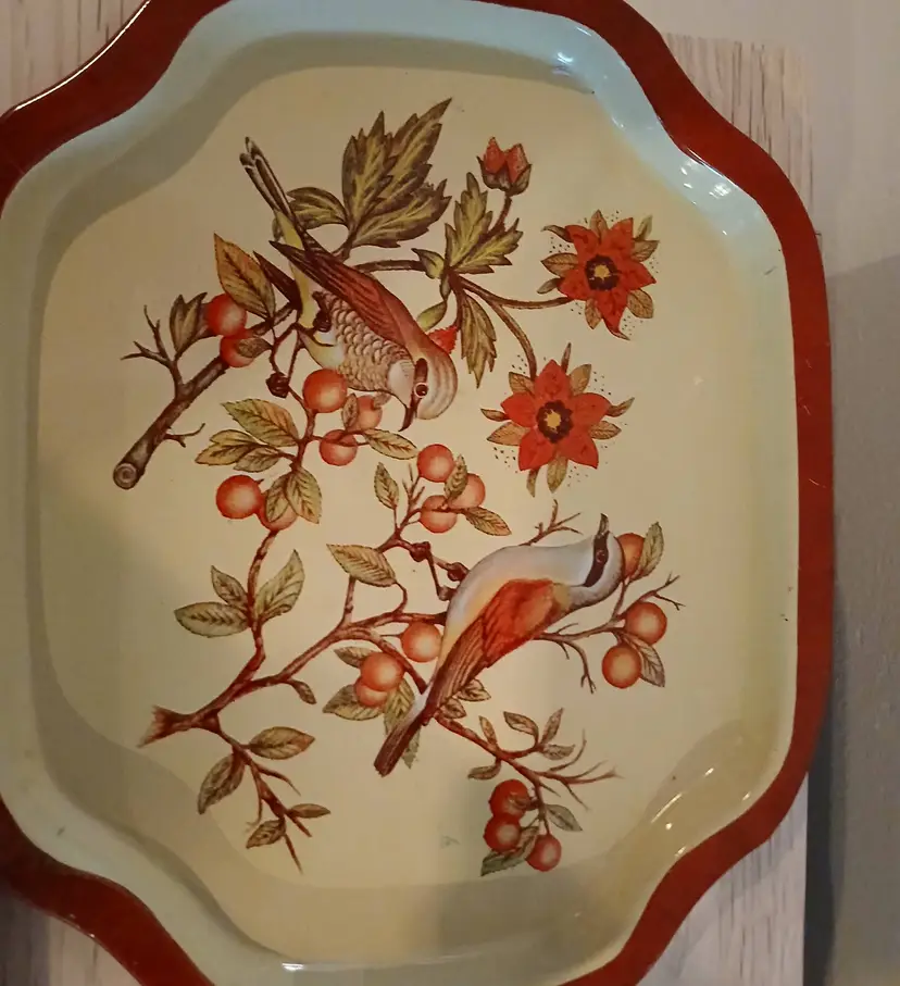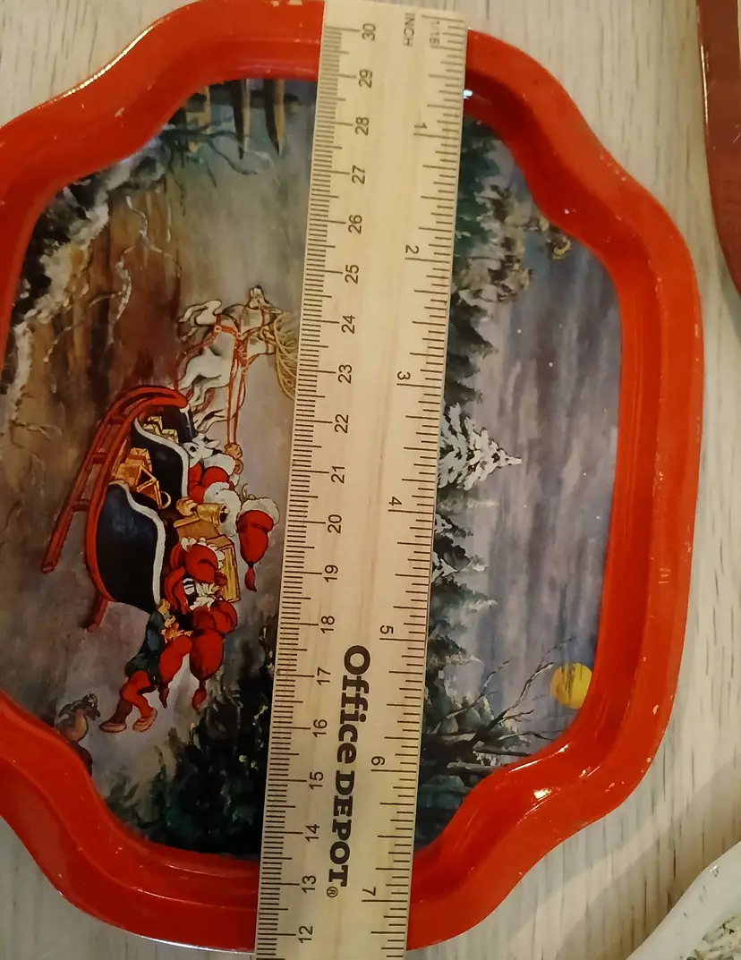 The Christmas tray has some minor scratches on it around the antlers of the reindeer. However, these do not detract from the beauty of the scene. The other minor defect is some small chipping on the rim of the Christmas tray in one spot. It isn't very noticeable unless closely examined. Please see the close up photos of these small issues. The chippiness only adds charm.