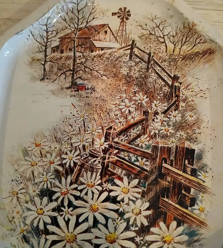 A second tray features a fence with daisies and a barn with windmill. The colors are very fall with browns, yellows and creams. The third tray features birds on branches in a fall design in browns, oranges and creams.