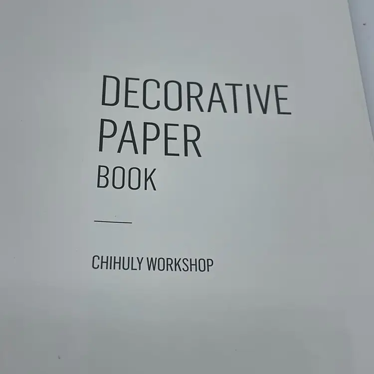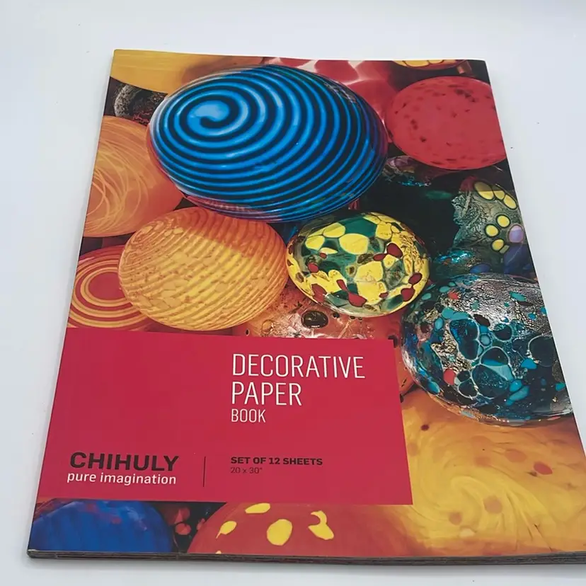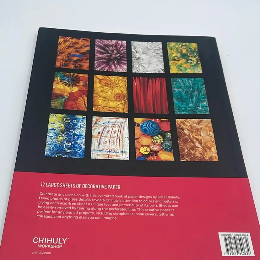 This book contains 12 large sheets of decorative paper that are 20“ x 30“ and this is based on the work by Dale CHIHULY. This is based on his glass work that is world, renowned and famous. None of the pages have been out of the book beautiful beautiful pages.