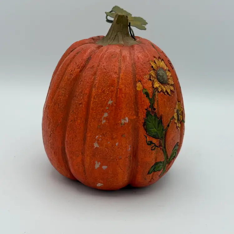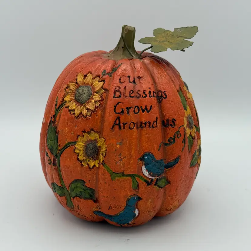 Decorative Pumpkin Adorned With Painted Sunflowers and Bluebirds. The Phase "Out Blessings Grow Around Us" is Inscribed on its Surface. Makes A Great Centerpiece or Decorative Accent. Some Paint Loss (Pictured). Good Condition. 5" Tall X 4" W.