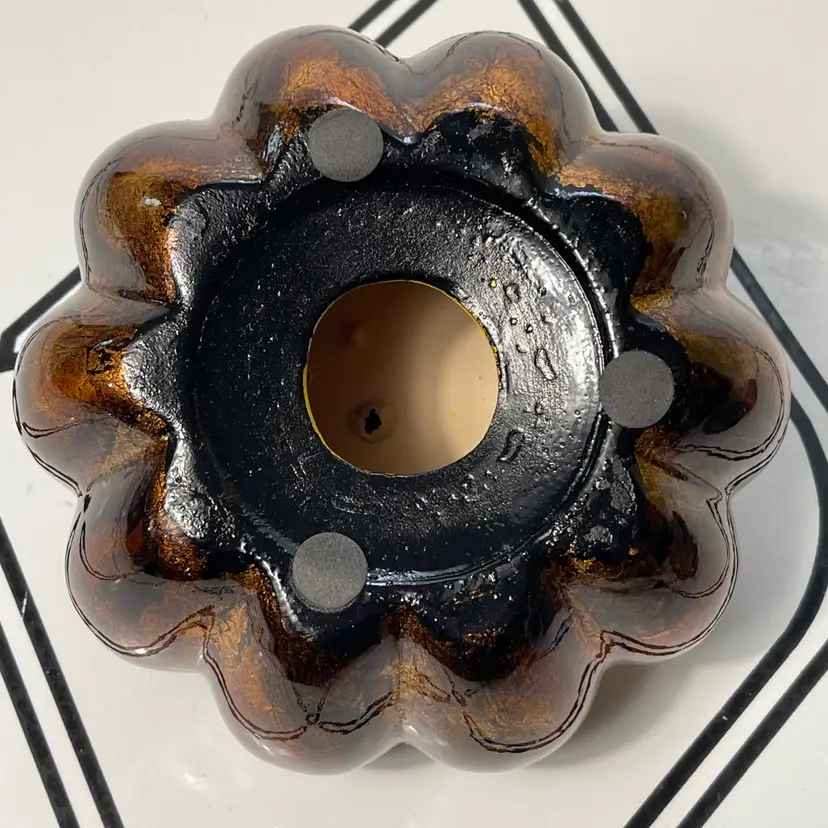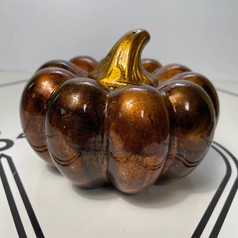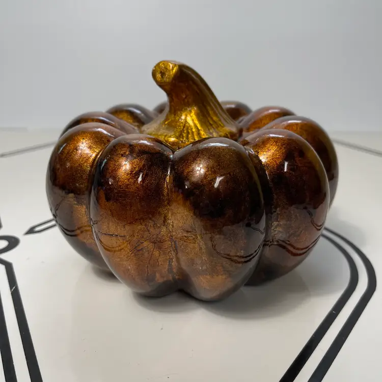 This decorative pumpkin is a stunning addition to your fall and Thanksgiving decor. Made of ceramic with gold leaf and lacquer accents, this Baroque/Rococo style pumpkin exudes elegance and charm. Standing at 5.5 inches tall and 8 inches long, it is perfect for any room in your home. Clean with a damp cloth to maintain its beauty and bring a touch of sophistication to your space.