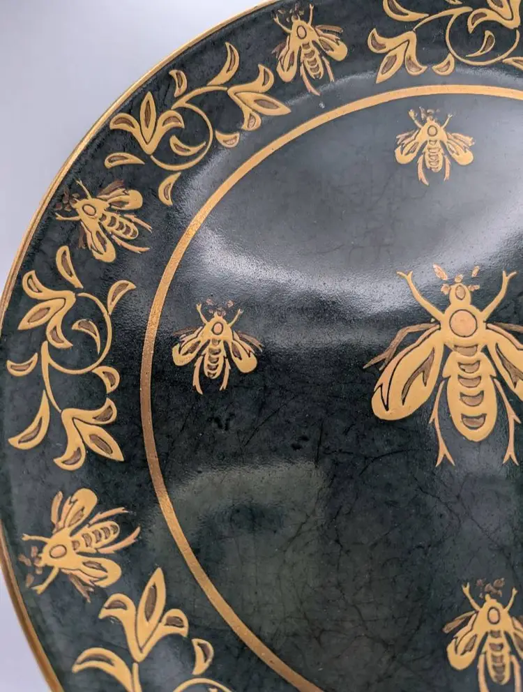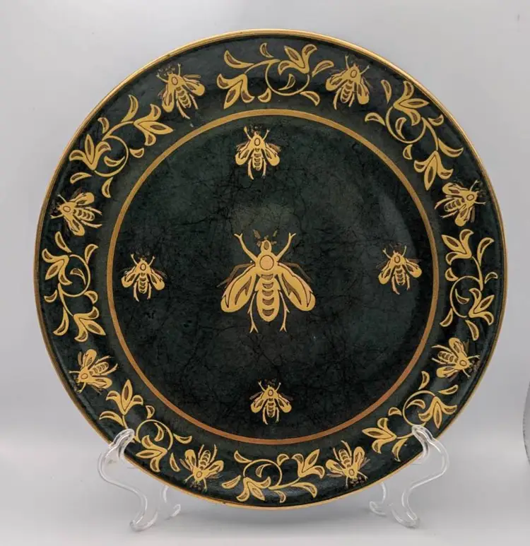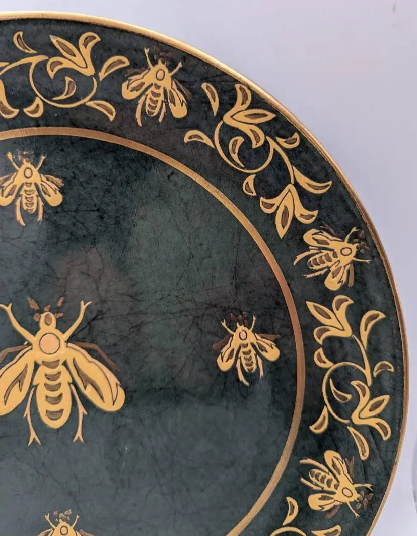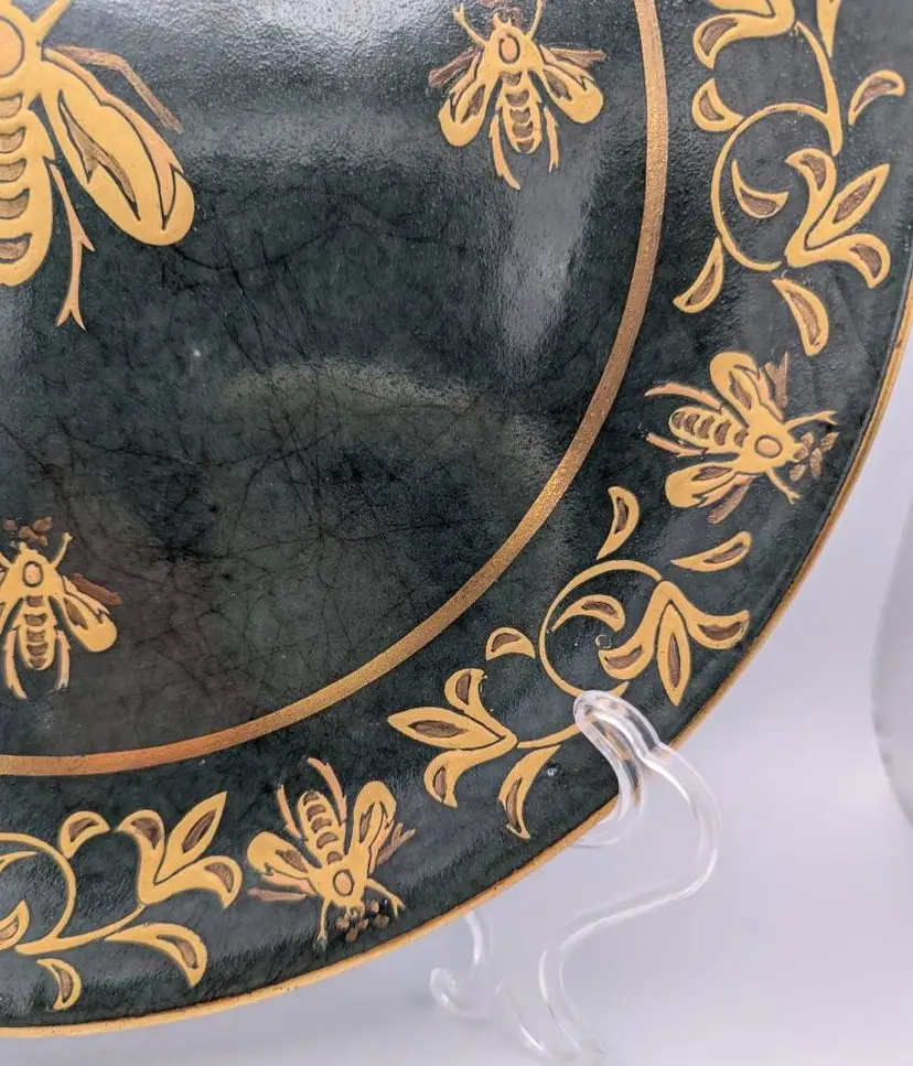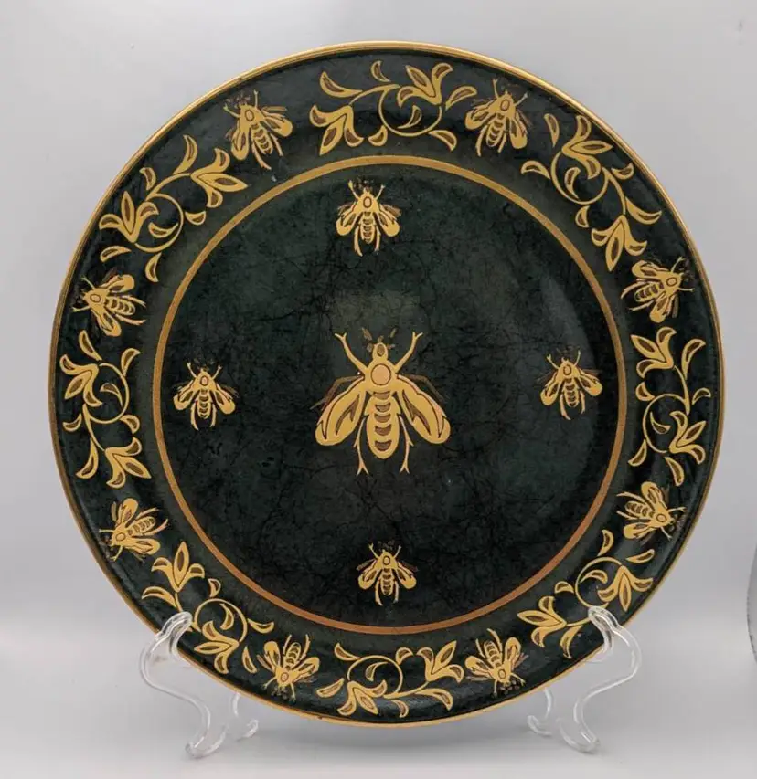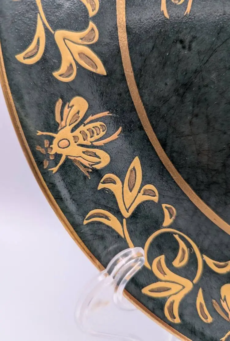 This is a Vintage Andrea By Sadek Gold Bee Plate in deep green. It is a decorative collector's item originating from China. Not for food use- but great for gallery wall The colors are bright and intact. Measures: Approx. 10 inches in diameter.