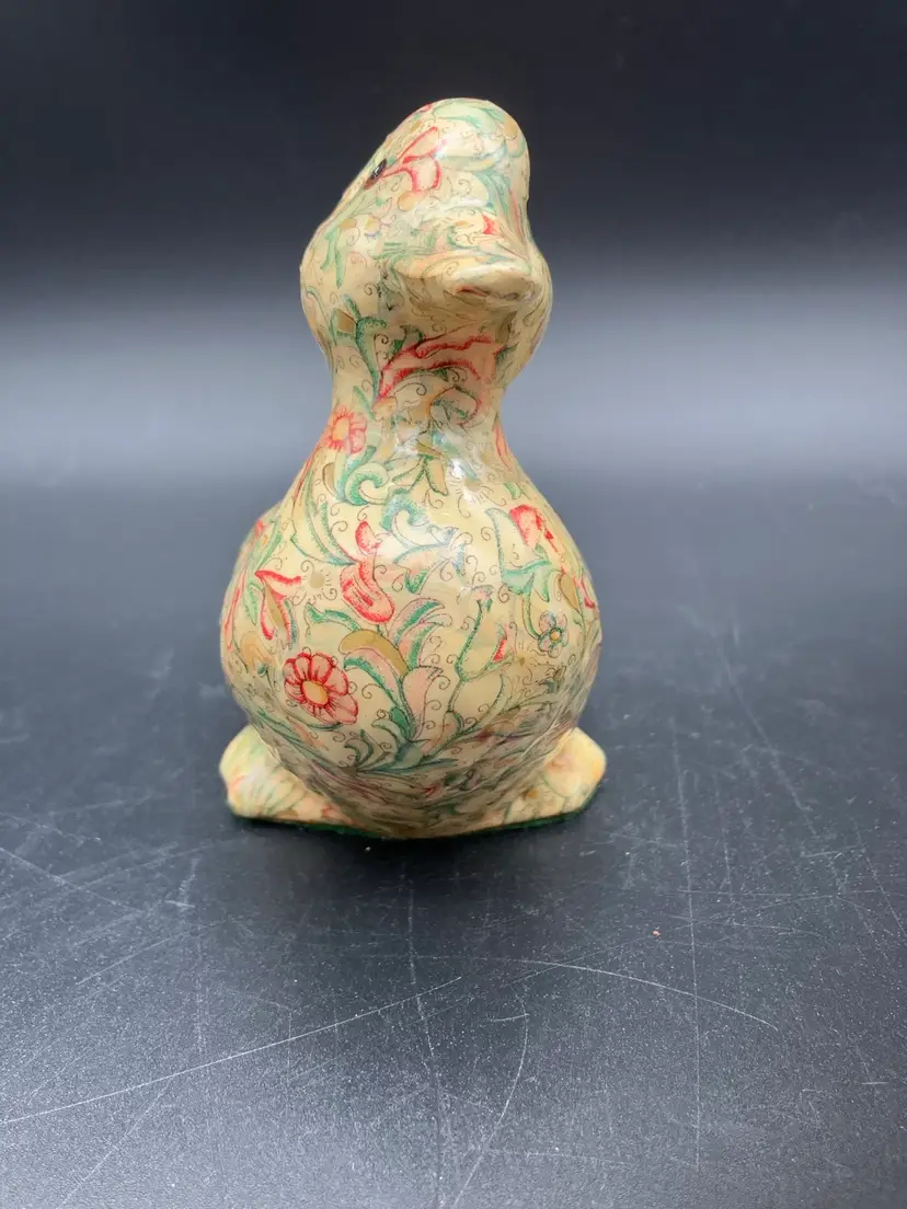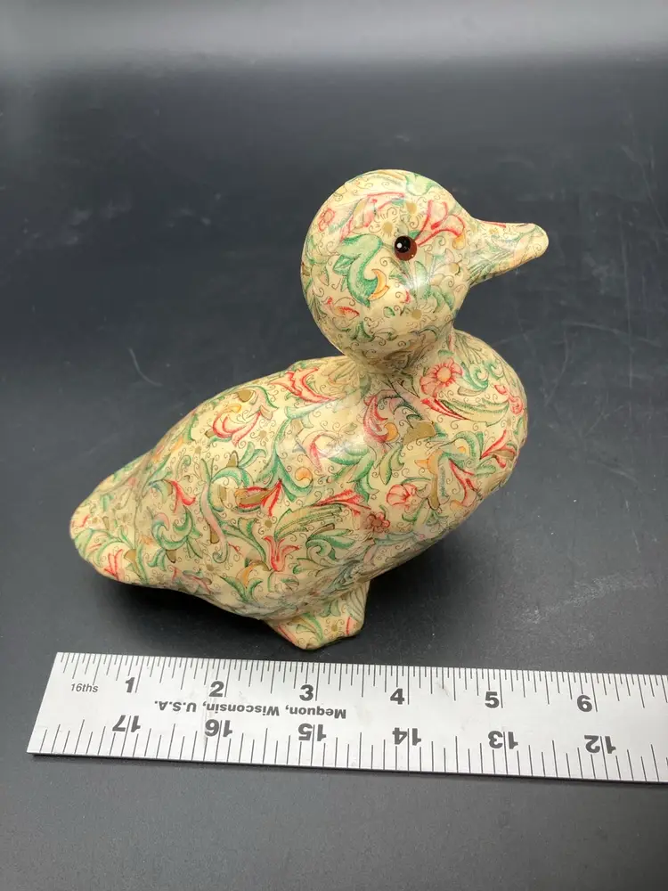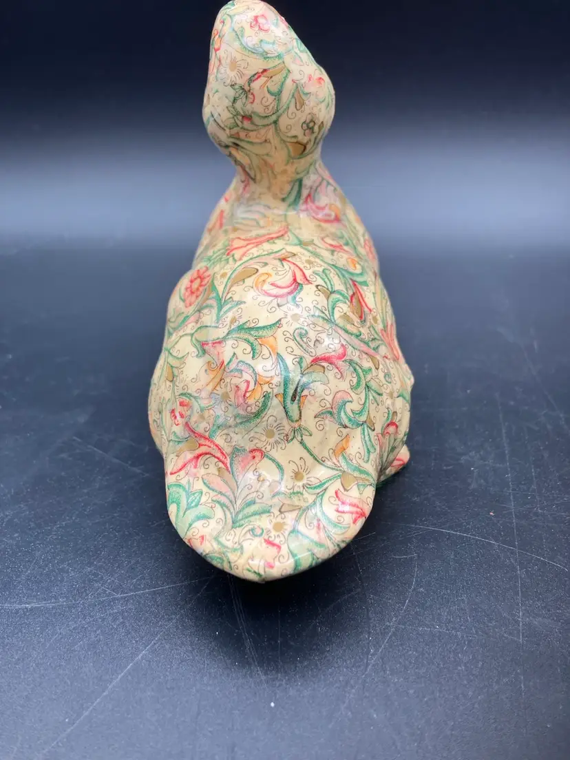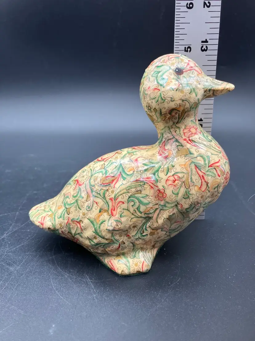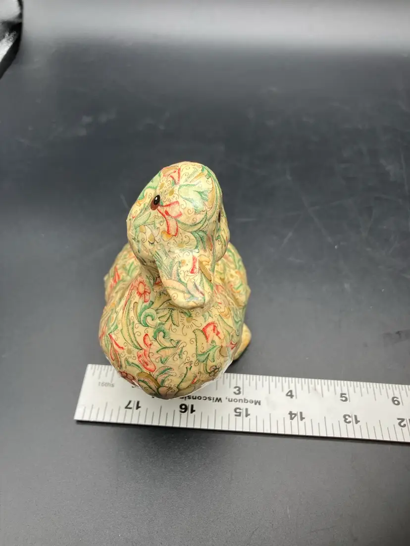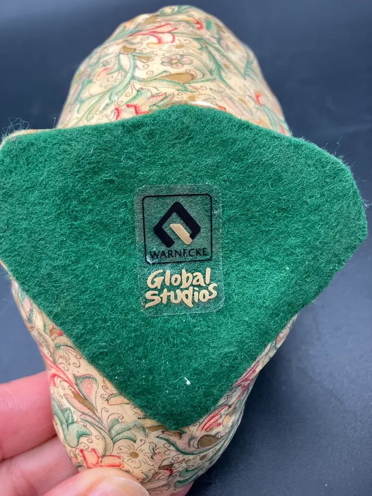 By Warnecke Global imports, measures 5.5” long by 6.5” tall by 3” wide. Seems to be ceramic with a floral pattern decoupaged on.