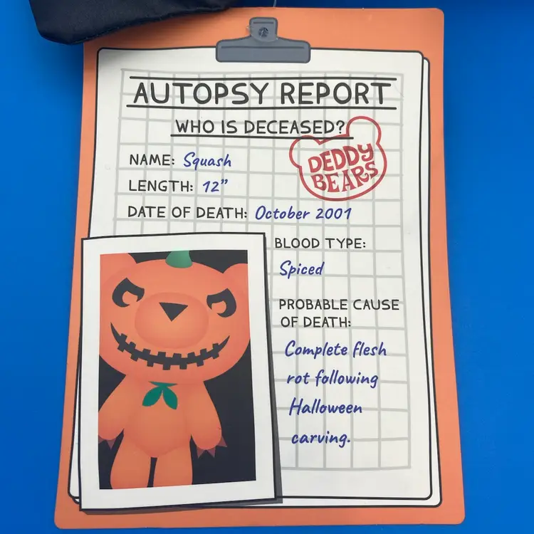 You are purchasing one 12" Squash w/ Body Bag Orange Jack-O-Lantern themed Teddy Bear Plush by License 2 Play and their Series 1 Deddy Bears Collection. This Plush is new with tags (autopsy report) and see final image to show body bag is still stitched shut halfway down.