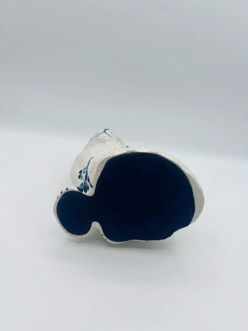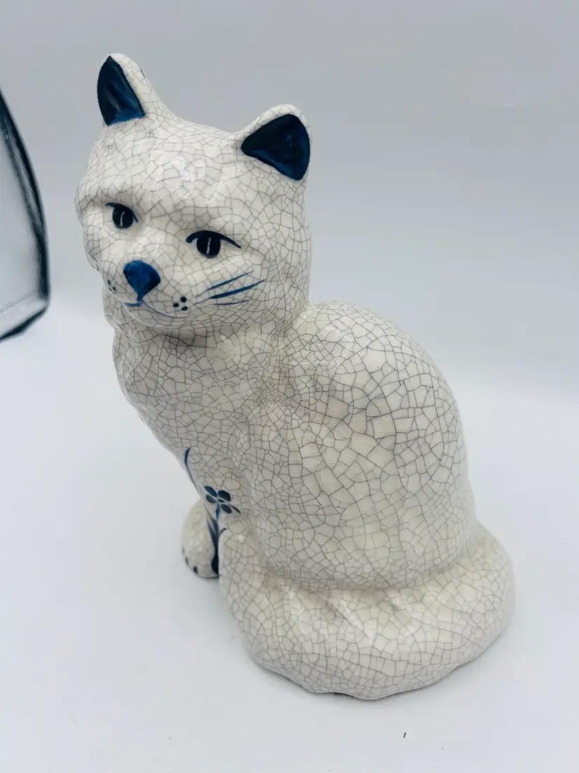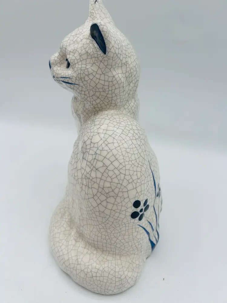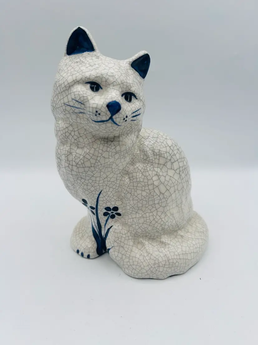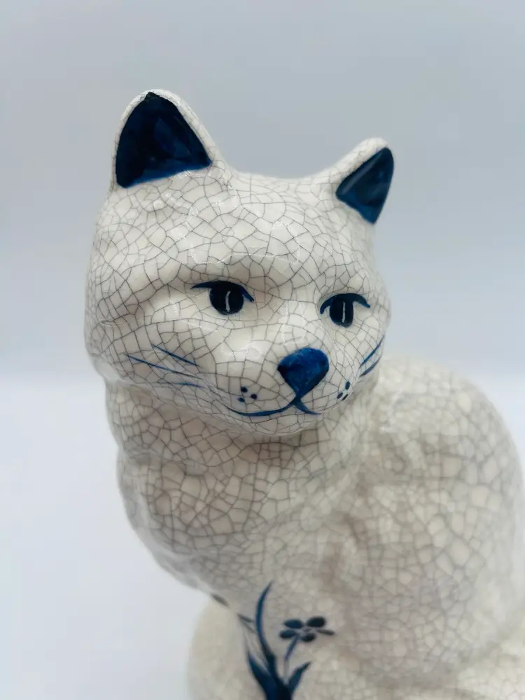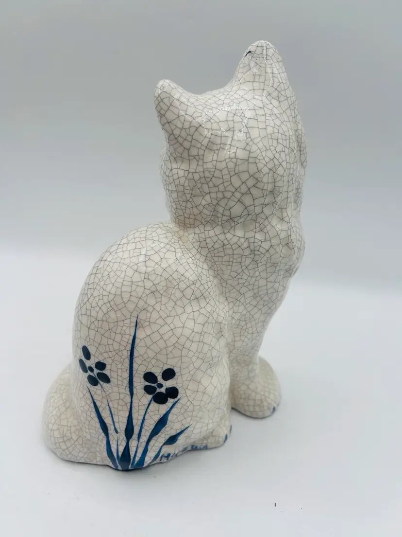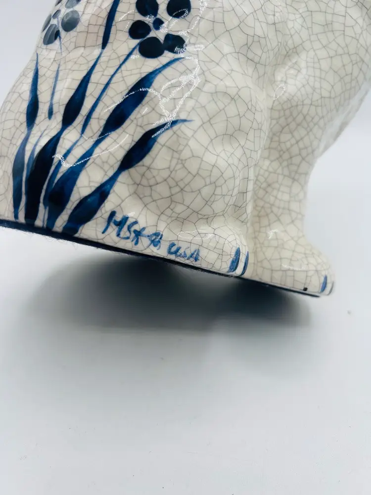 White Crackle Glaze, Cobalt Blue Accenting, 8" Tall, Blue Flowers, Hand Painted, Artist Signed