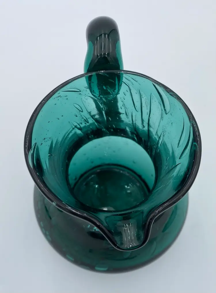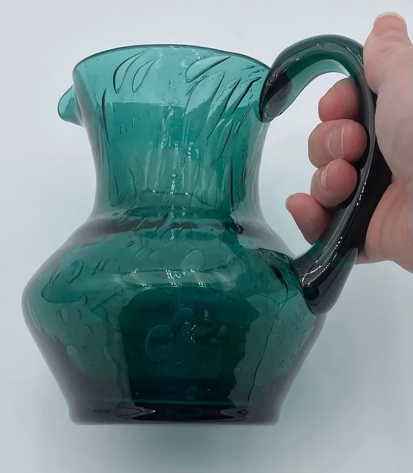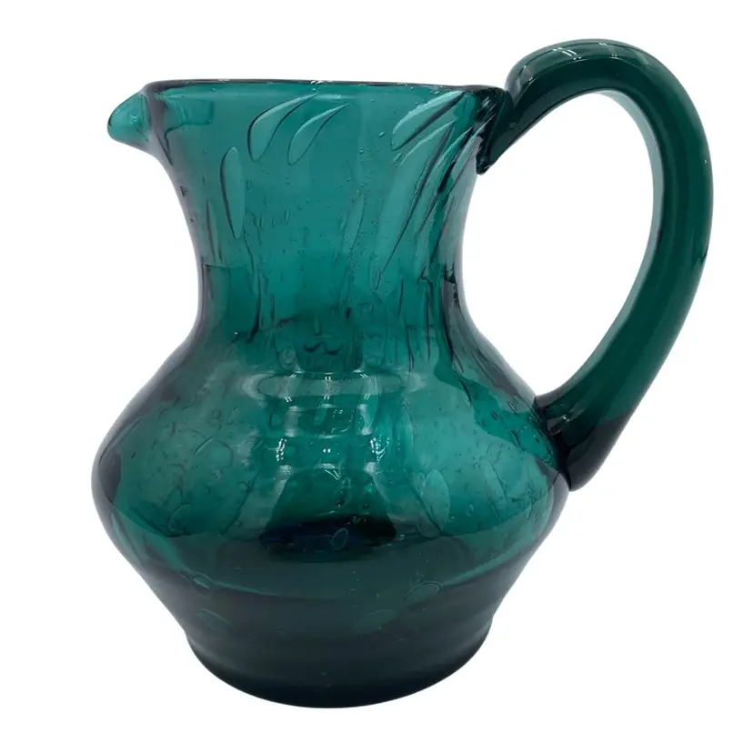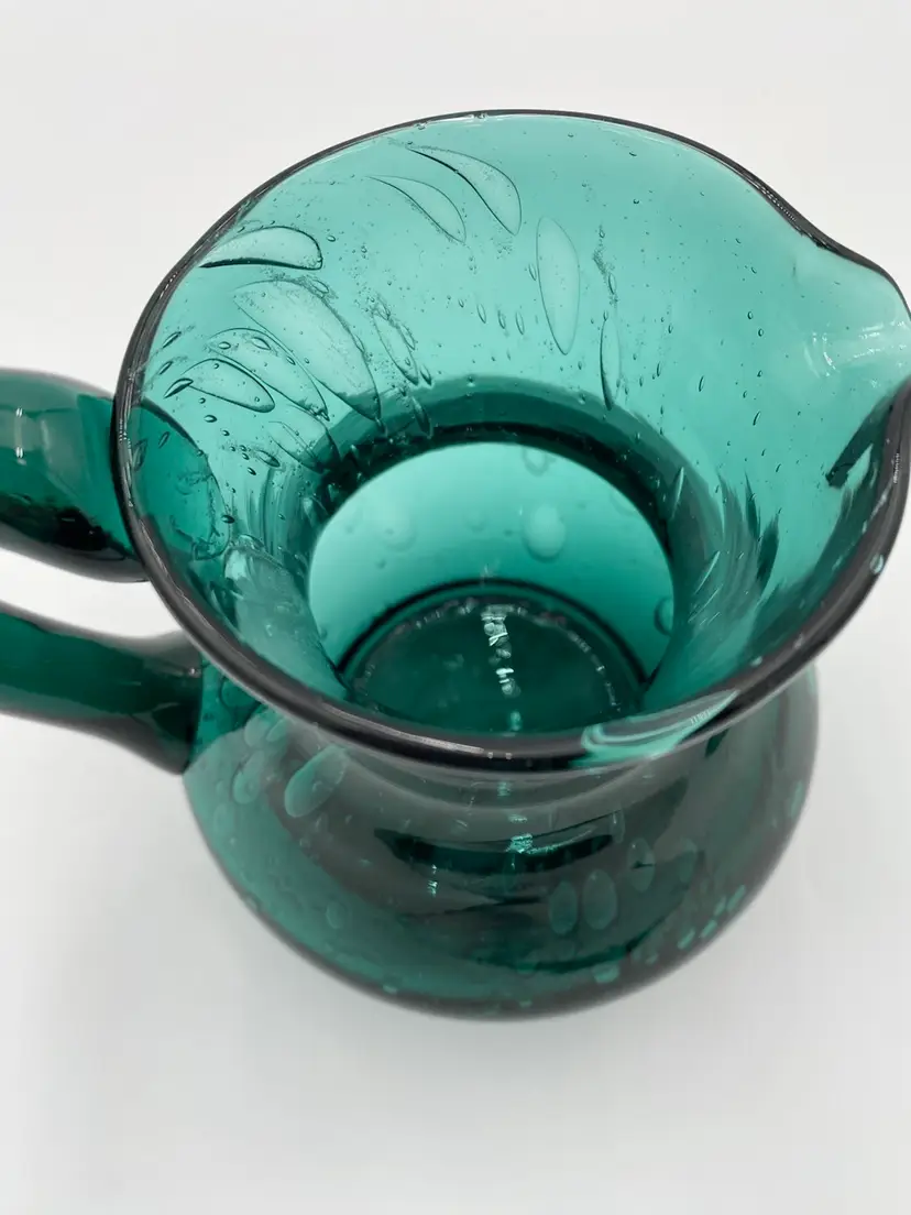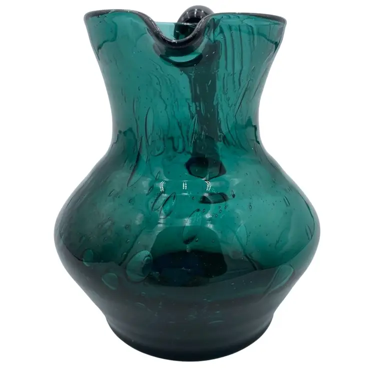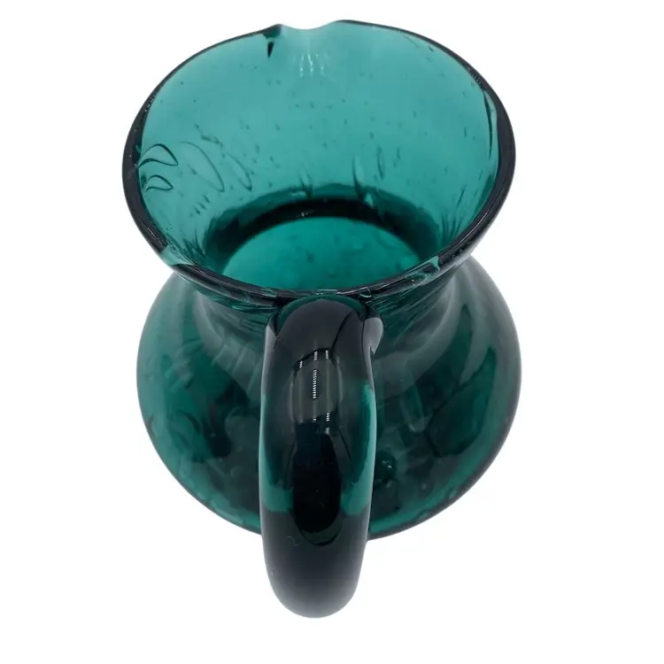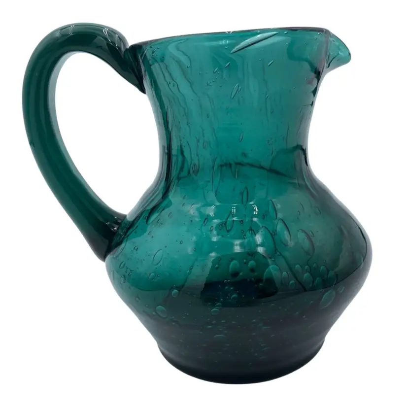 This deep teal art glass pitcher or vase is a beautiful addition to any collection. With an applied glass handle, this handmade piece stands at 6 inches tall and measures 6.4 inches in length. The glossy finish and all-over bubble pattern make it a decorative standout. The bubbles in the base of the pitcher are round, while the bubbles elongate as you go up the pitcher. It creates an interesting and eye-catching pattern! Crafted using hand blown glass technique, this piece weighs 1 pound and 13.7 ounces, and measures 5 inches in width. Perfect for any era, this pitcher is a beautiful and timeless piece of art glass. It could easily be used as a vase.