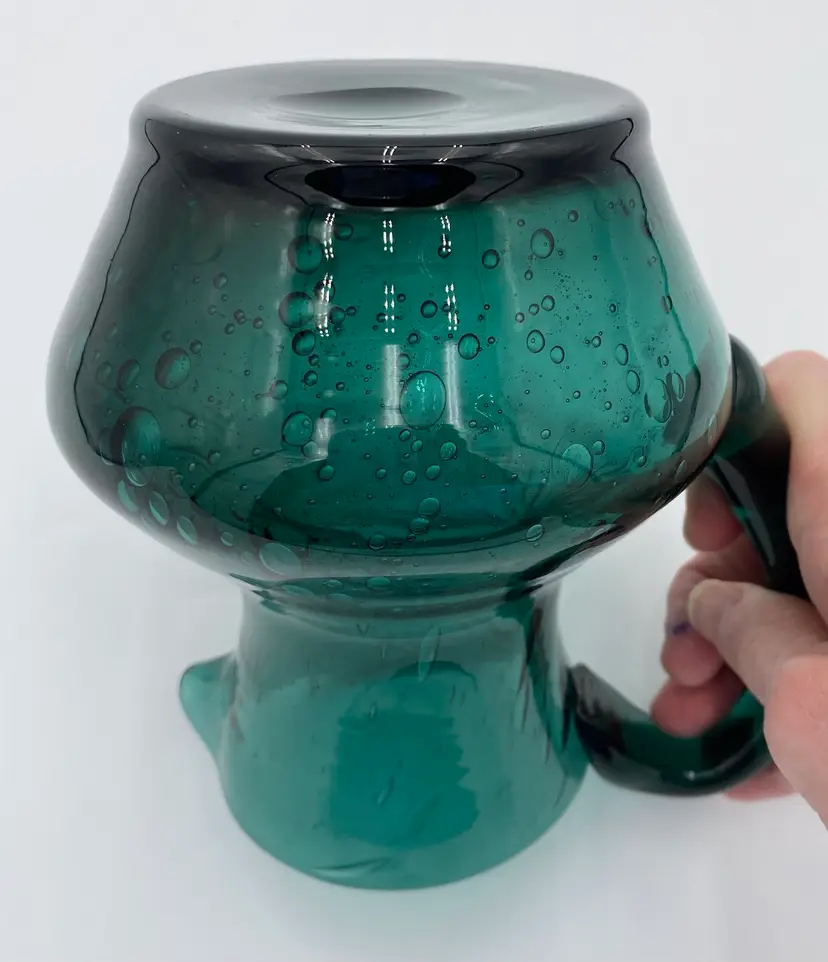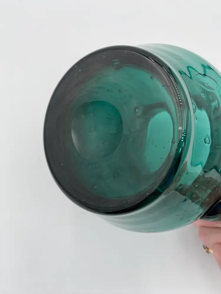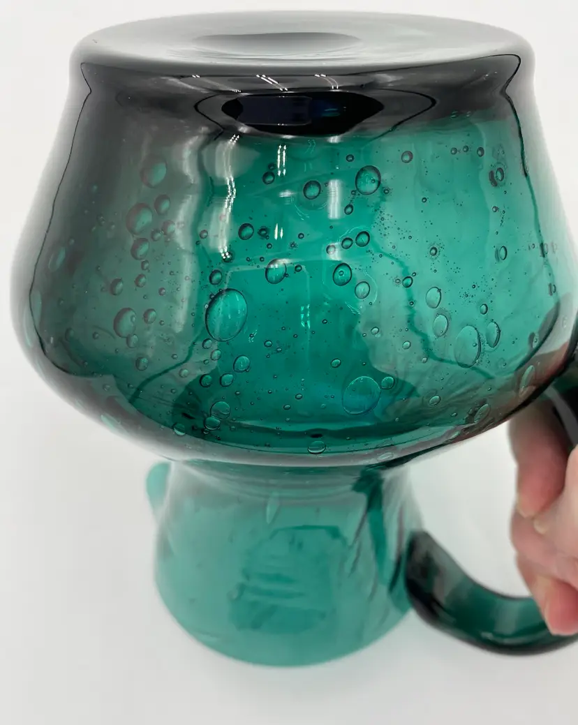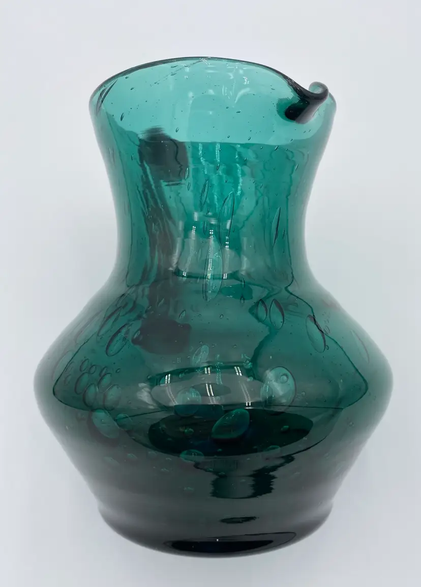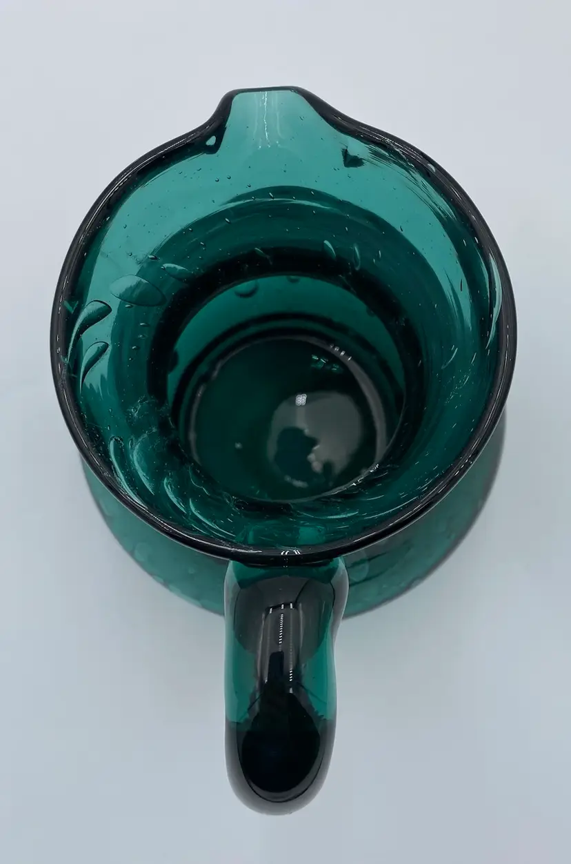 This deep teal art glass pitcher or vase is a beautiful addition to any collection. With an applied glass handle, this handmade piece stands at 6 inches tall and measures 6.4 inches in length. The glossy finish and all-over bubble pattern make it a decorative standout. The bubbles in the base of the pitcher are round, while the bubbles elongate as you go up the pitcher. It creates an interesting and eye-catching pattern! Crafted using hand blown glass technique, this piece weighs 1 pound and 13.7 ounces, and measures 5 inches in width. Perfect for any era, this pitcher is a beautiful and timeless piece of art glass. It could easily be used as a vase.