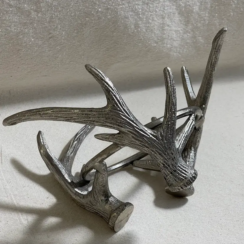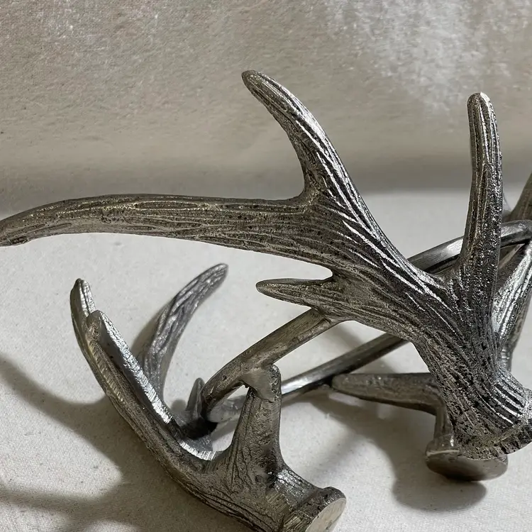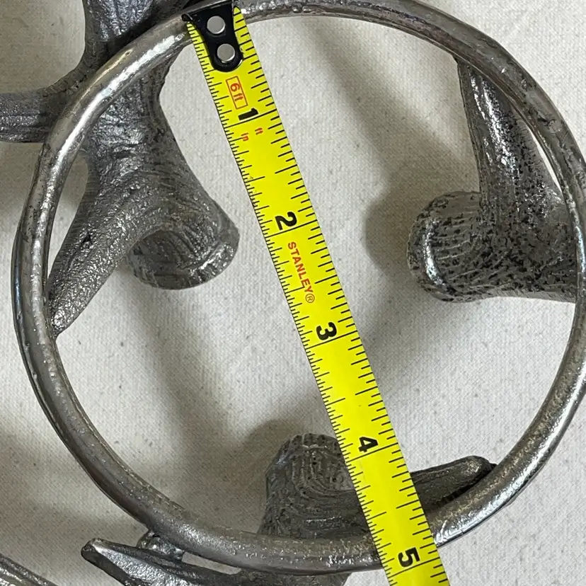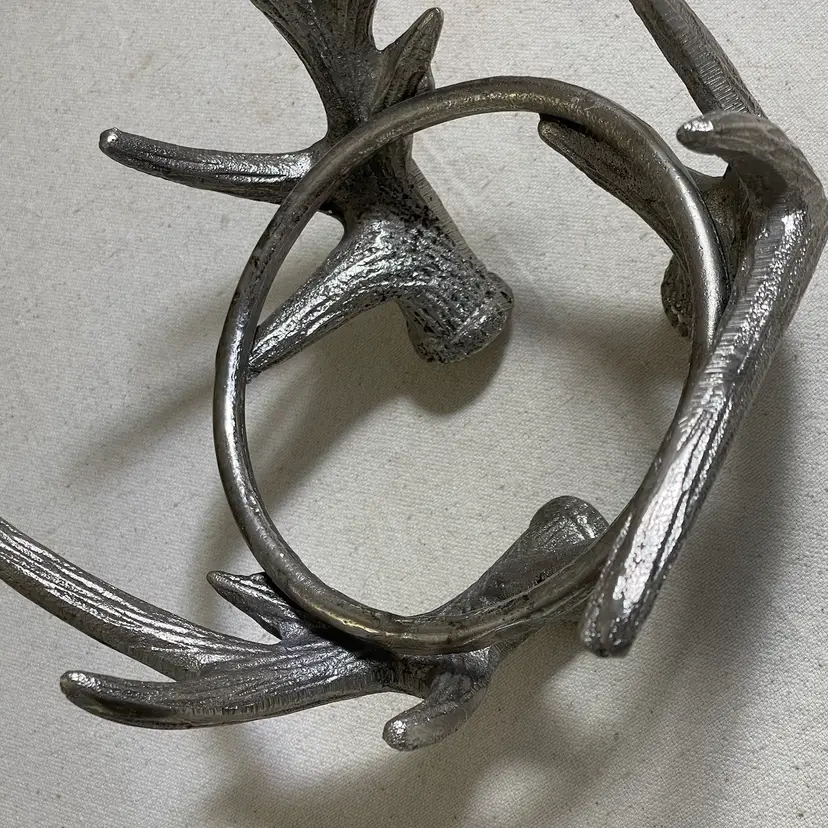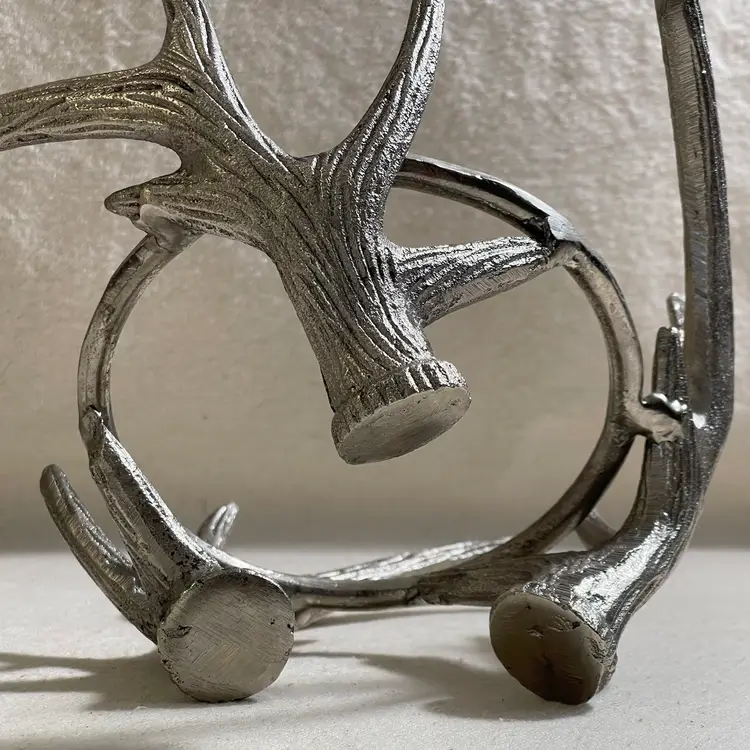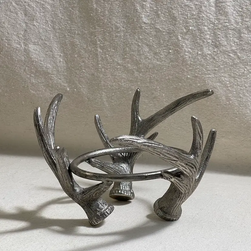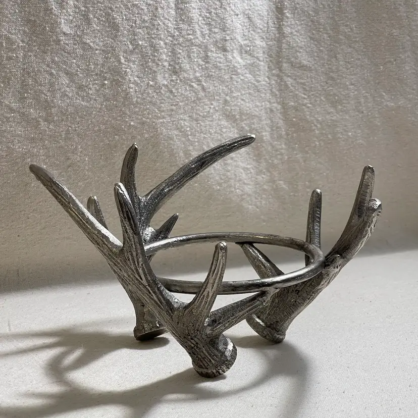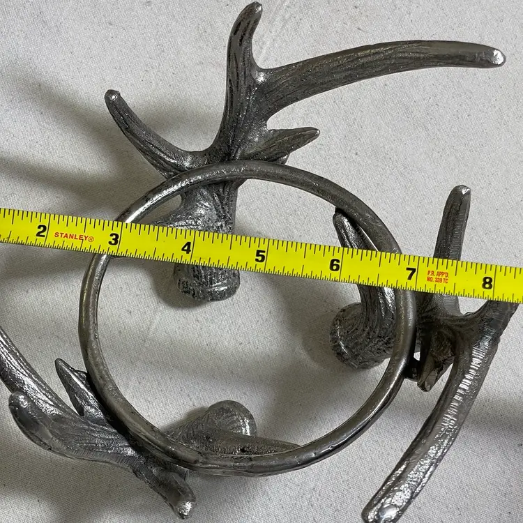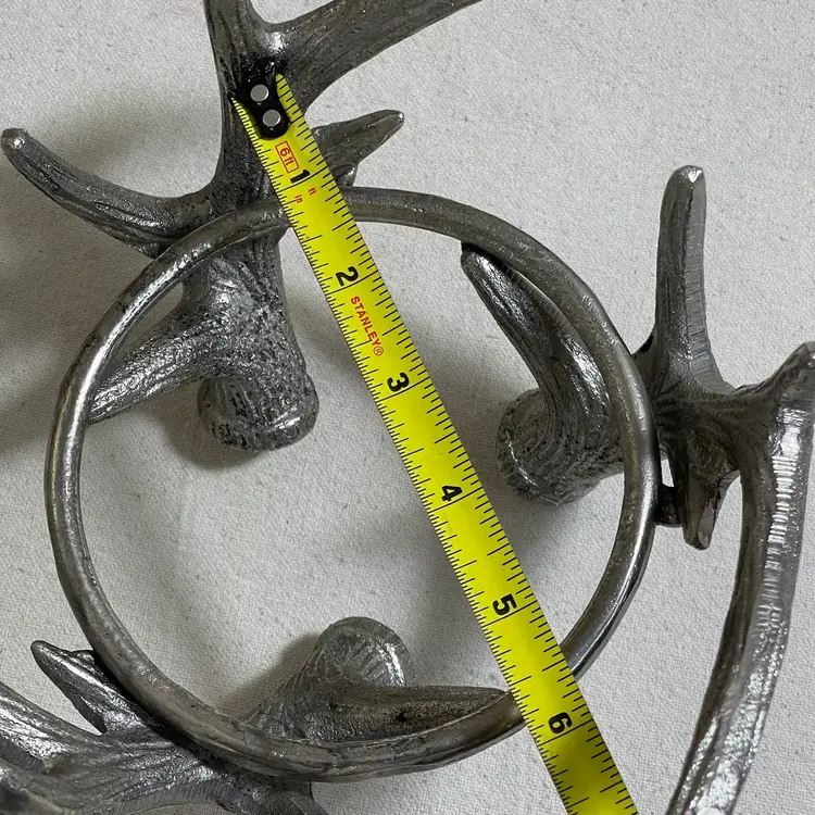 Add some rustic charm to your man cave or cabin with this Deer Antler Dish -Candle -Bowl -Holder. Crafted from metal with a textured finish, this lodge-style candle holder features a stunning antler design that is perfect for any outdoorsman or collector. Measuring 4.5 inches in height and 8.5 inches in width, this candle holder is the ideal size for any candle or bowl. The silver color adds a touch of elegance to your decor and makes it a great addition to your collectibles or decorative collectibles.