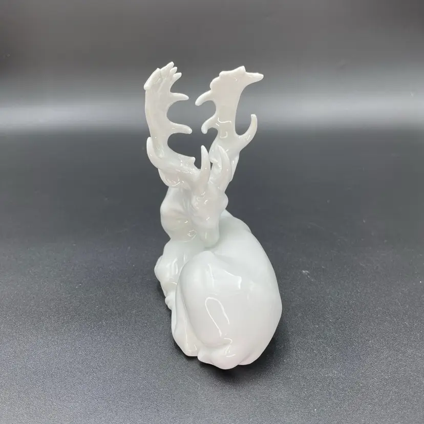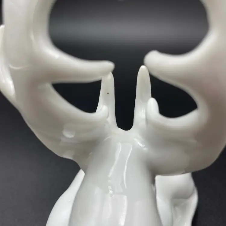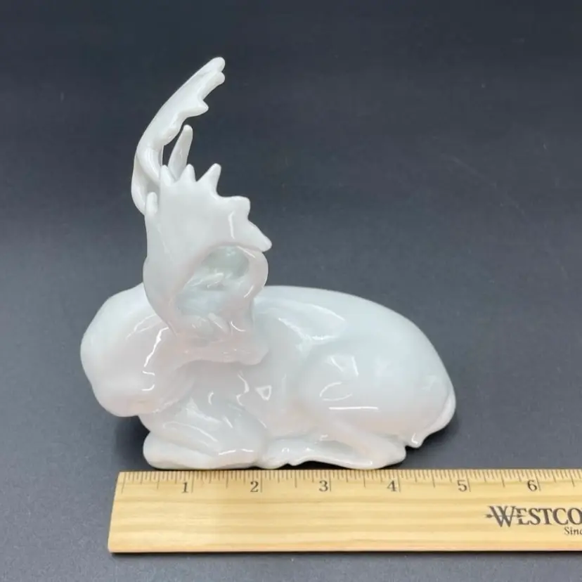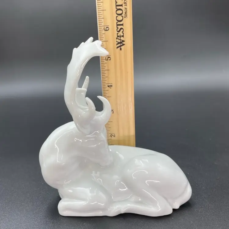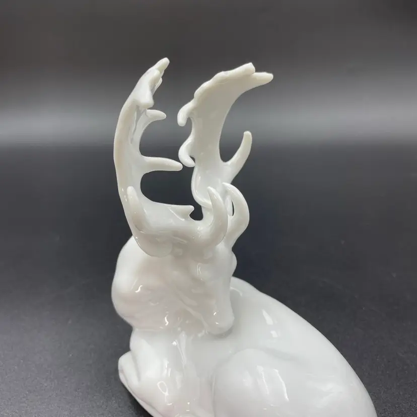 This is a vintage white porcelain laying buck/deer figurine. Made in Taiwan. Measures approximately 5" long x 2.5" wide x 5.5" tall. No chips or cracks.