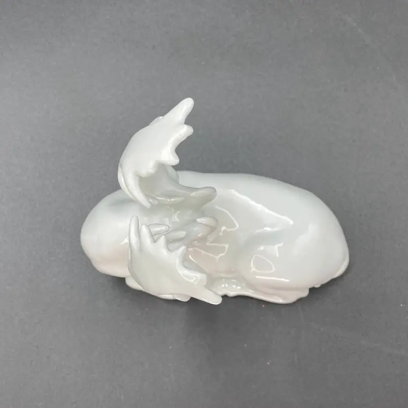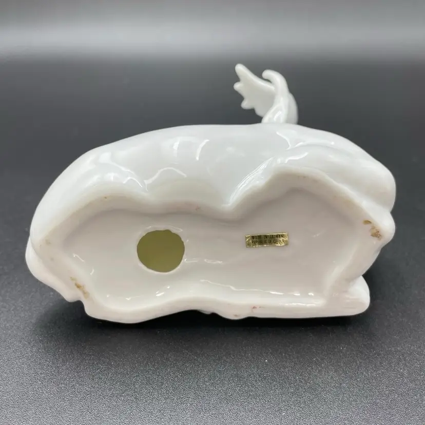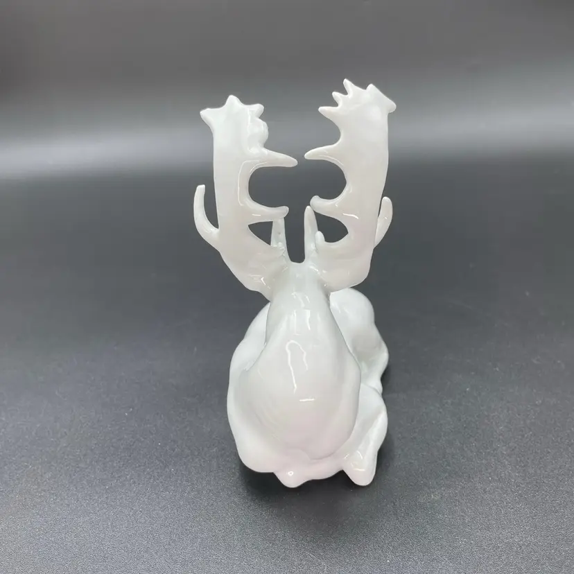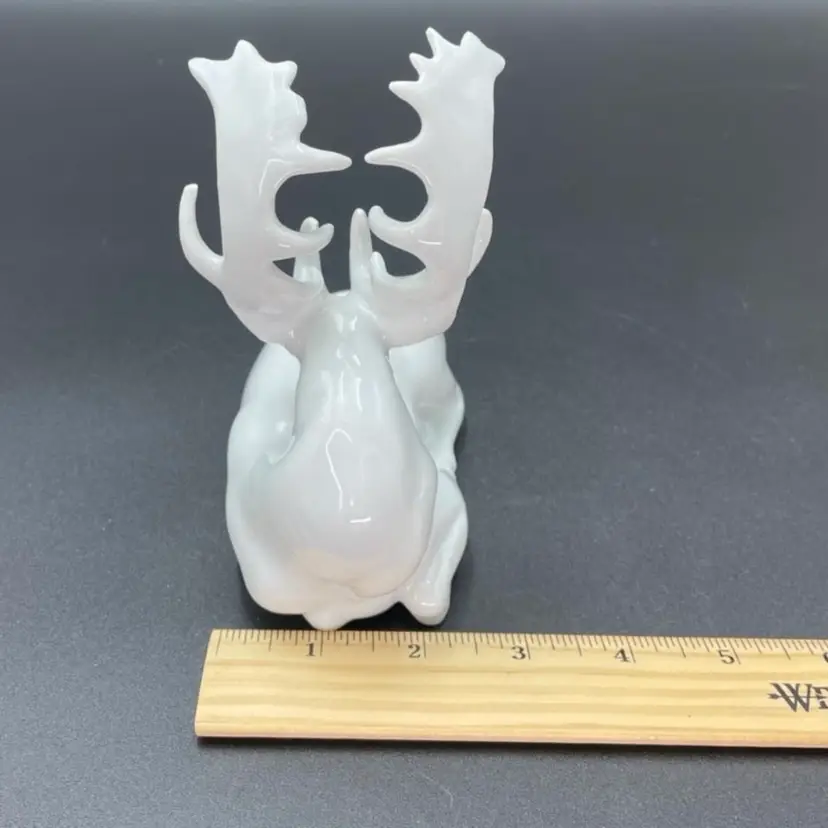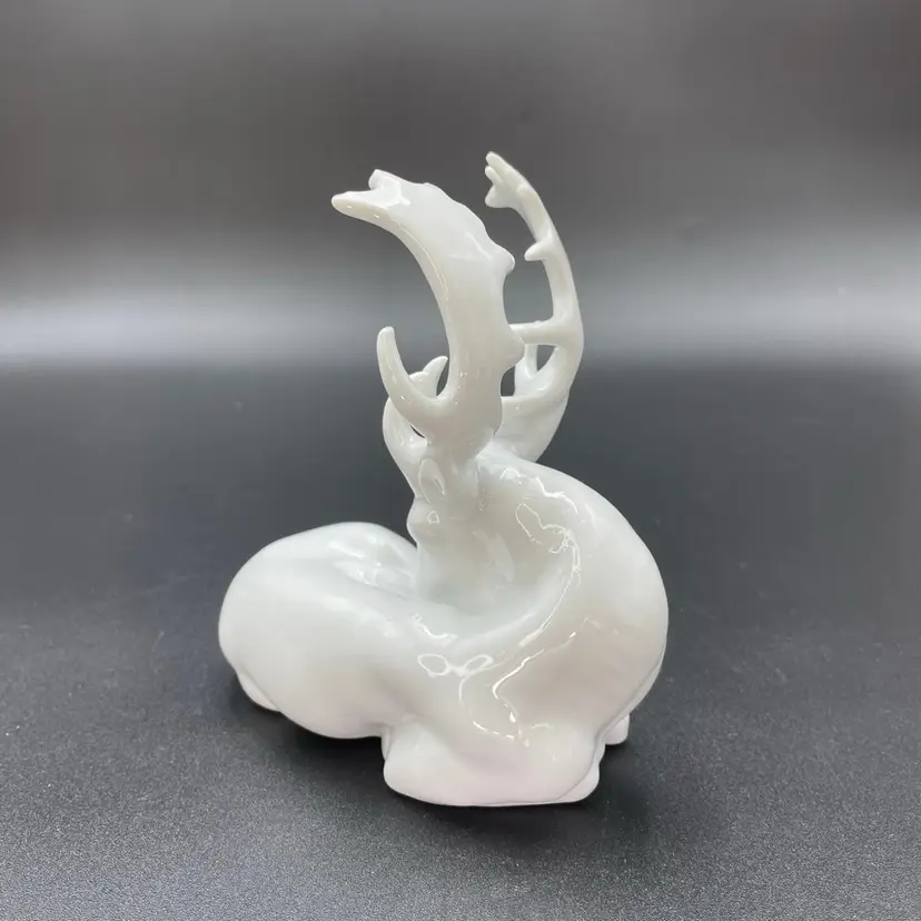 This is a vintage white porcelain laying buck/deer figurine. Made in Taiwan. Measures approximately 5" long x 2.5" wide x 5.5" tall. No chips or cracks.