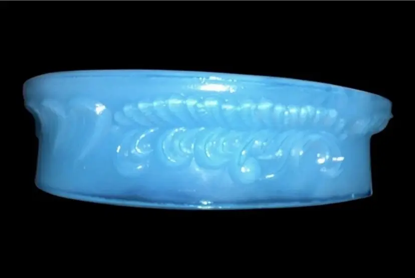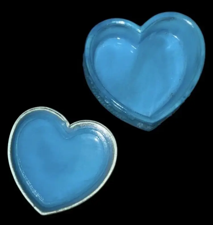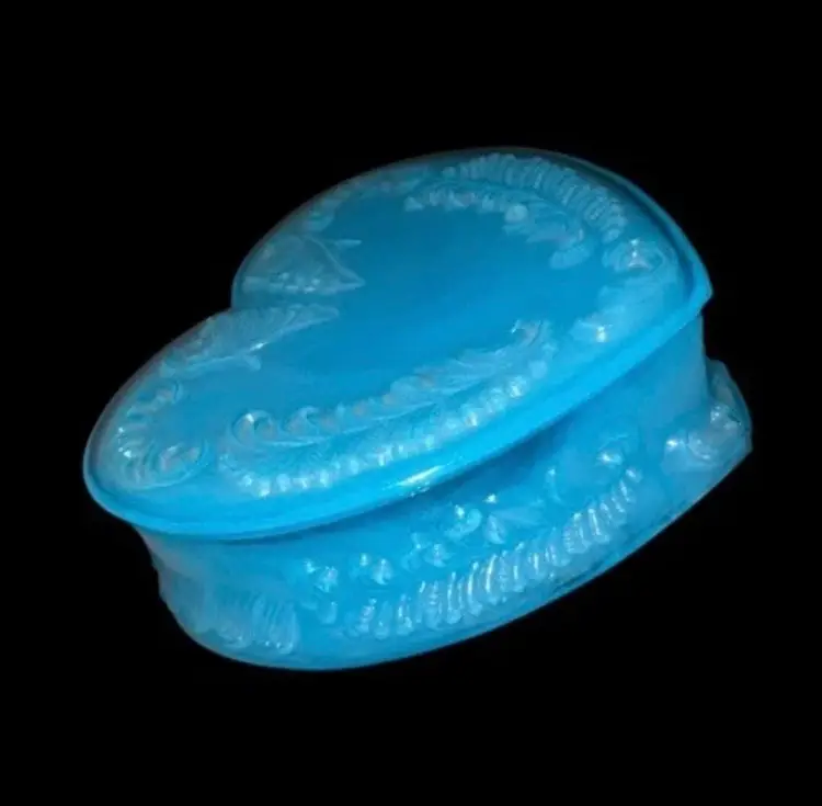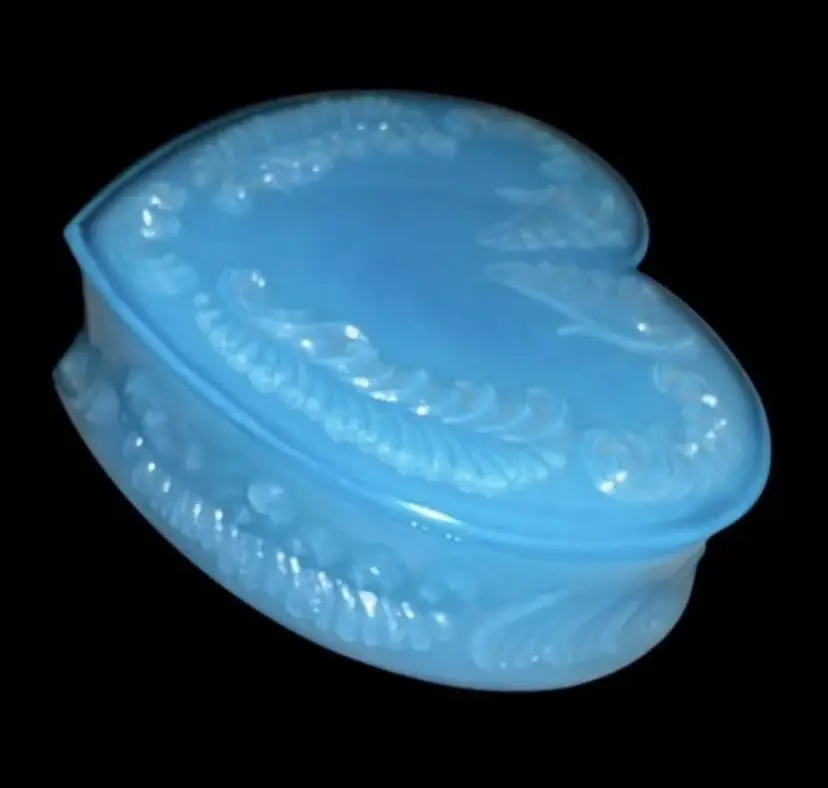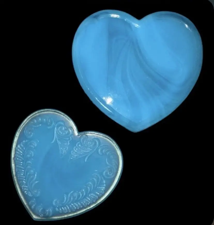 This vintage Degenhart Glass blue slag art glass heart-shaped jewelry/trinket box is a beautiful and contemporary decorative piece. With a glossy finish and a heart-shaped design, this one compartment box features a removable lid and is made of glass. Excellent used condition! Measurements: 3.5” x 3.5” x 1 1/8” tall