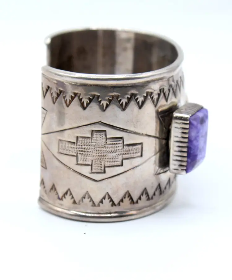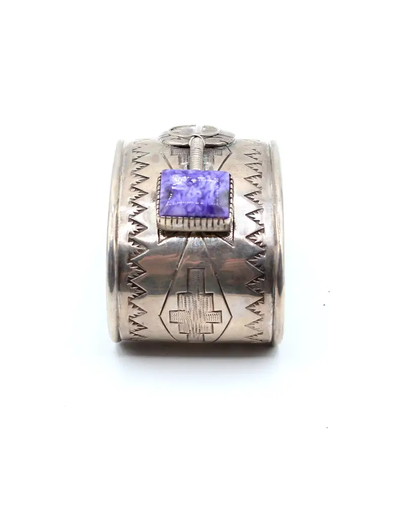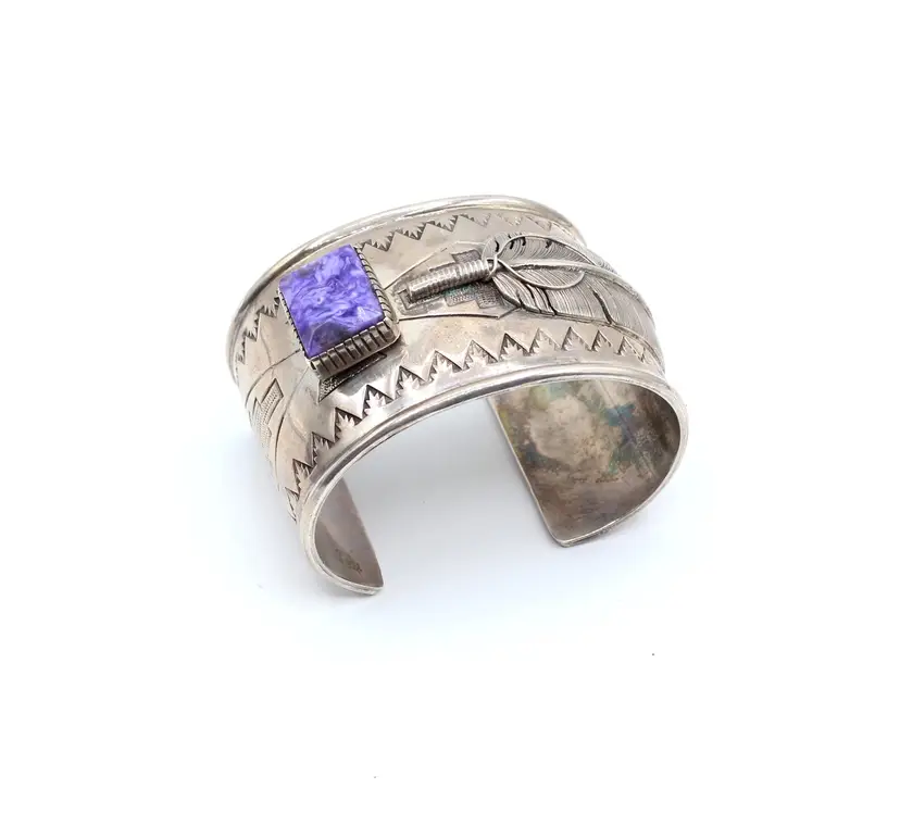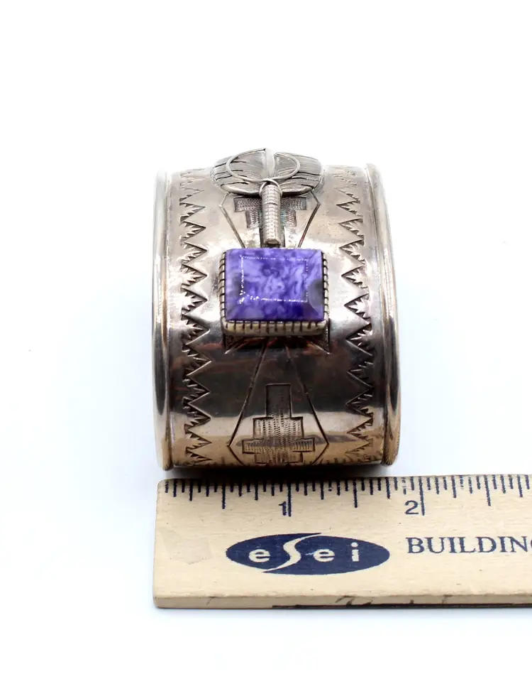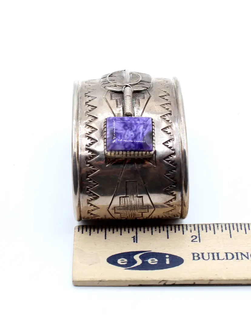 Award winner Delbert Vandever Navajo. Stunning hand stamped tepee edge and southwest motif design, leaf accent and a Charoite square stone in a hand cut bezel. Stamped with Delbert Vandever with the hat pico over his name. Inner diameter 5.5", gap 1.25", 1.75" wide.